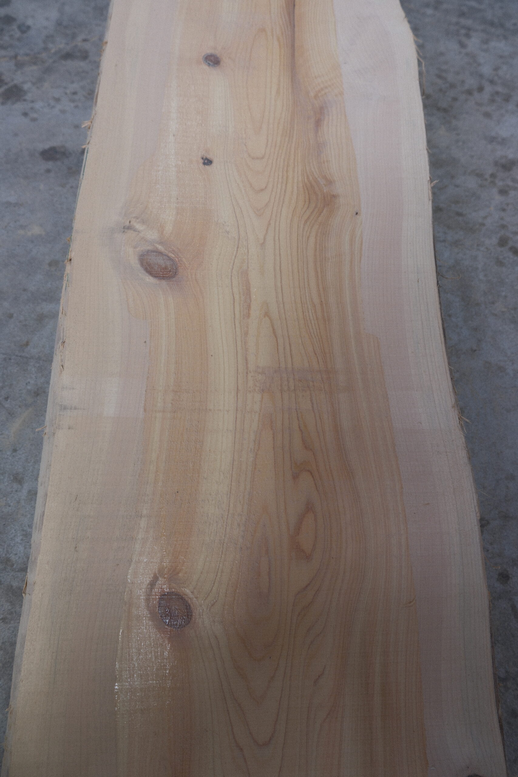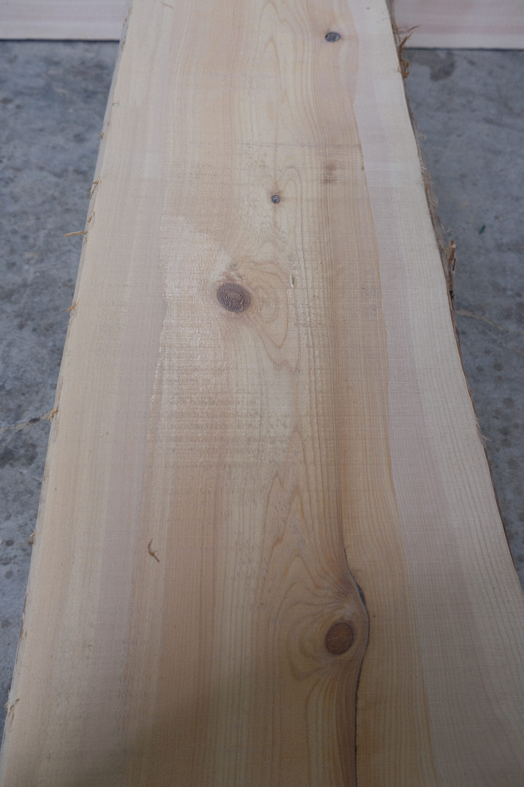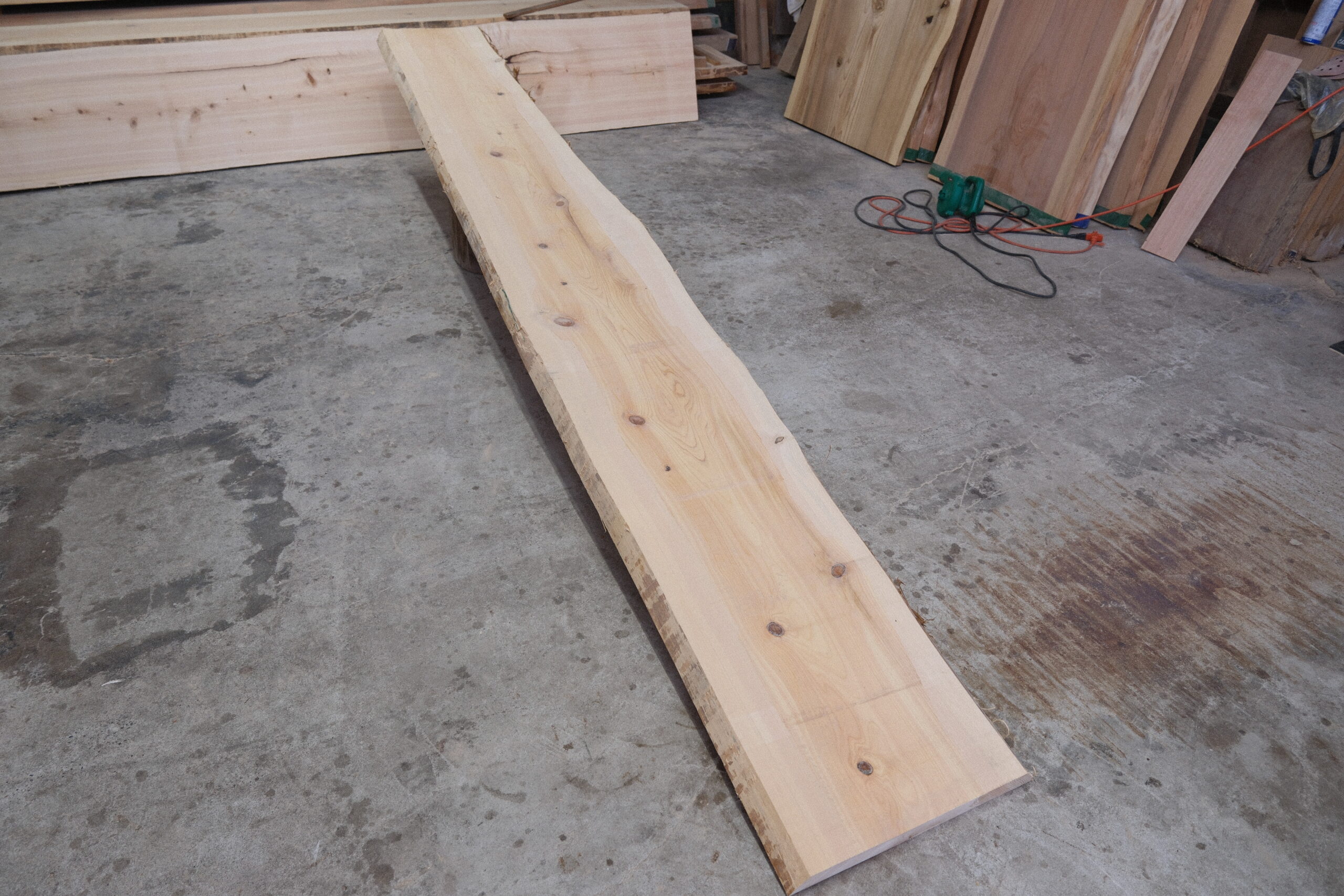 ヒノキ一枚板です。小さな生節が付いています。ヒノキの香りがたまりません。カンナを掛けをすると尚一層良い香りがします。赤身はピンク色です。幅も広い所で400㎜以上ありますので片耳をカットしてキッチンカウンター等にいかがでしょうか。プレーナー掛け、オイル塗装をすると素晴らしくなります。