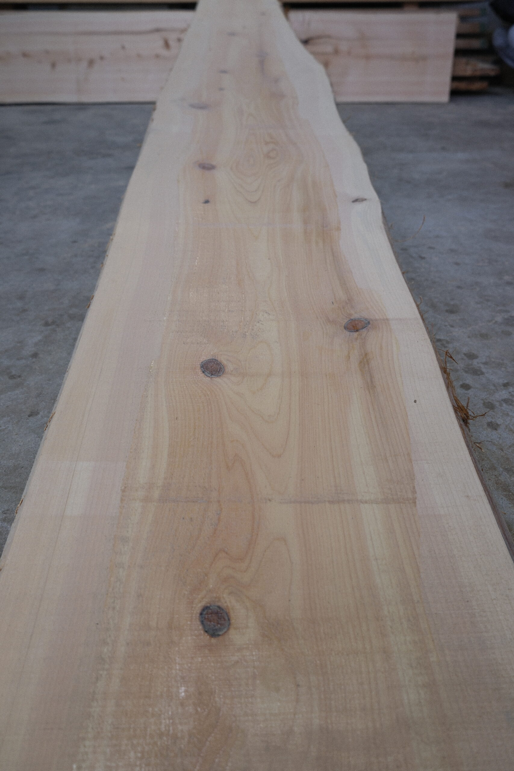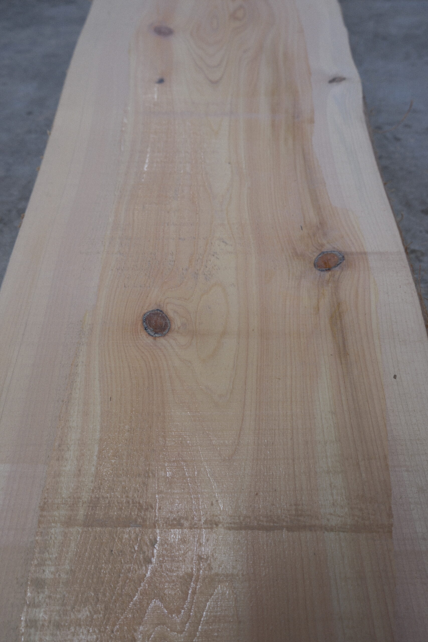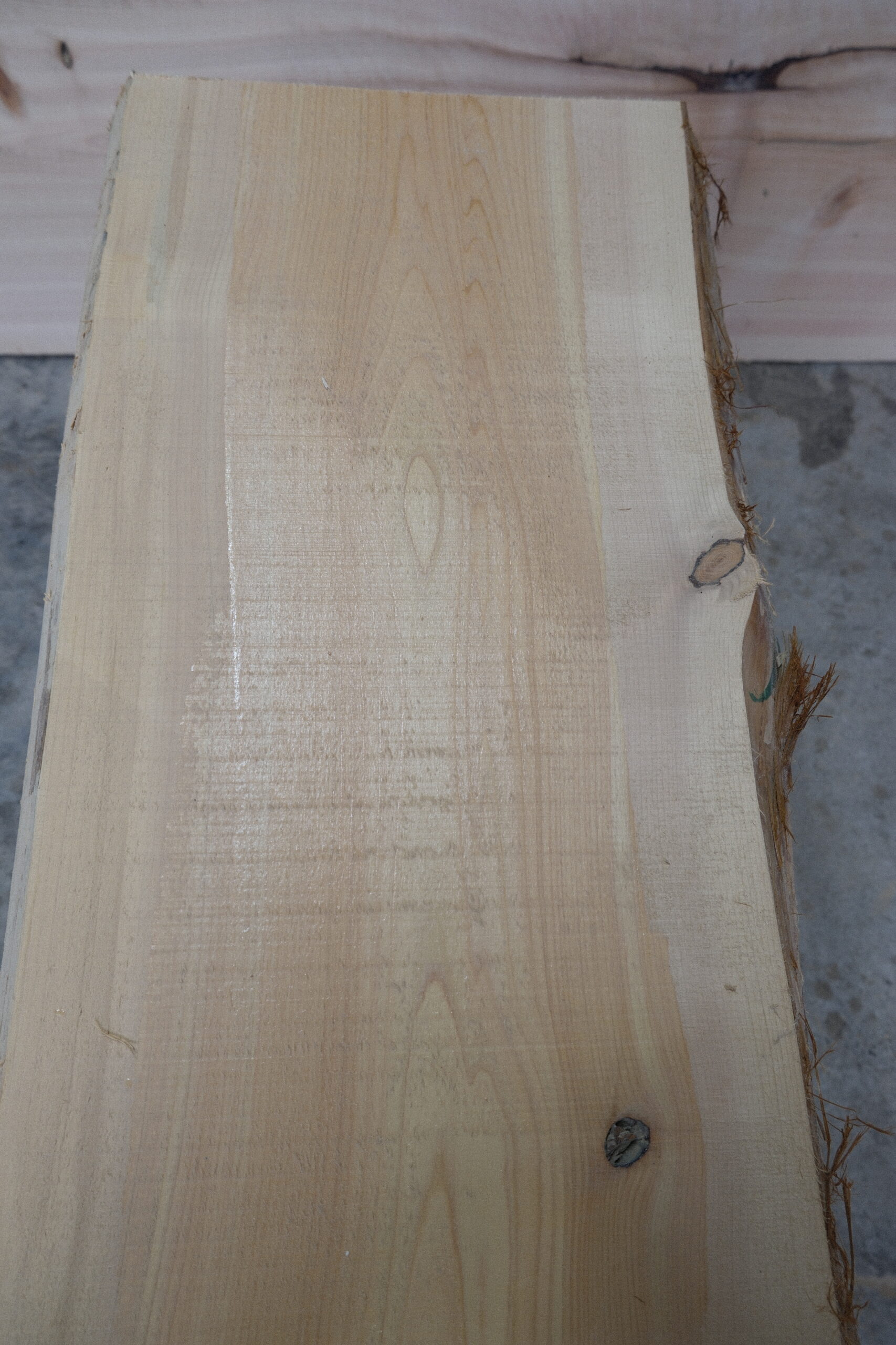 ヒノキ一枚板です。小さな生節が付いています。ヒノキの香りがたまりません。カンナを掛けをすると尚一層良い香りがします。赤身はピンク色です。幅も広い所で400㎜以上ありますので片耳をカットしてキッチンカウンター等にいかがでしょうか。プレーナー掛け、オイル塗装をすると素晴らしくなります。