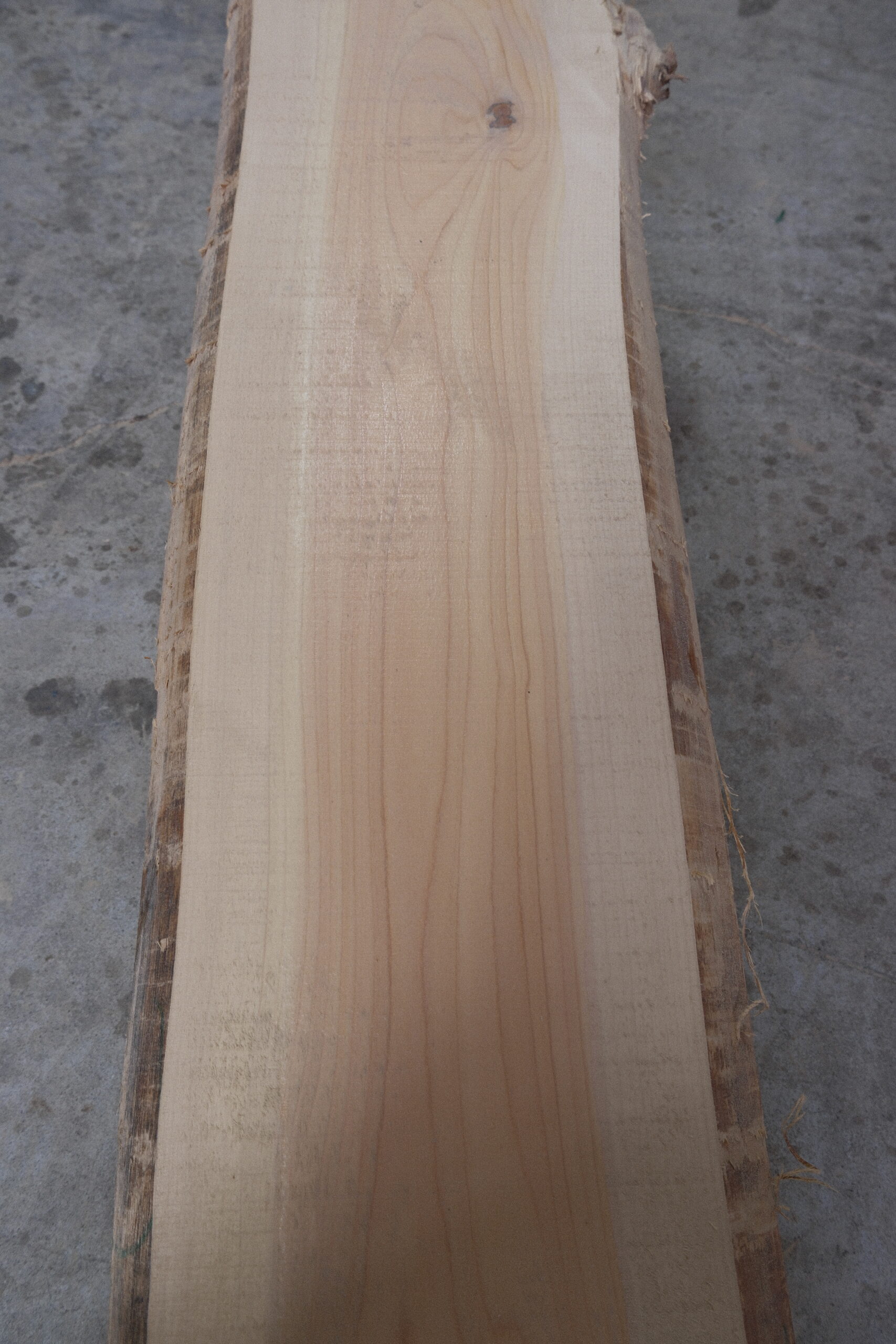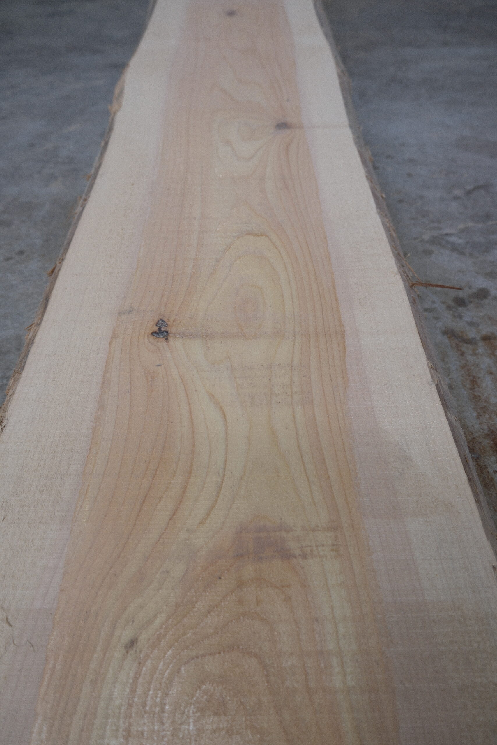 ヒノキ一枚板です。小さな生節が付いています。ヒノキの香りがたまりません。カンナを掛けをすると尚一層良い香りがします。赤身はピンク色です。幅も広い所で400㎜ありますので片耳をカットしてキッチンカウンター等にいかがでしょうか。プレーナー掛け、オイル塗装をすると素晴らしくなります。