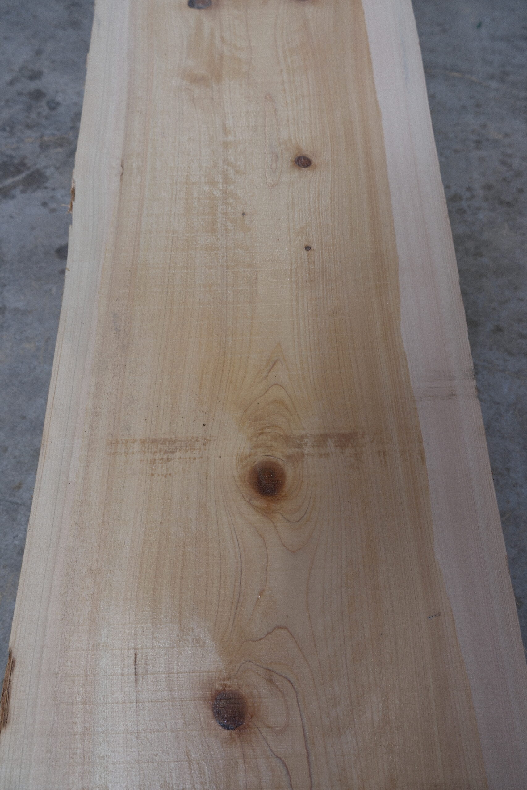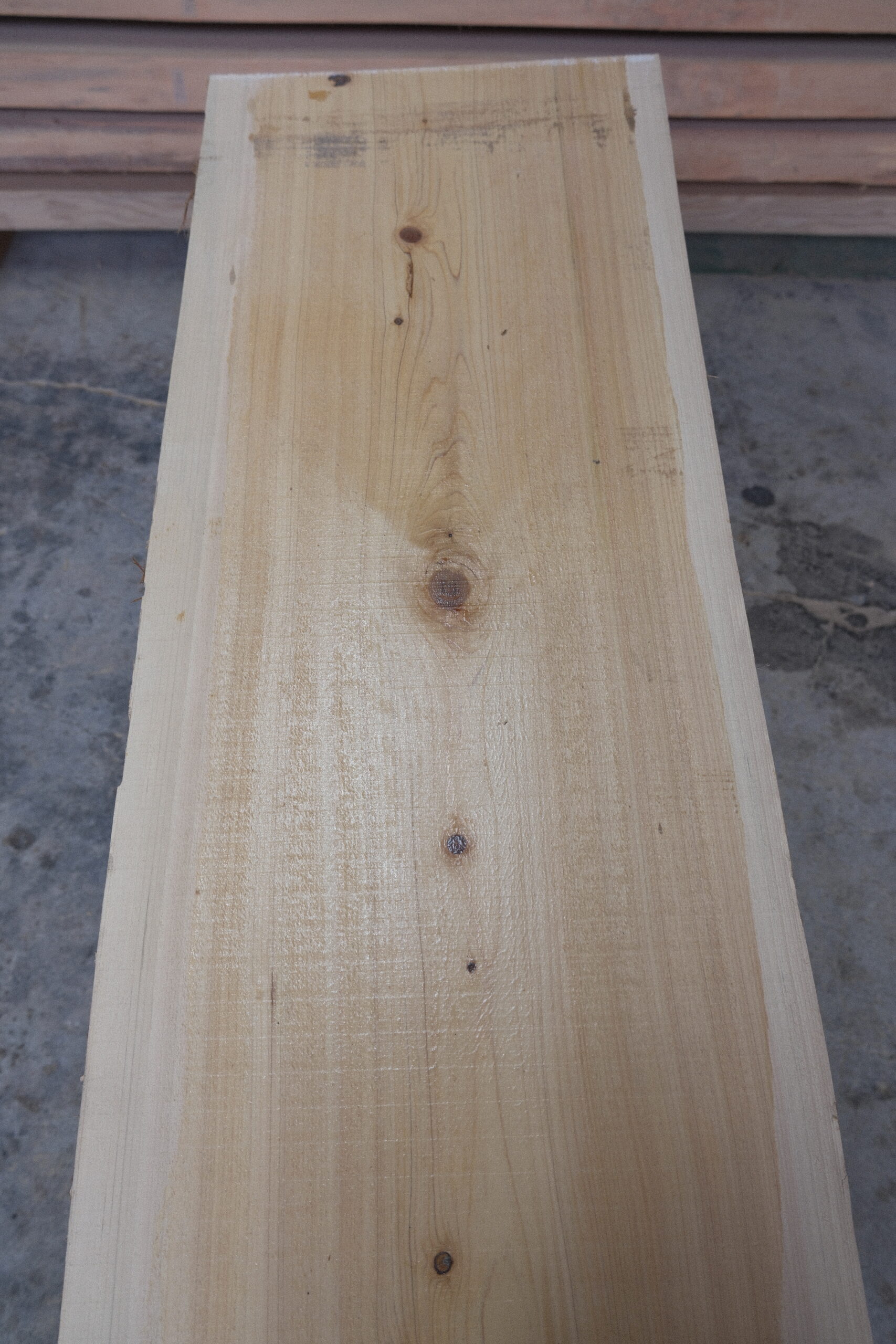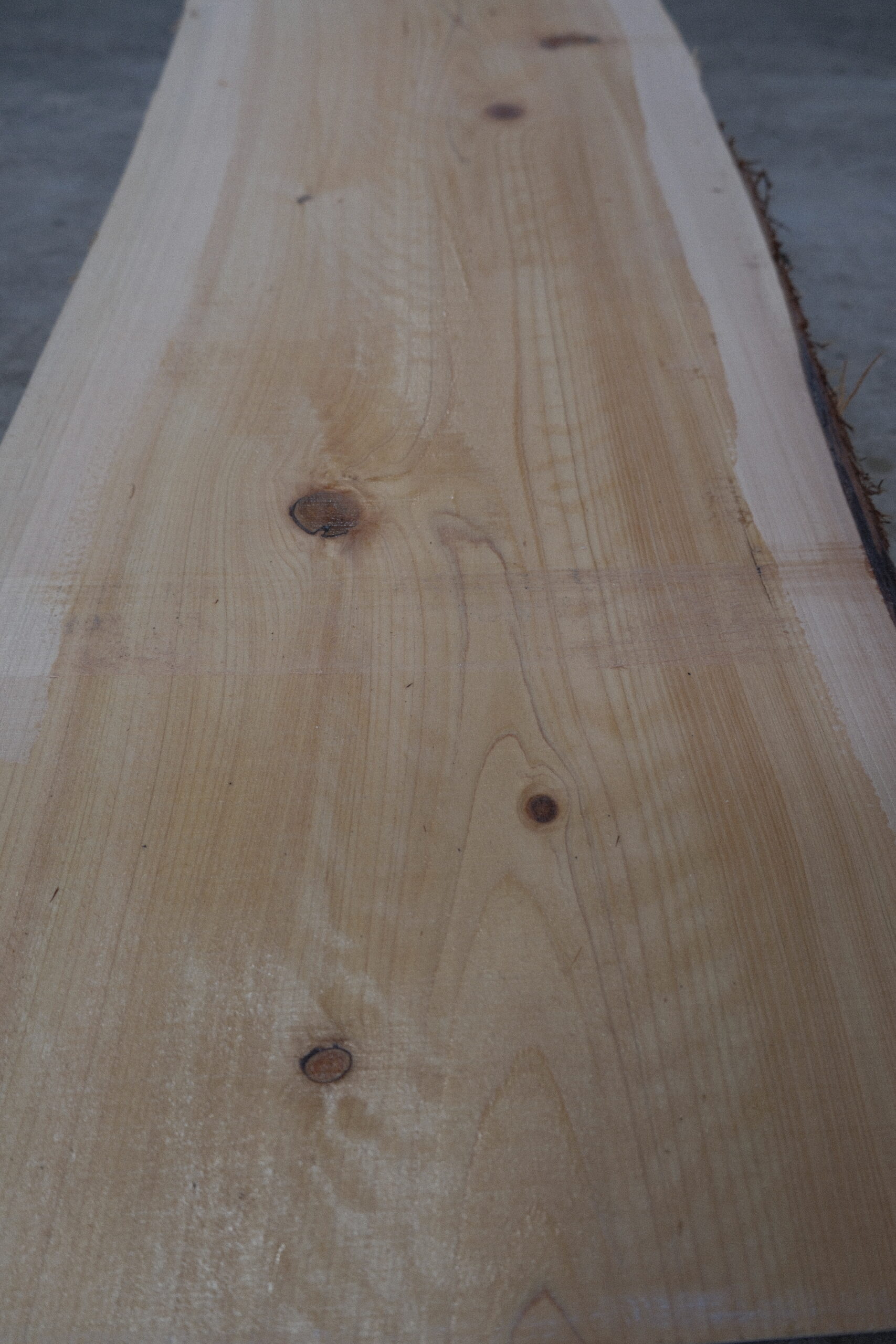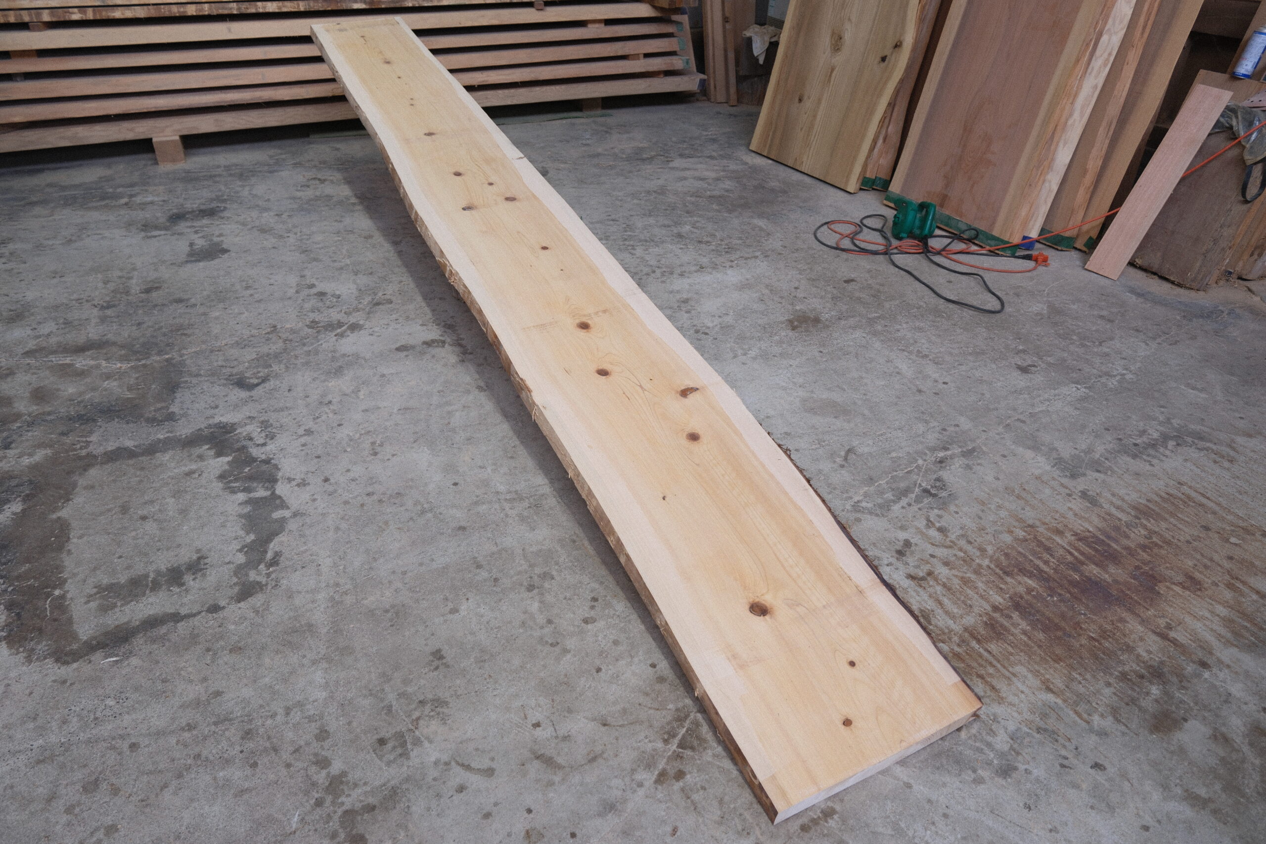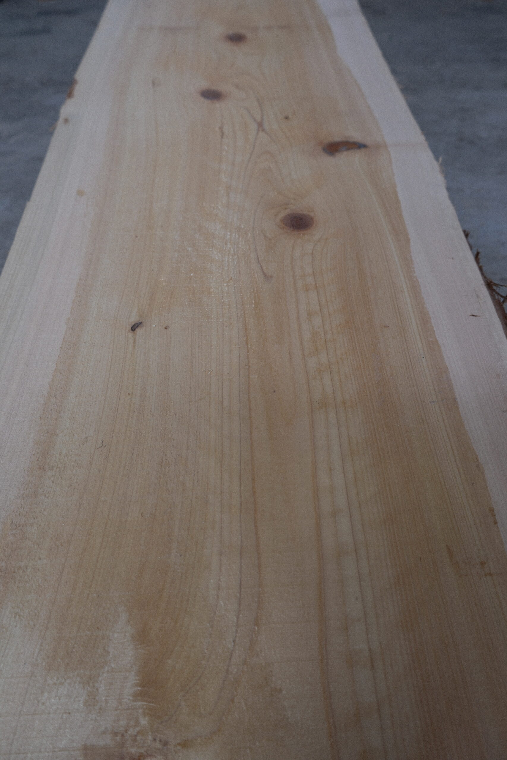 ヒノキ一枚板です。小さな生節が付いています。ヒノキの香りがたまりません。カンナを掛けをすると尚一層良い香りがします。赤身はピンク色です。幅も広い所で400㎜以上ありますので片耳をカットしてキッチンカウンター等にいかがでしょうか。プレーナー掛け、オイル塗装をすると素晴らしくなります。