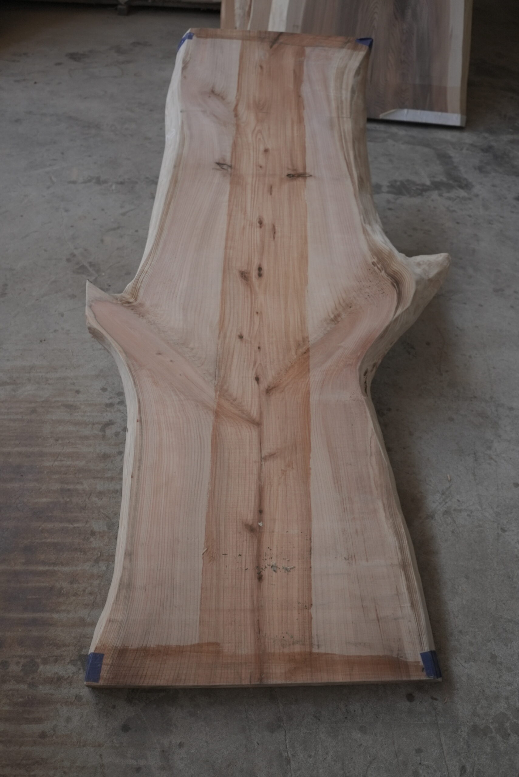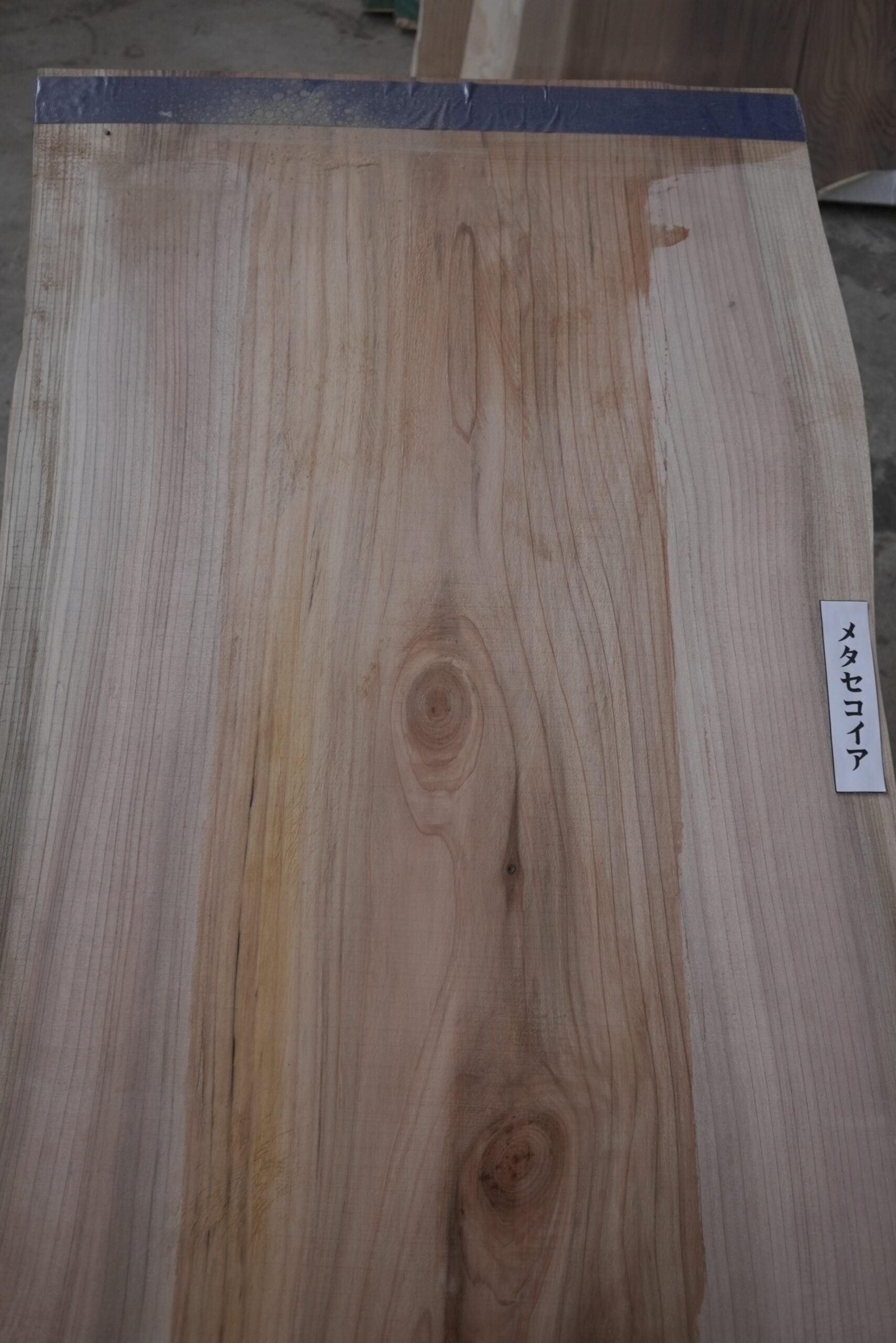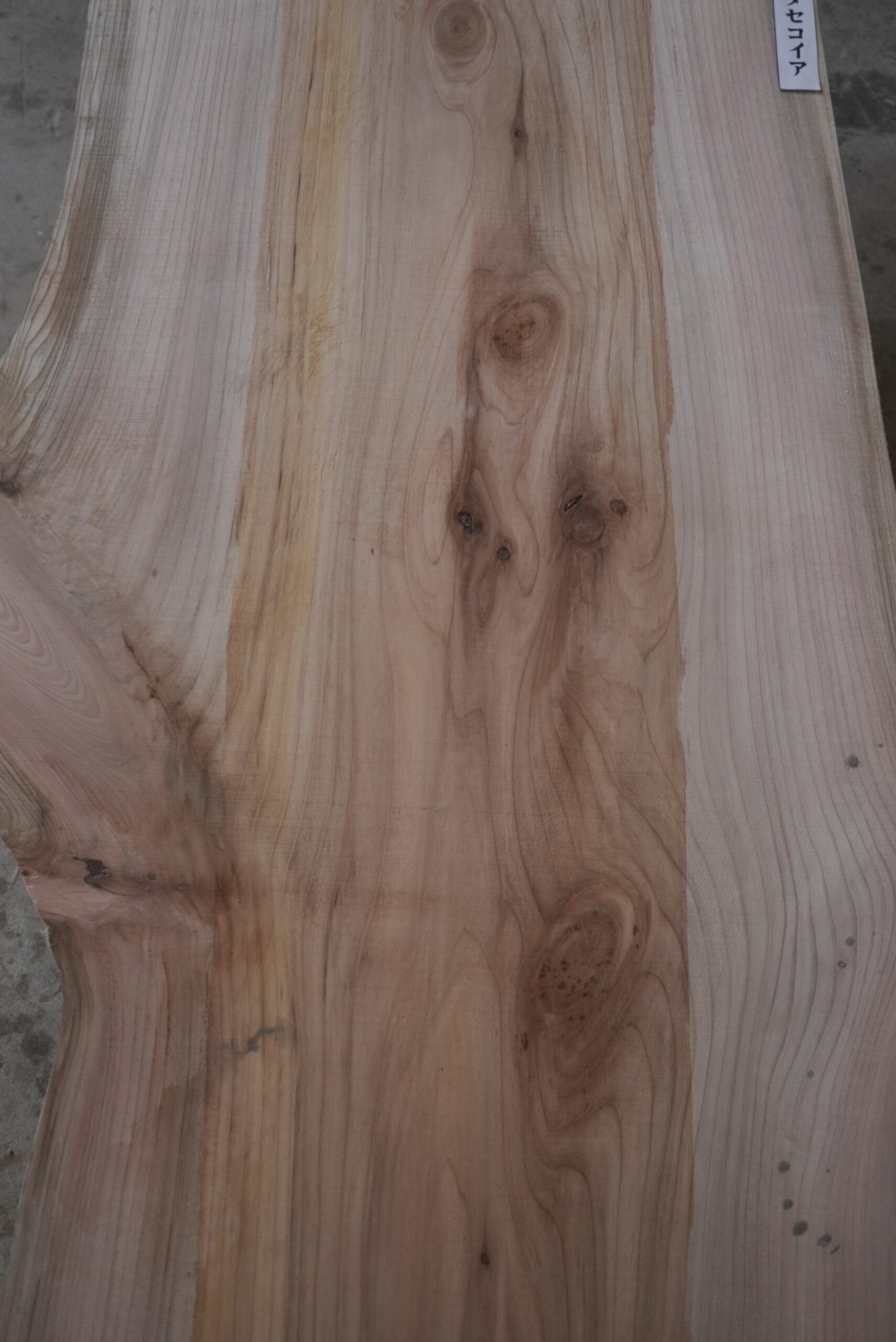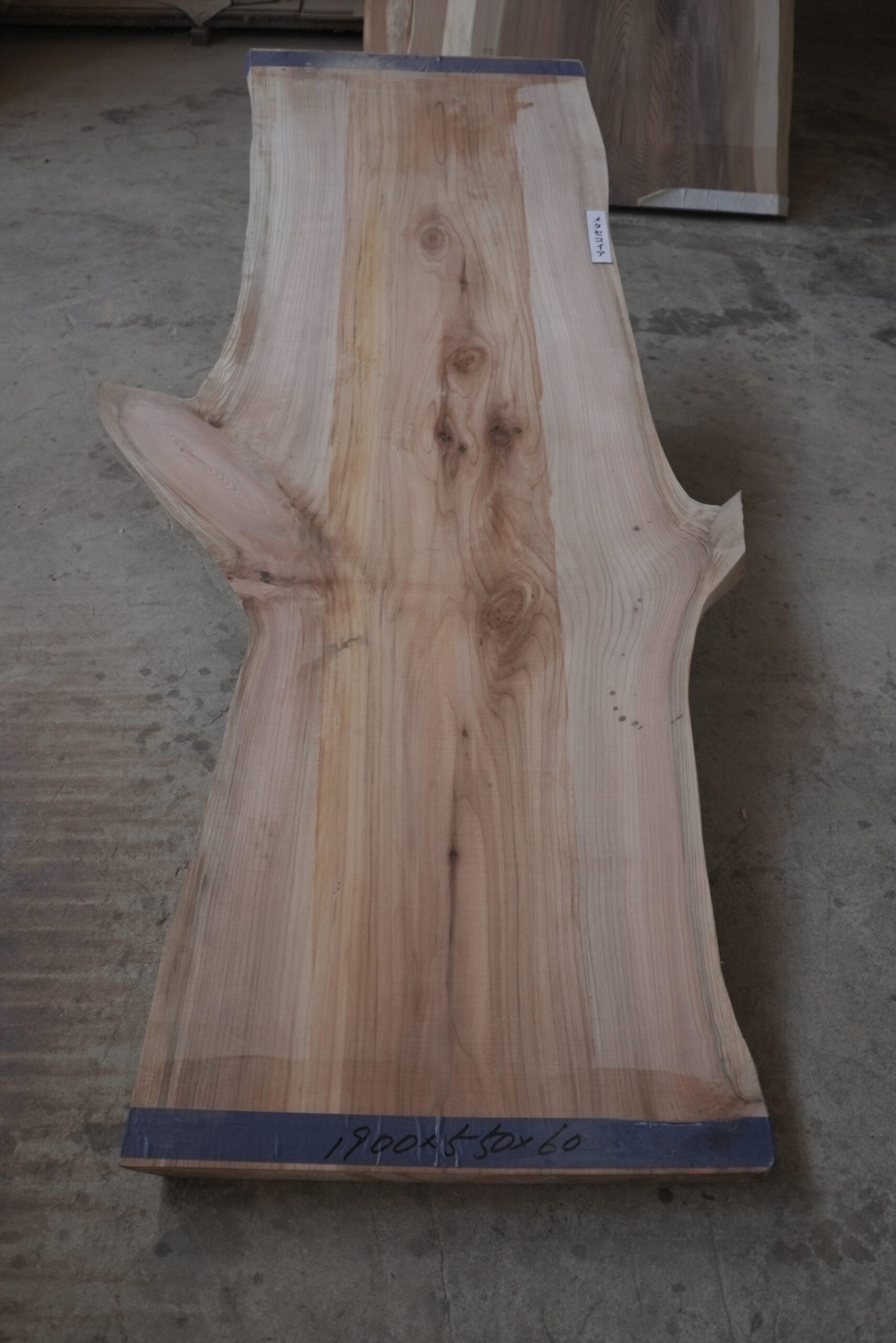 メタセコイアの一枚板です。変わった形でインパクトがあります。真ん中の濃い部分は割れ止めボンドを塗布しています。プレーナー掛けをすると落ちます。幅サイズは耳を含まない内々サイズです。このサイズですとローテーブルにいかがでしょうか。プレーナー掛け、オイル塗装をすると素晴らしくなります。