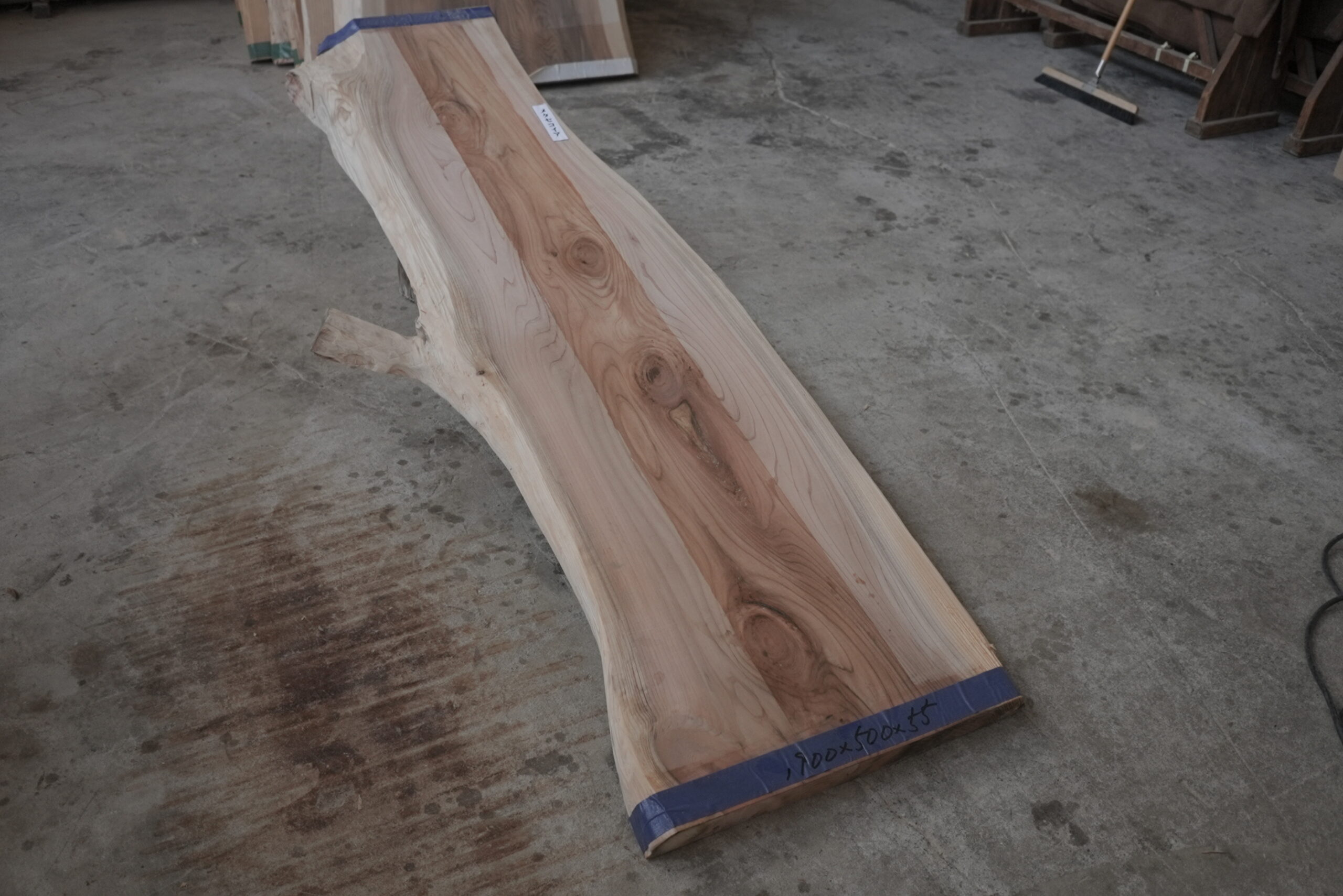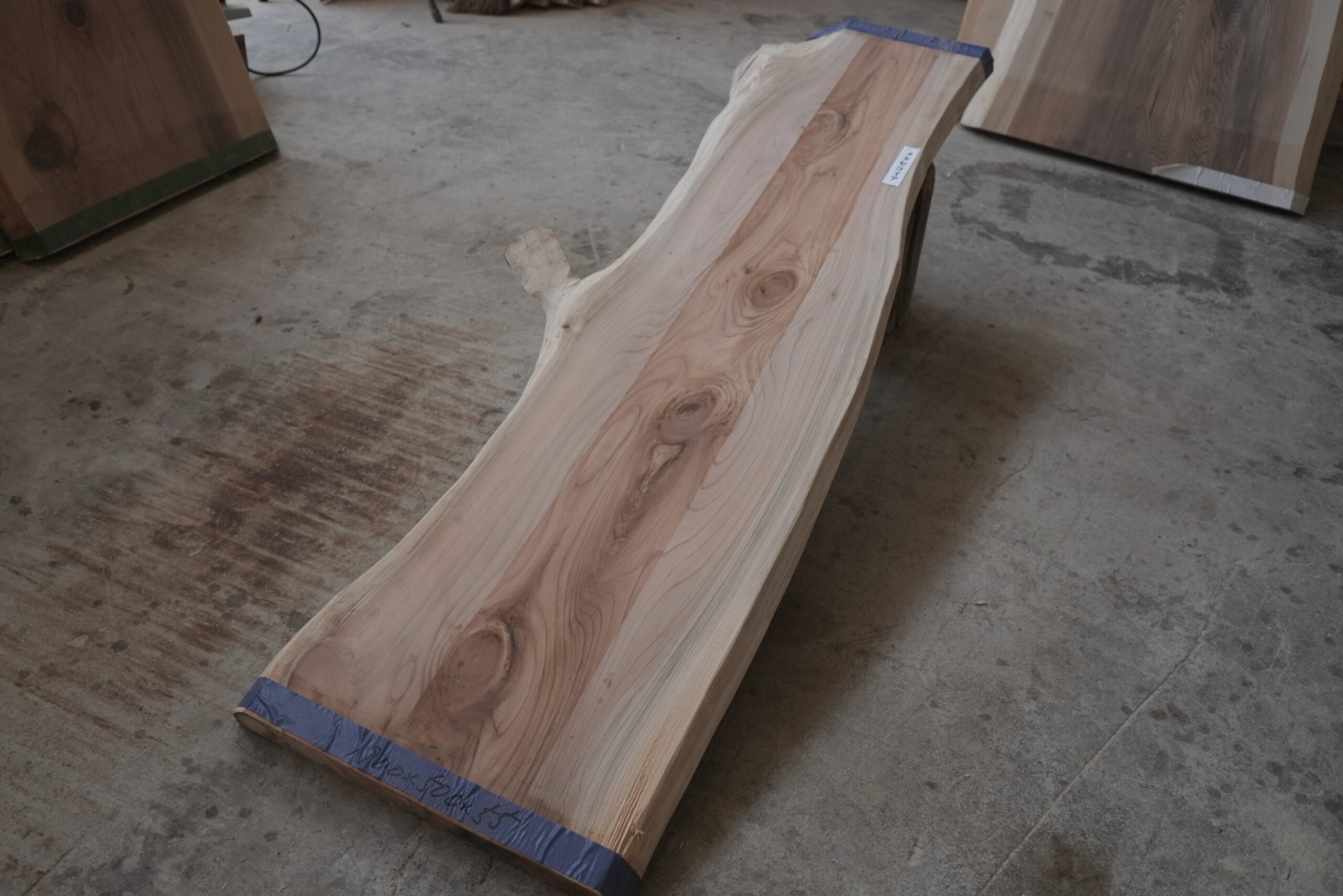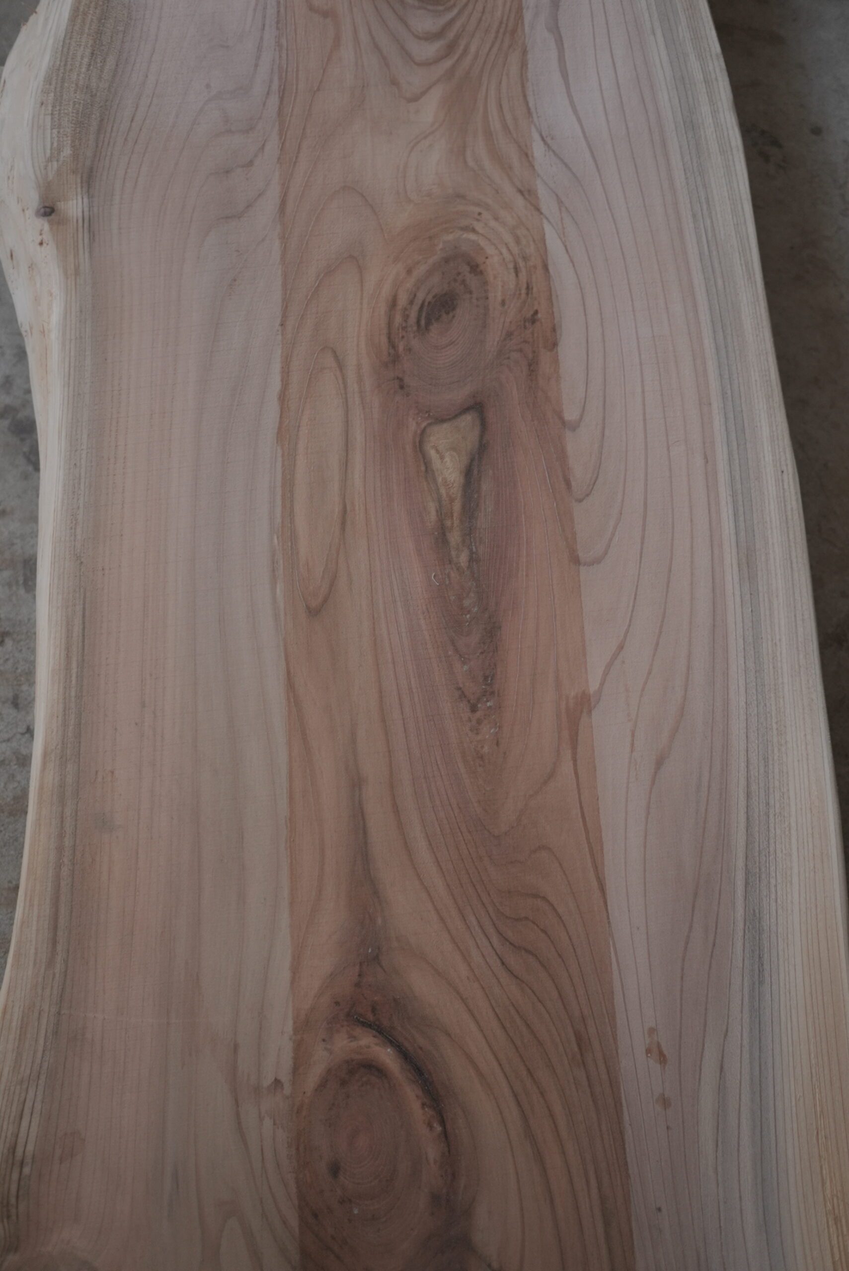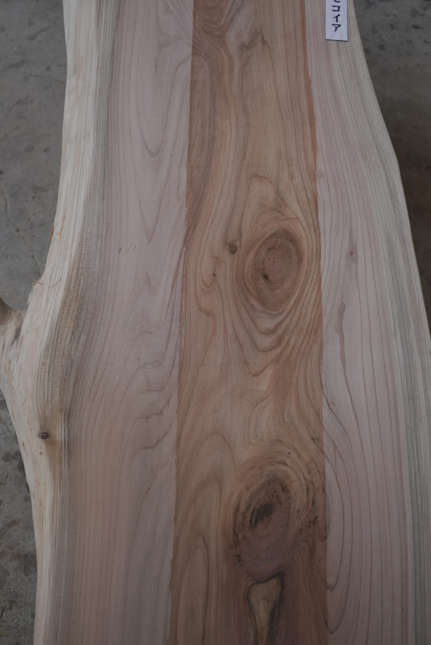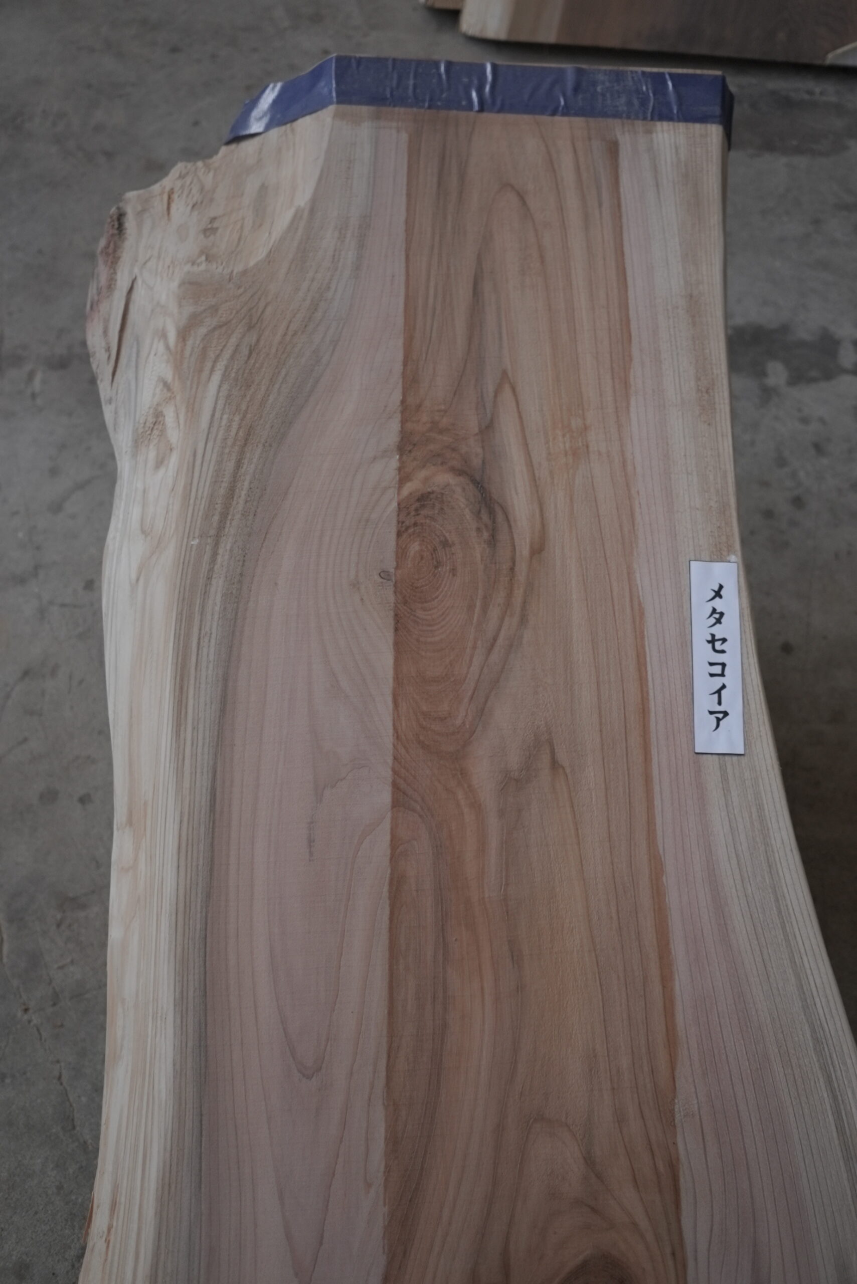 メタセコイアの一枚板です。市場では中々お目にかかれない一枚板です。真ん中の濃い部分は割れ止めボンドを塗布しています。プレーナー掛けをすると落ちます。幅サイズは耳を含まない内々サイズです。このサイズですとローテーブルにいかがでしょうか。プレーナー掛け、オイル塗装をすると素晴らしくなります。