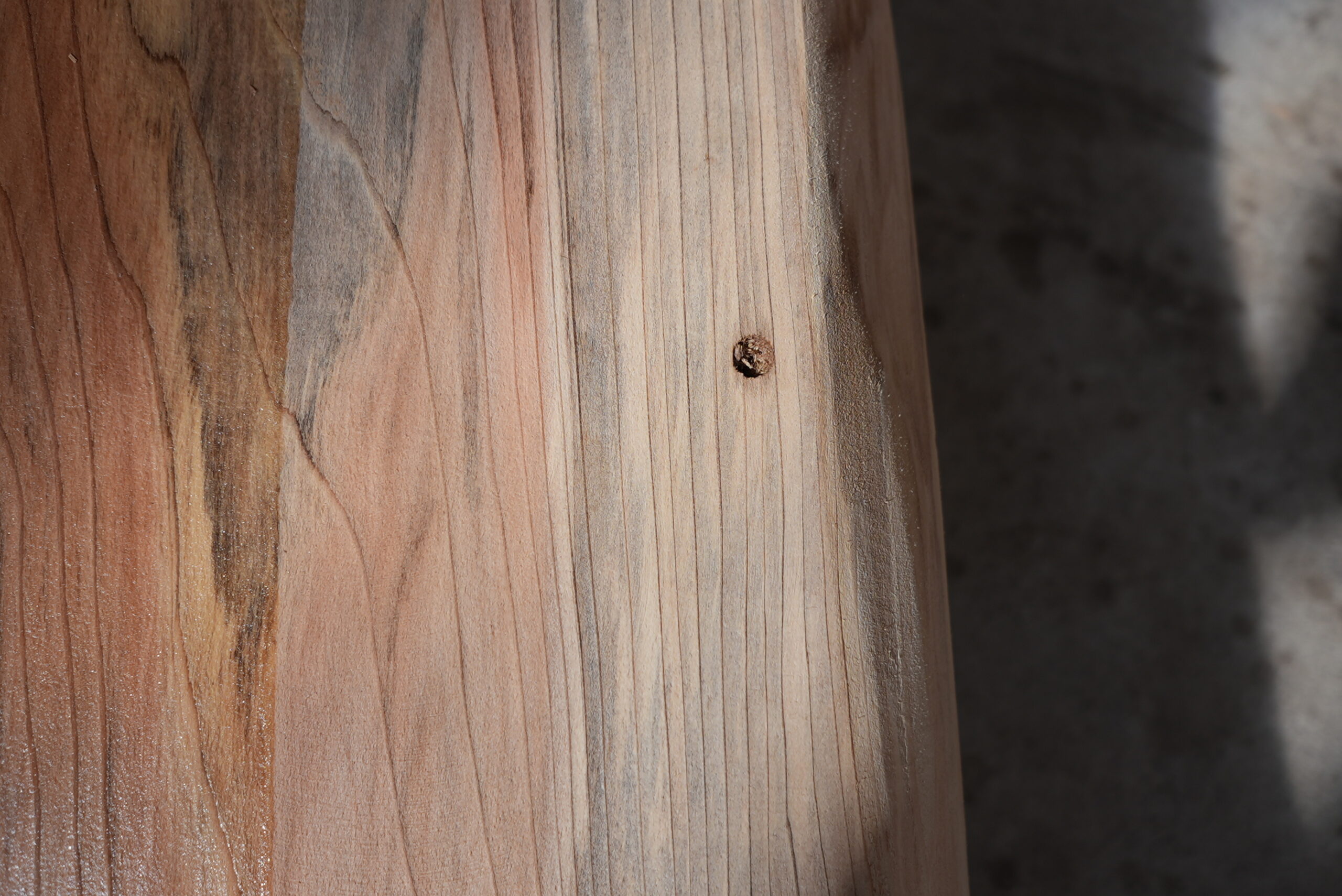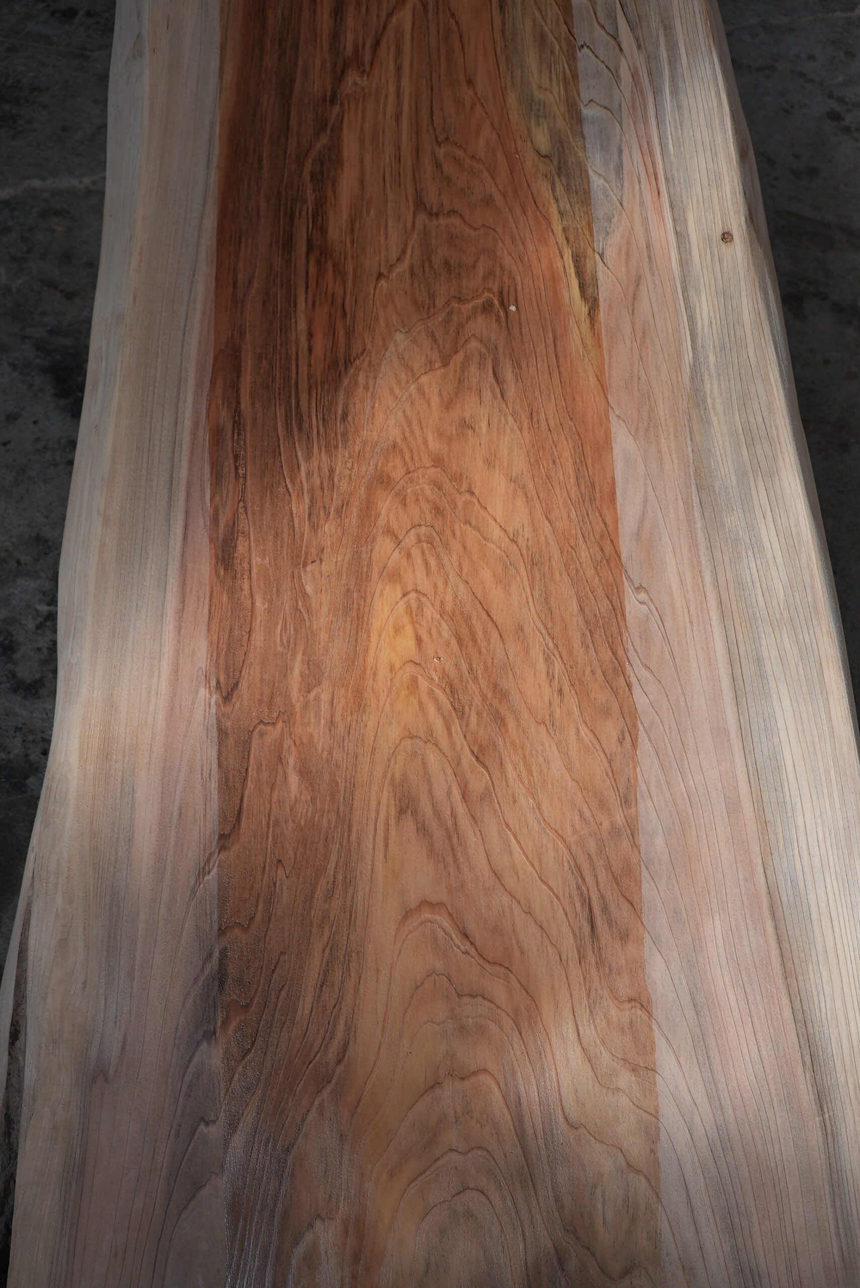 メタセコイアの一枚板です。市場では中々お目にかかれない一枚板です。真ん中の濃い部分は割れ止めボンドを塗布しています。プレーナー掛けをすると落ちます。幅サイズは耳を含まない内々サイズです。ワークデスク、カウンター等に対応が出来ます。プレーナー掛け、オイル塗装をすると素晴らしくなります。