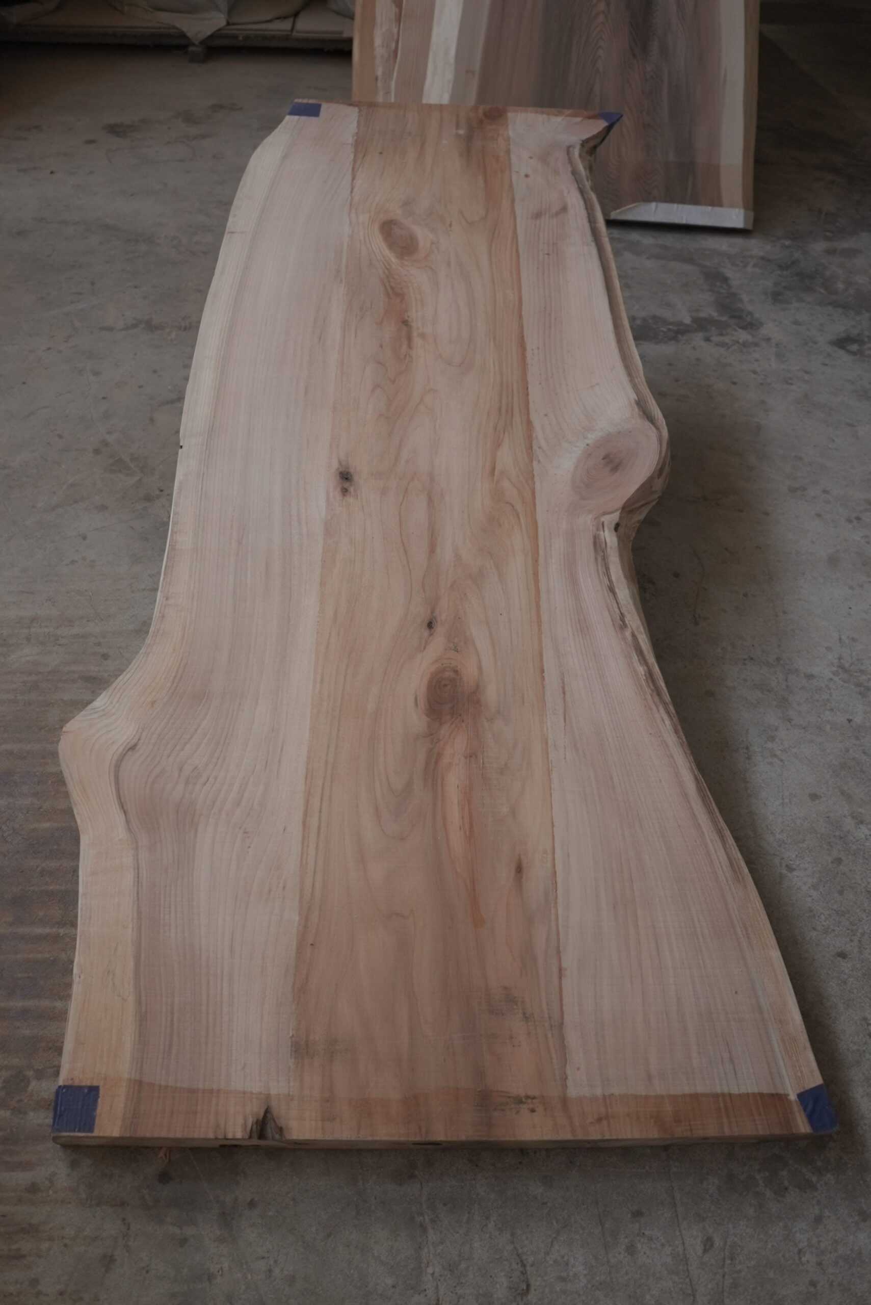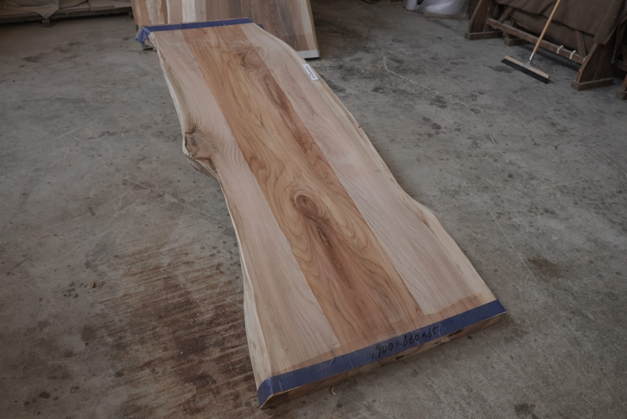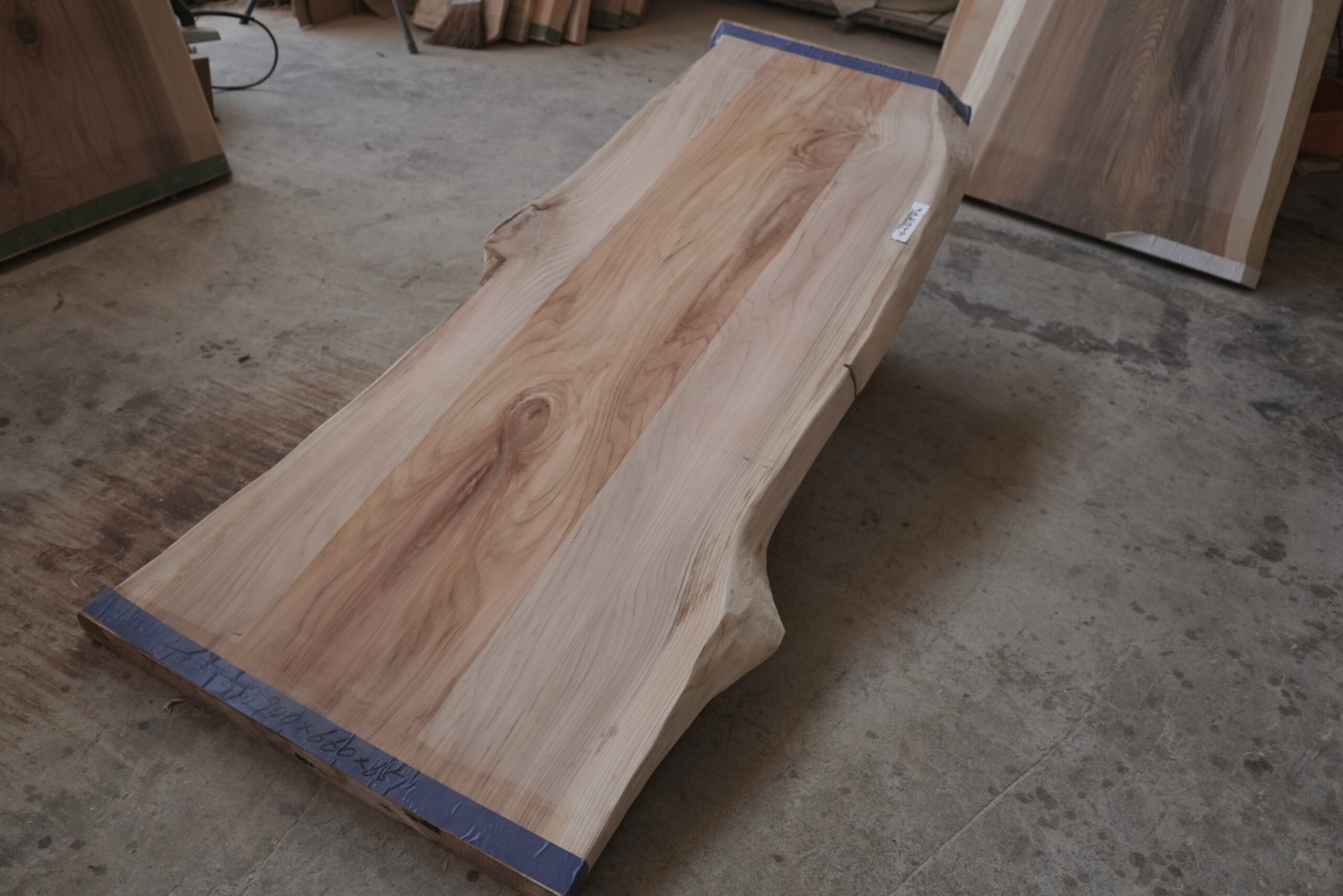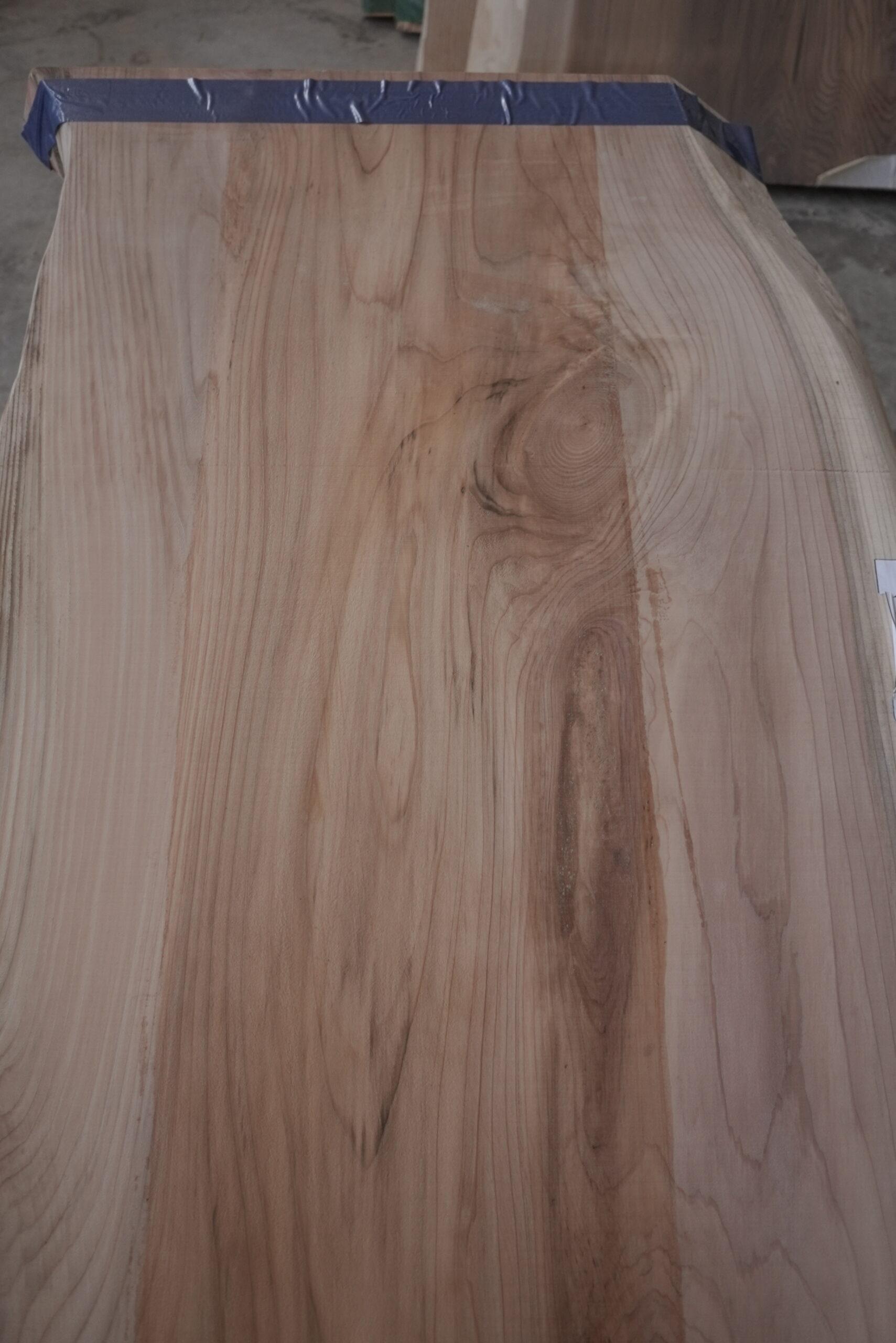 メタセコイアの一枚板です。市場では中々お目にかかれない一枚板です。真ん中の濃い部分は割れ止めボンドを塗布しています。プレーナー掛けをすると落ちます。幅サイズは耳を含まない内々サイズです。このサイズですとテーブルにも対応が出来ます。プレーナー掛け、オイル塗装をすると素晴らしくなります。