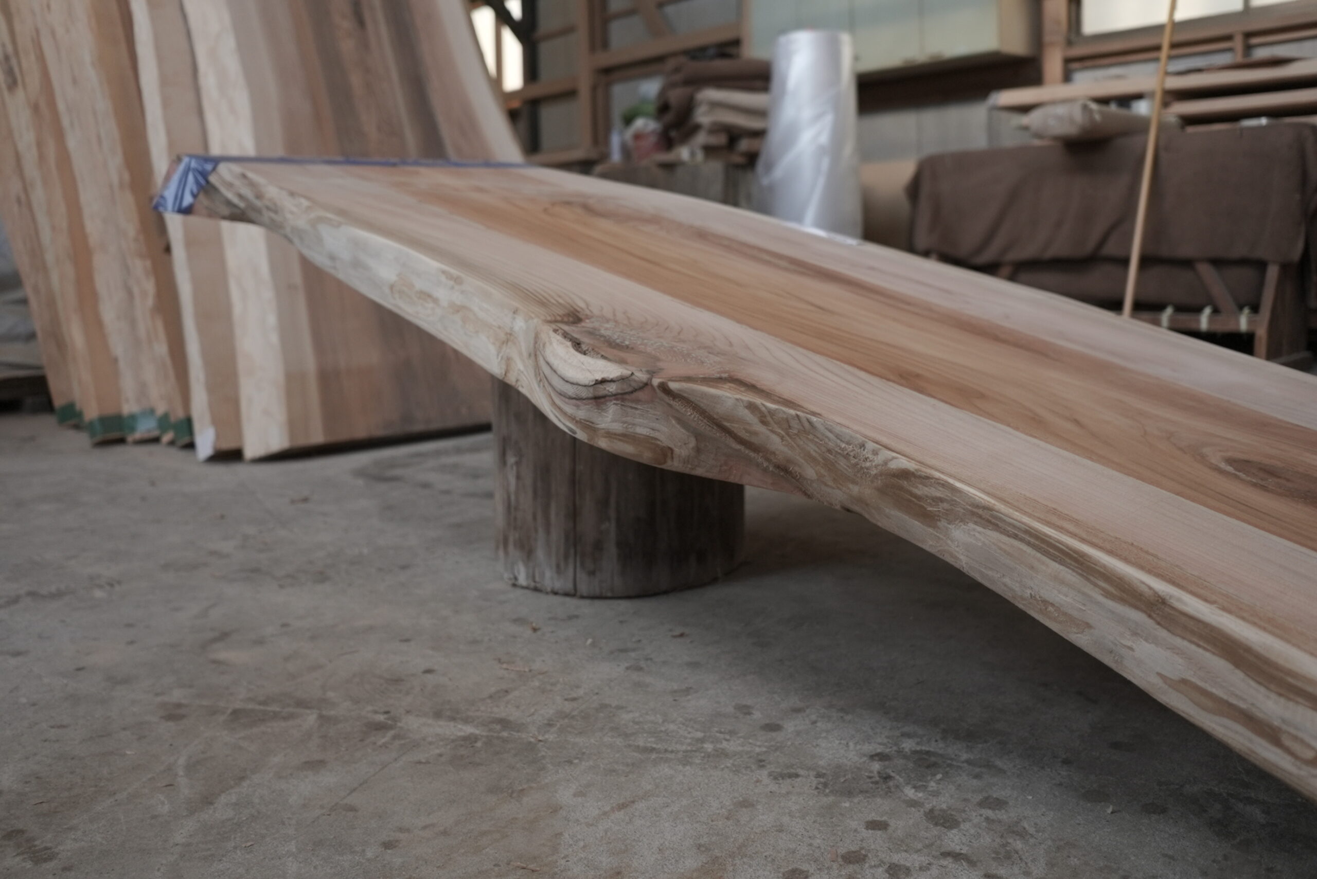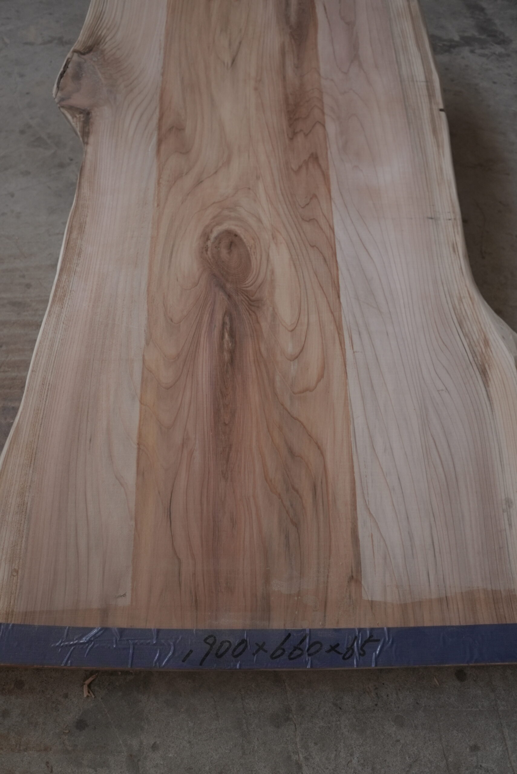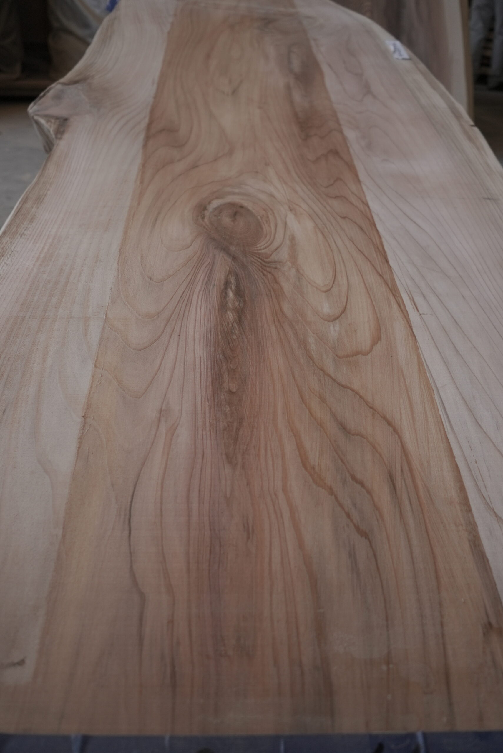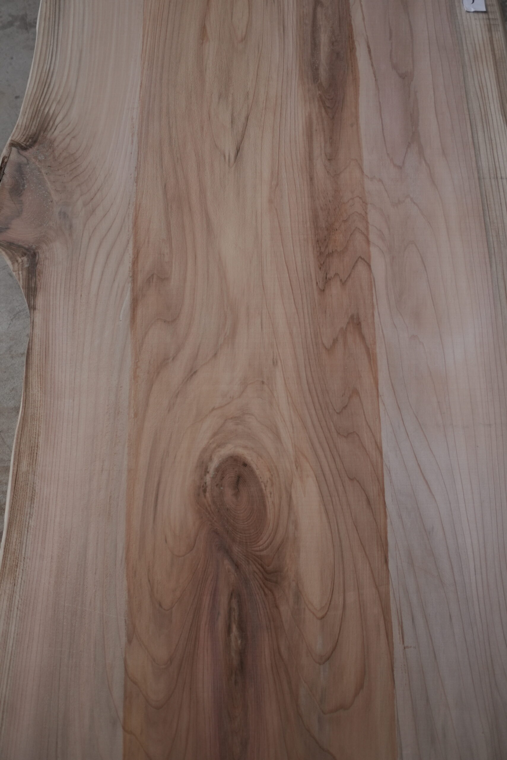 メタセコイアの一枚板です。市場では中々お目にかかれない一枚板です。真ん中の濃い部分は割れ止めボンドを塗布しています。プレーナー掛けをすると落ちます。幅サイズは耳を含まない内々サイズです。このサイズですとテーブルにも対応が出来ます。プレーナー掛け、オイル塗装をすると素晴らしくなります。