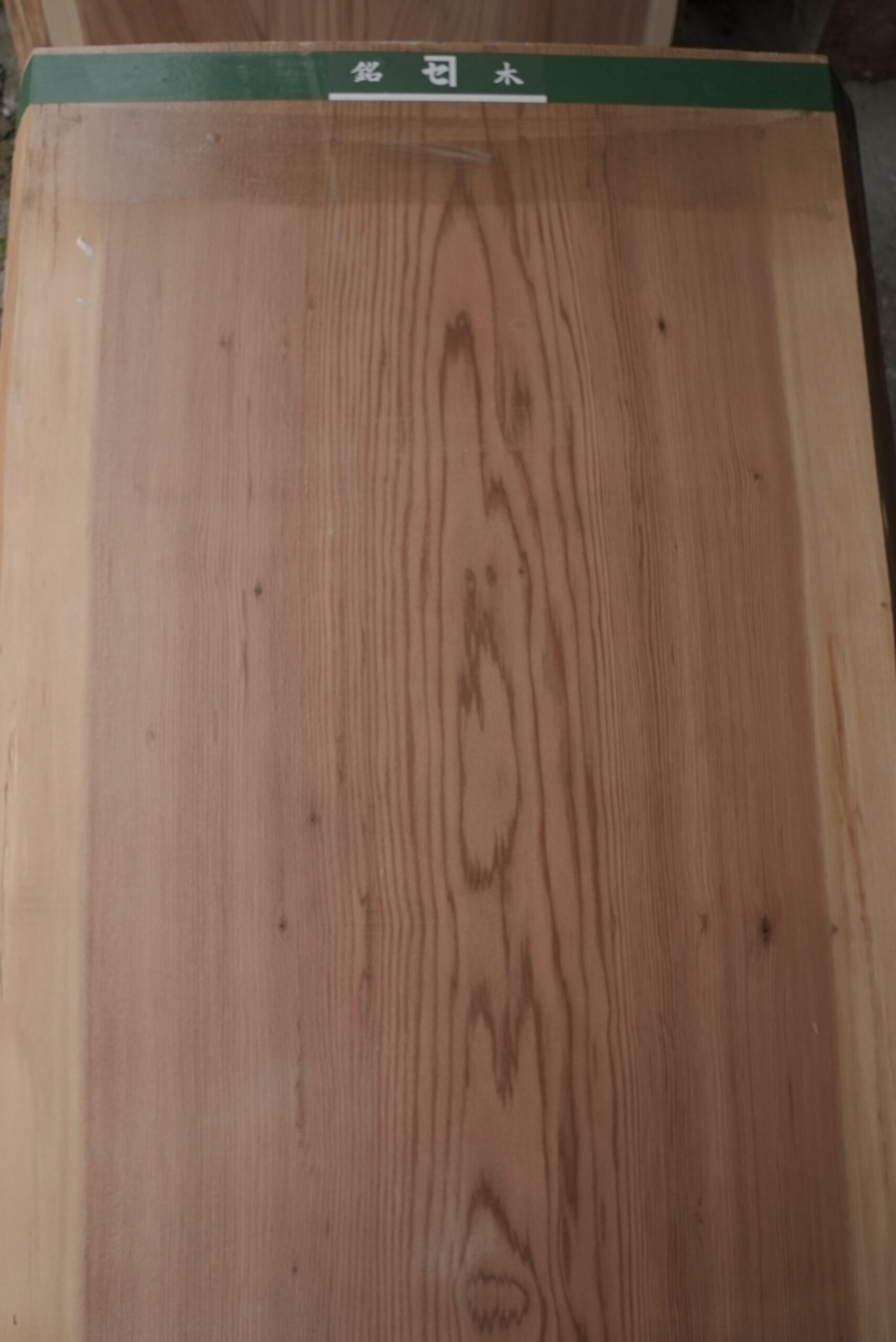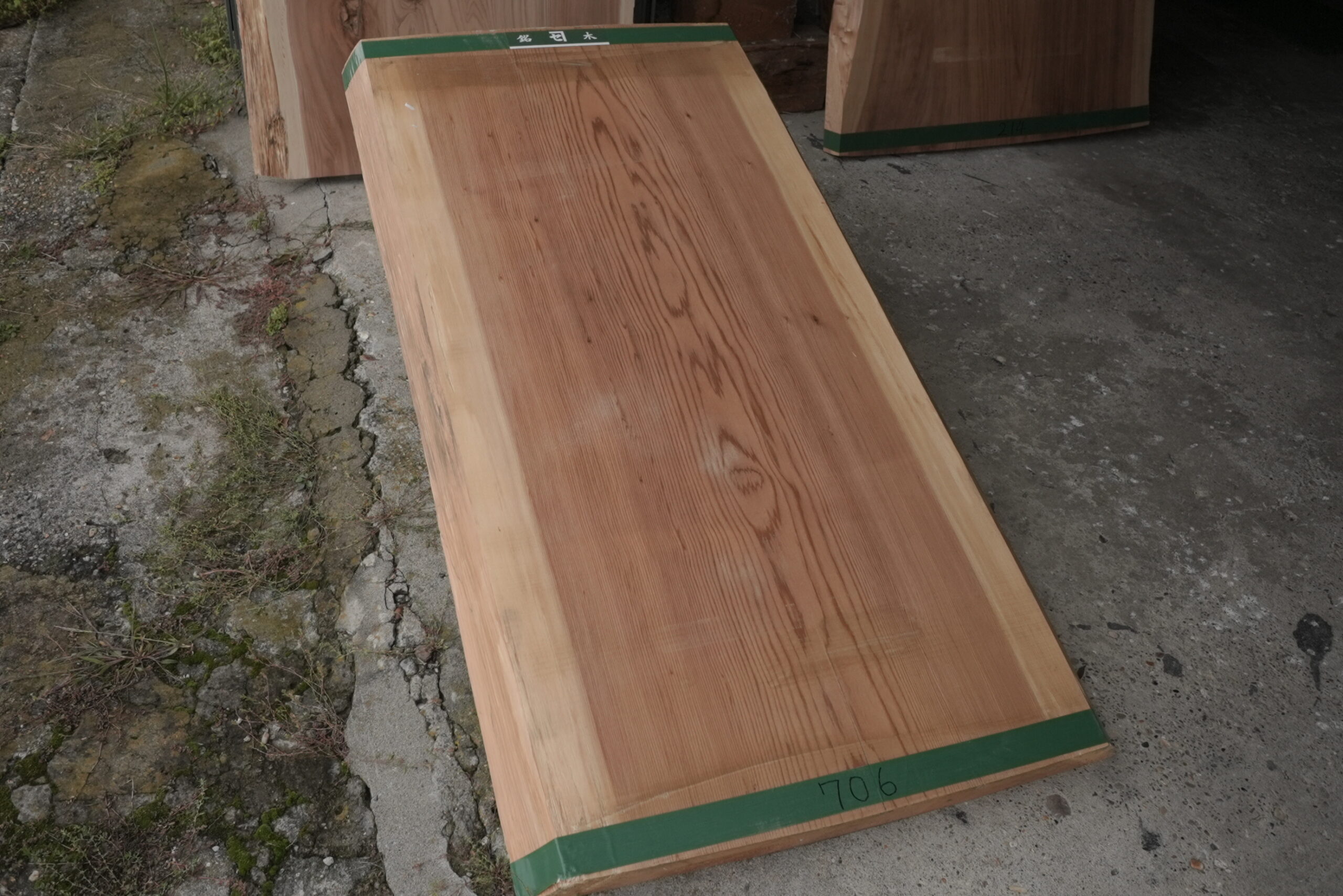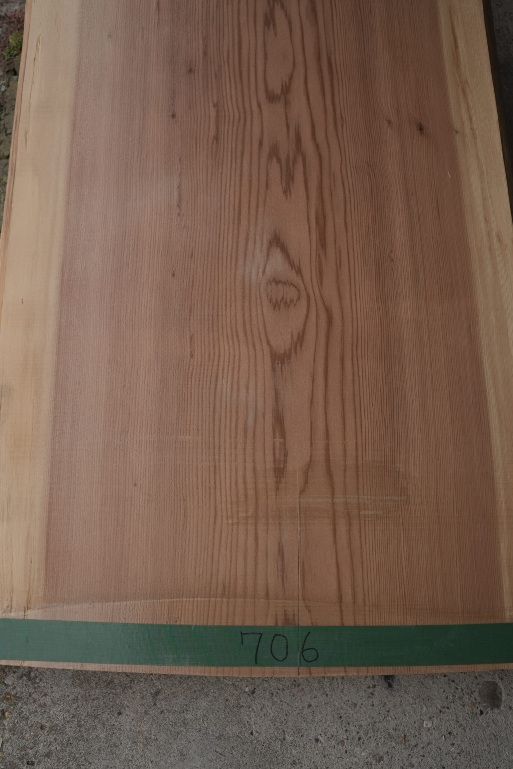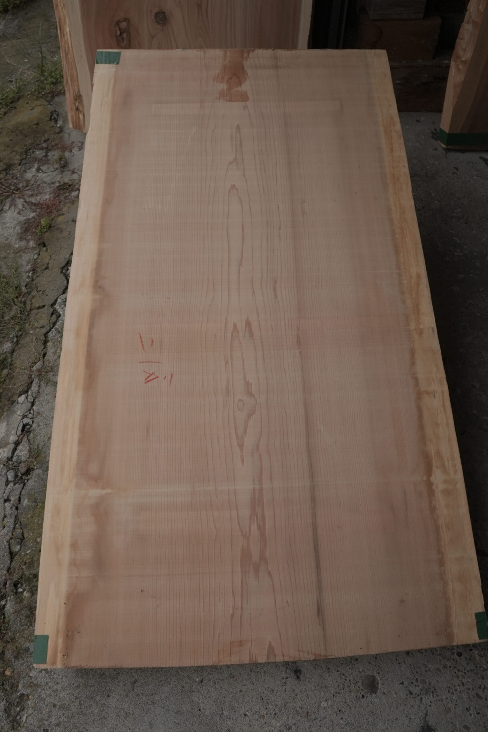 天然杉一枚板です。幅が全体で720㎜、長さ1300㎜のテーブル用サイズになります。色合いはやや赤みが強く綺麗な一枚板です。無節で耳は付いていますがややストレートになっていて幅はある物のスッキリした感じです。プレーナー掛け、オイル塗装をすると素晴らしくなります。