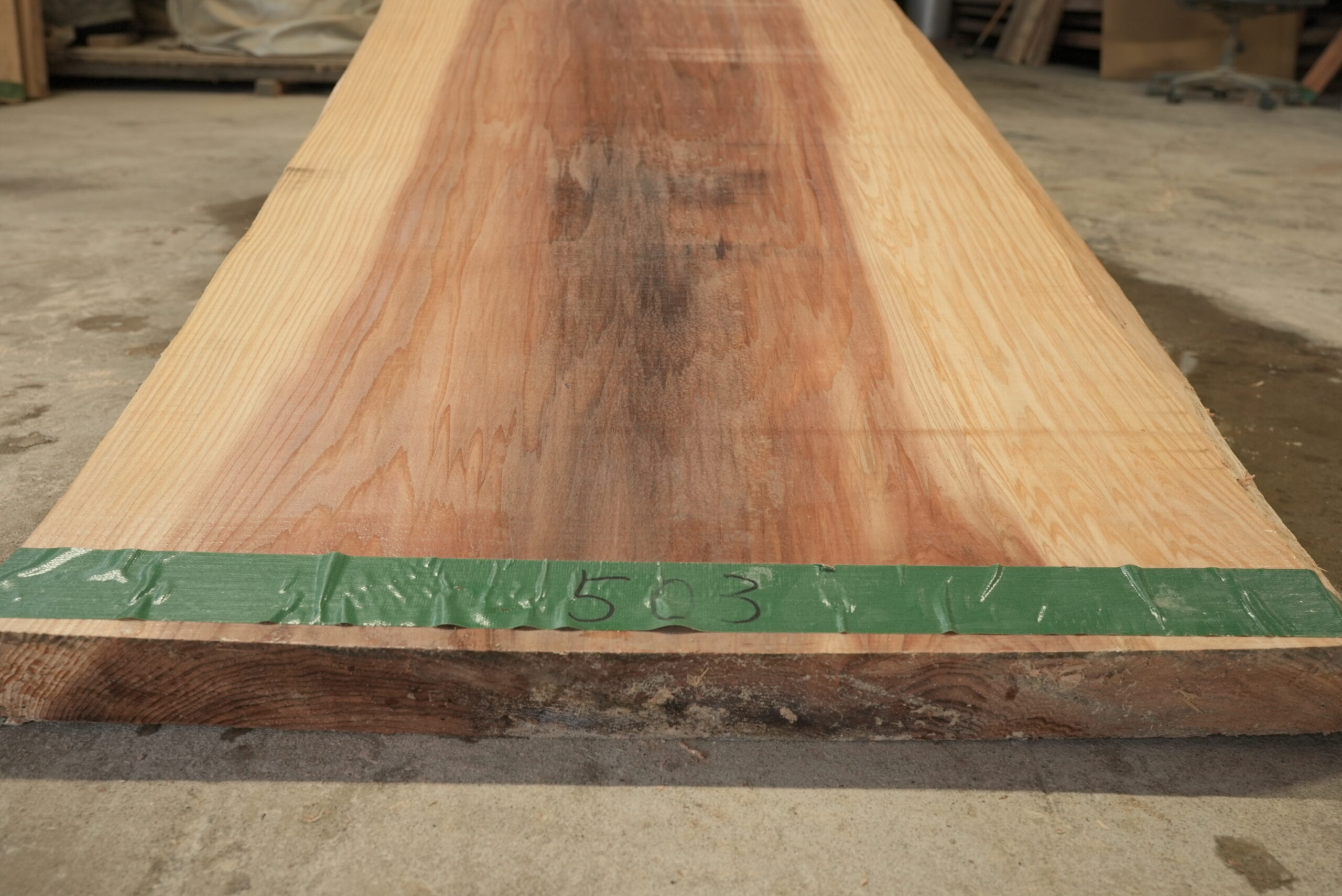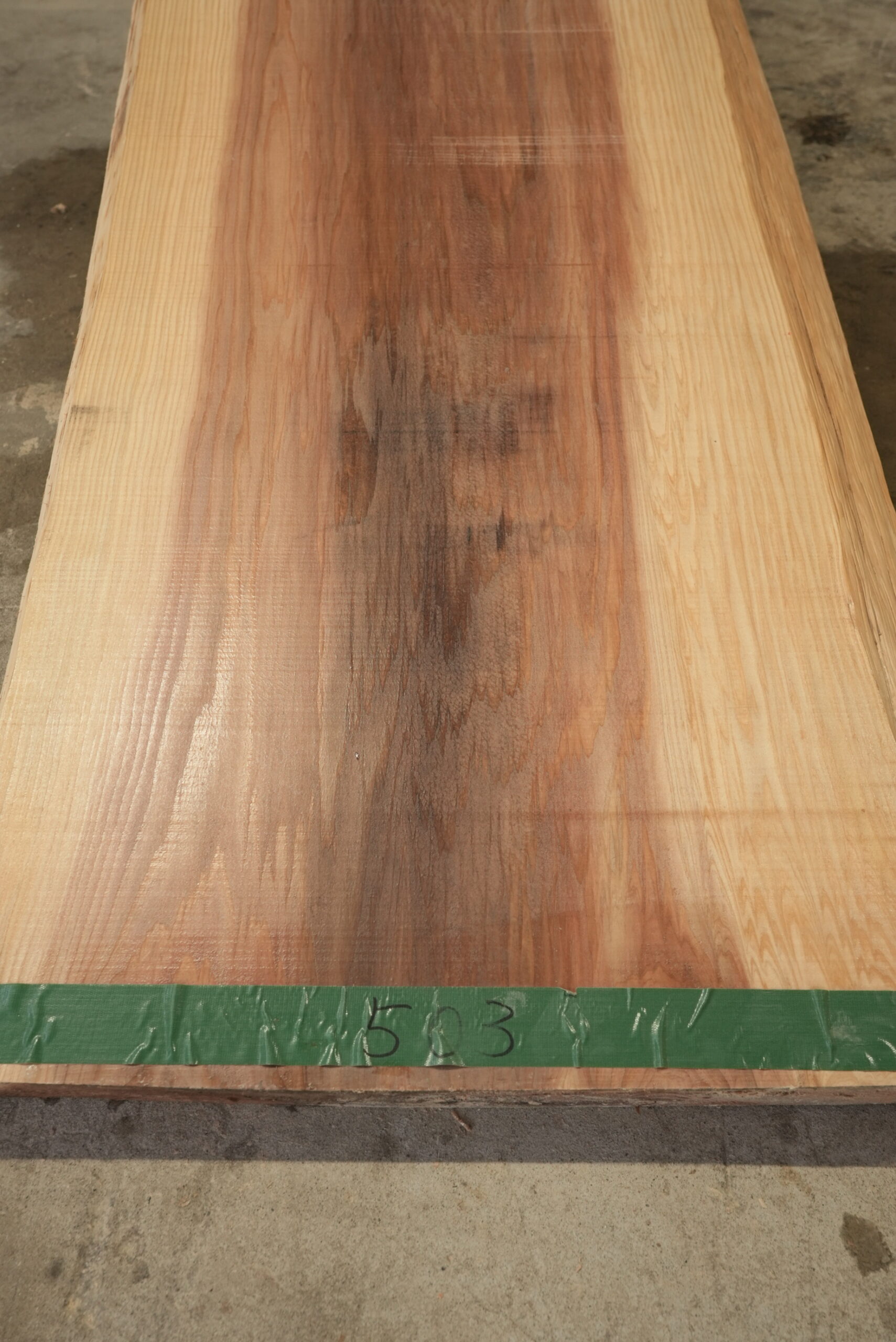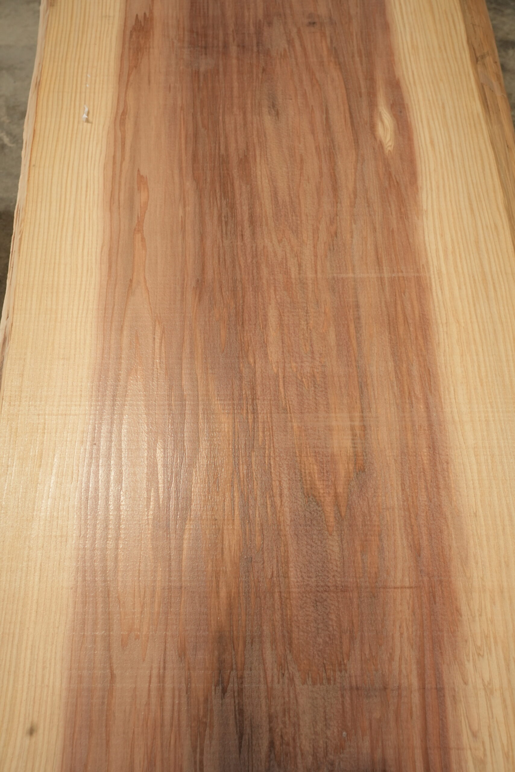 天然杉一枚板です。奥行が60㎝ありますので一枚板カウンター、ワークデスクテーブルには最適なサイズです。幅サイズは耳を含まない内々サイズです。長さが2100㎜あるので使い勝手が良い一枚板です。動きのある杢目も魅力的です。表面に割れ止めボンドを塗布していますがプレーナー掛けをすると落ちます。