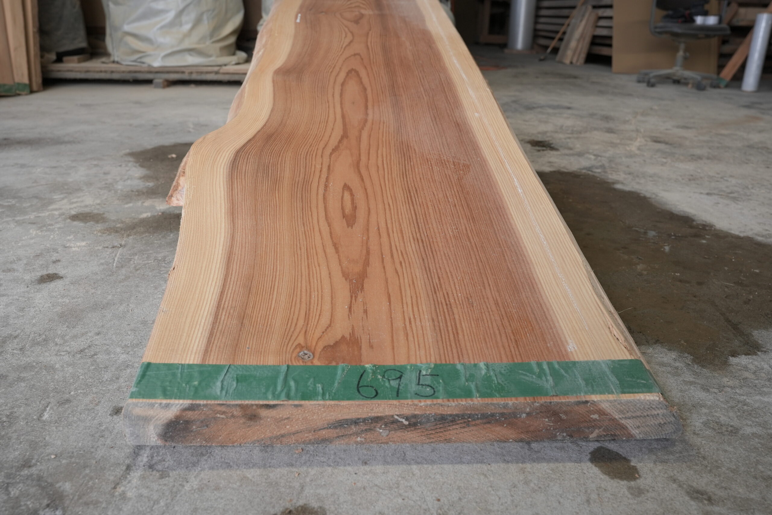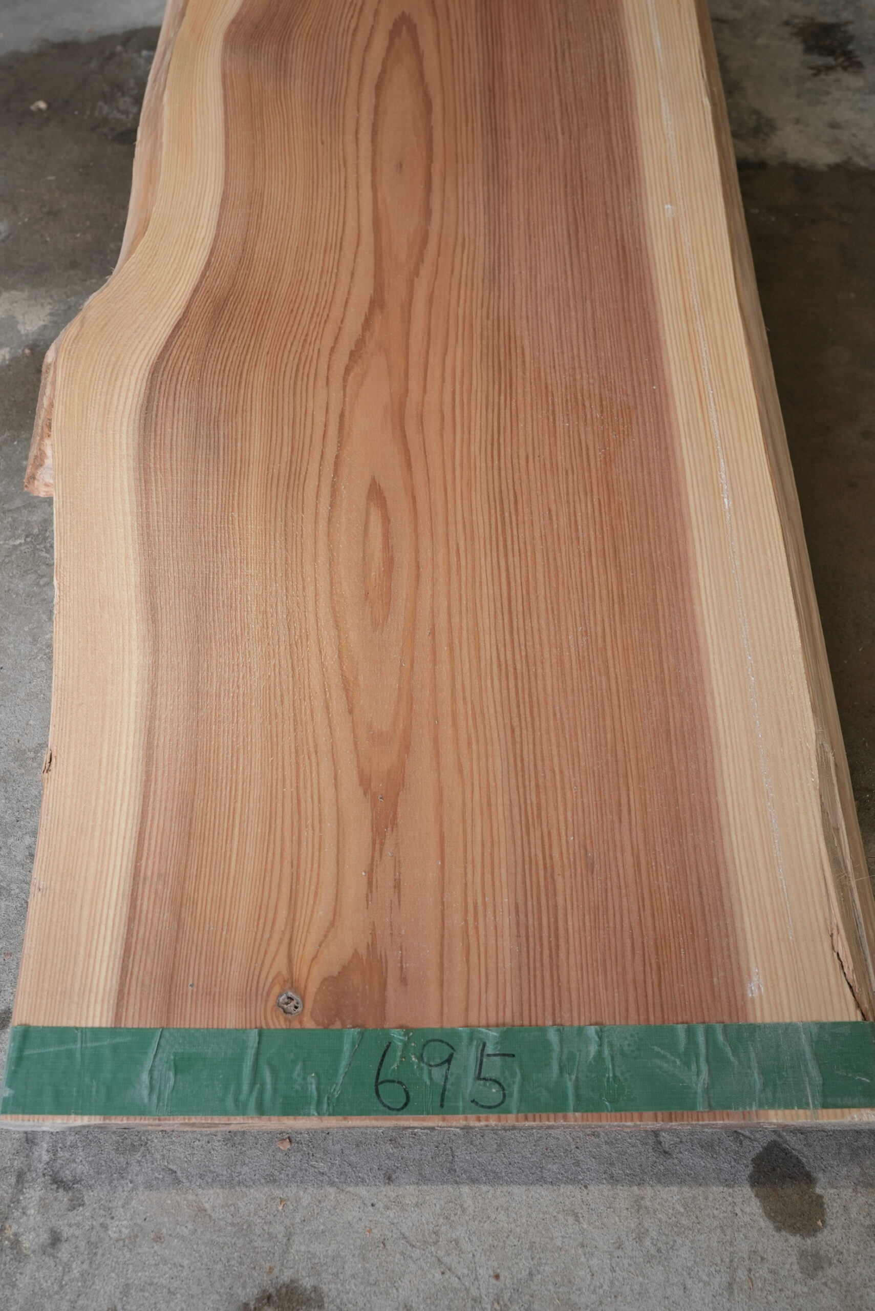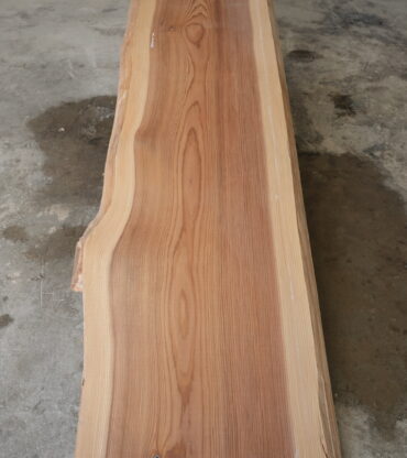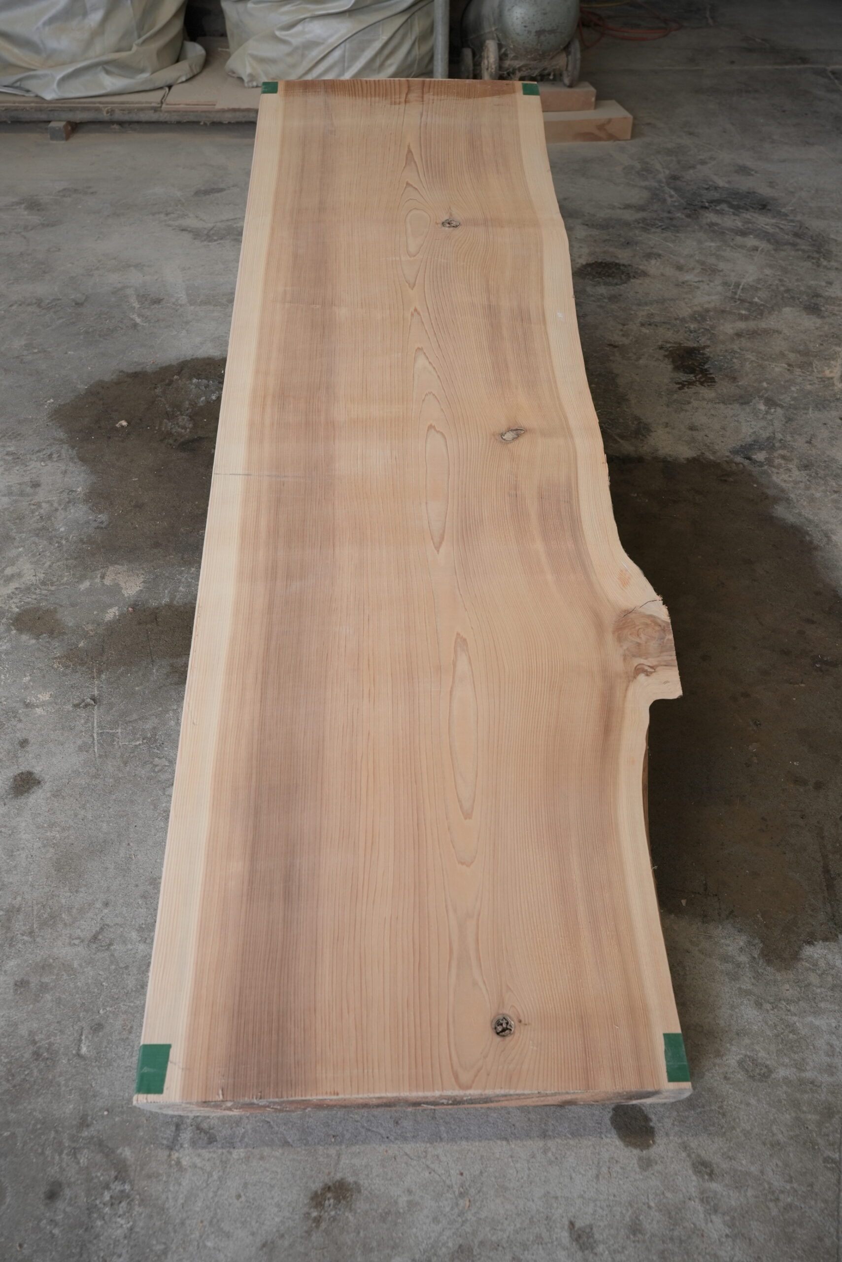 天然杉一枚板です。左側が湾曲になっていて良い雰囲気を出しています。一枚板カウンター、ワークデスクテーブルには最適なサイズです。幅サイズは耳を含まない内々サイズです。上品な杢目も魅力的です。表面に割れ止めボンドを塗布していますがプレーナー掛けをすると落ちます。