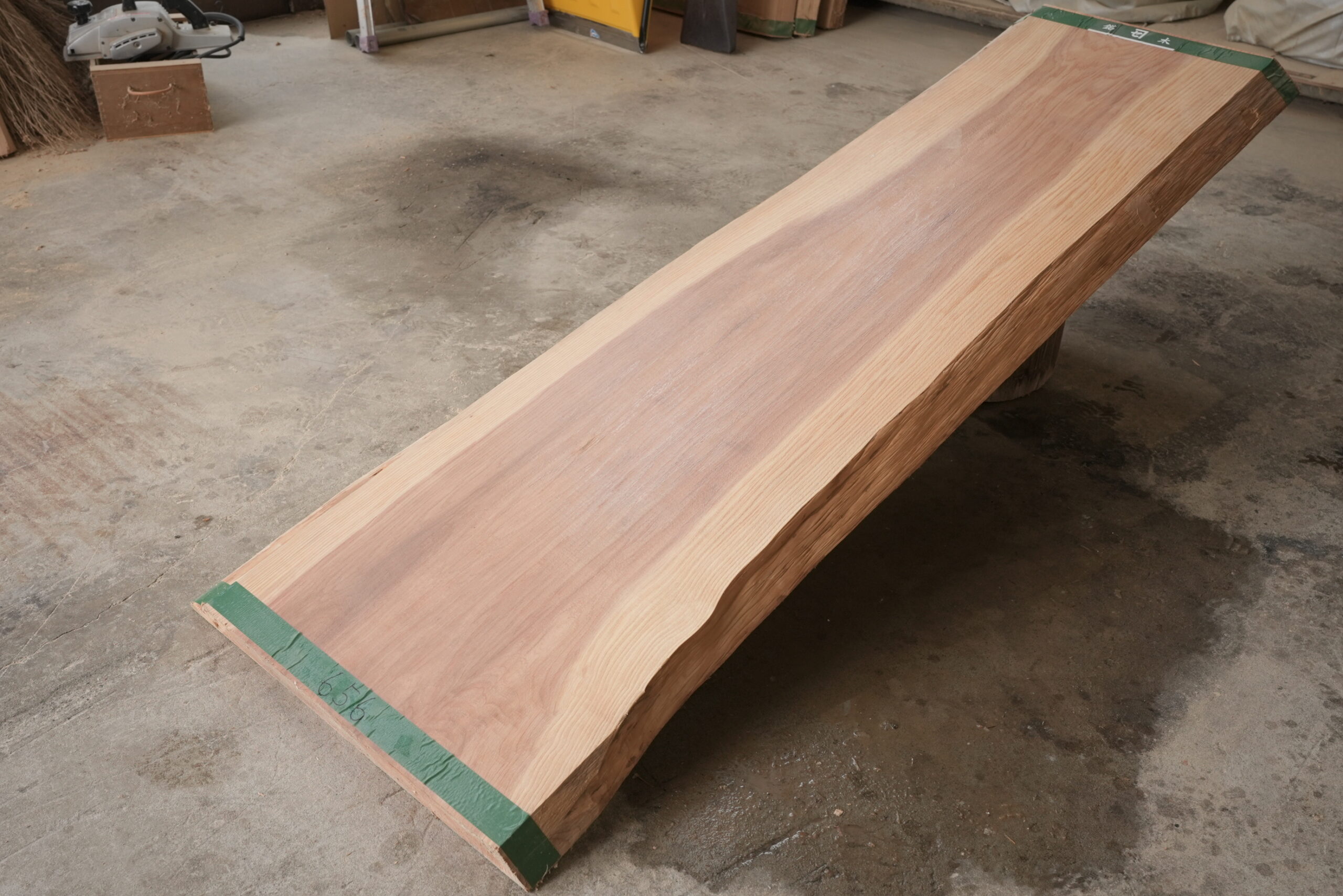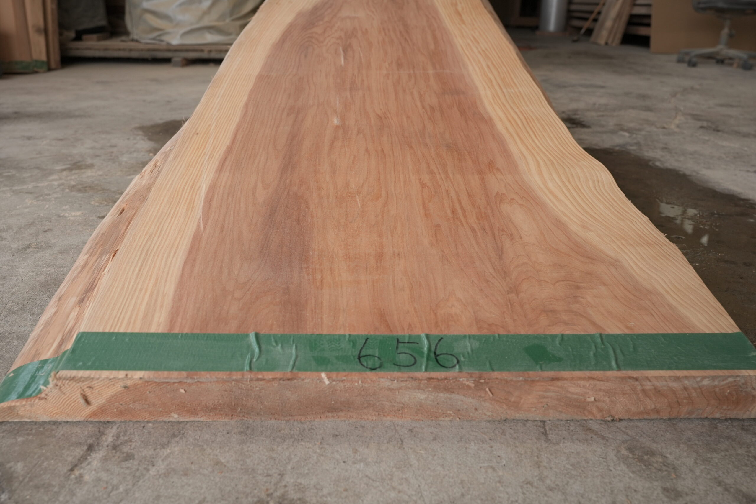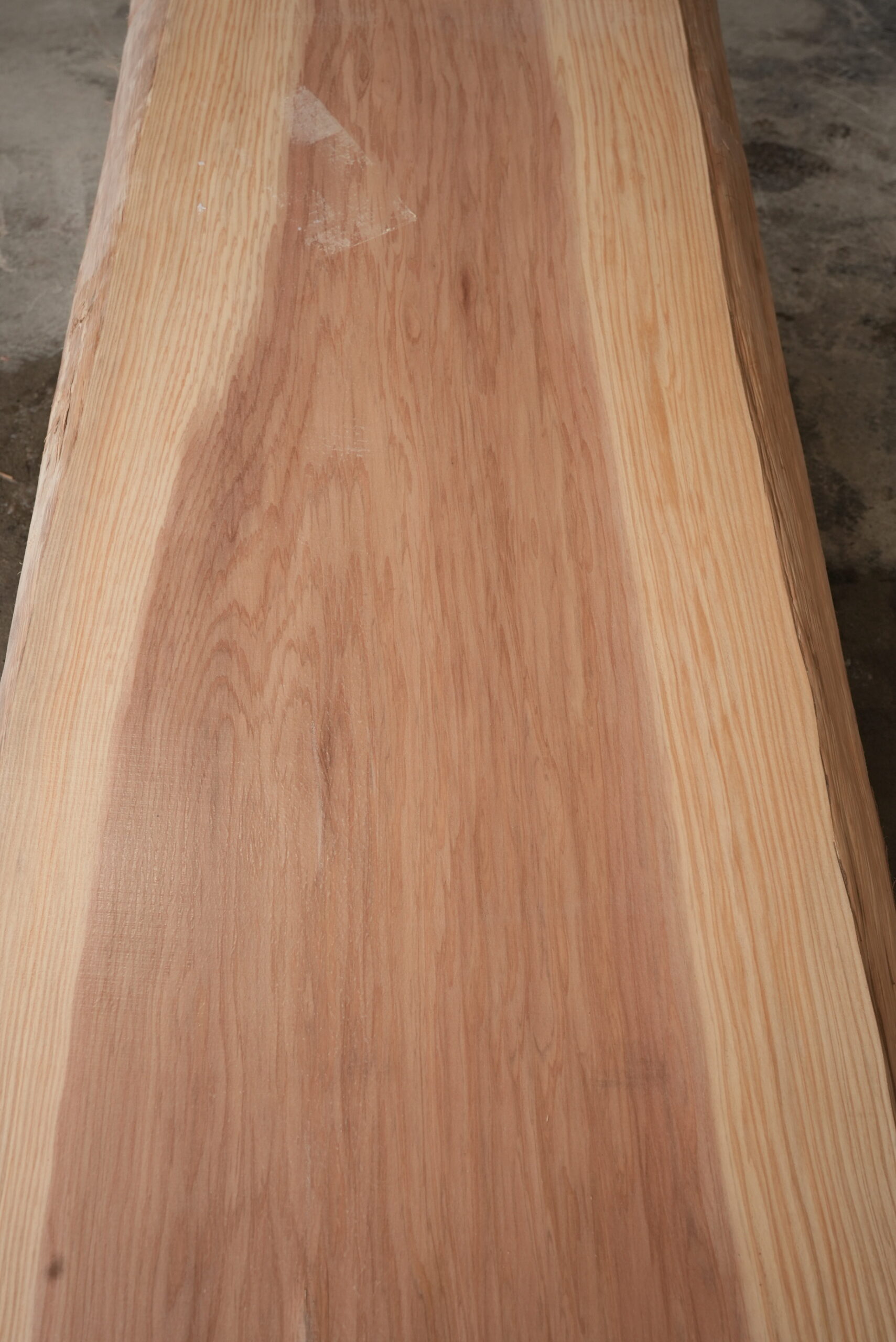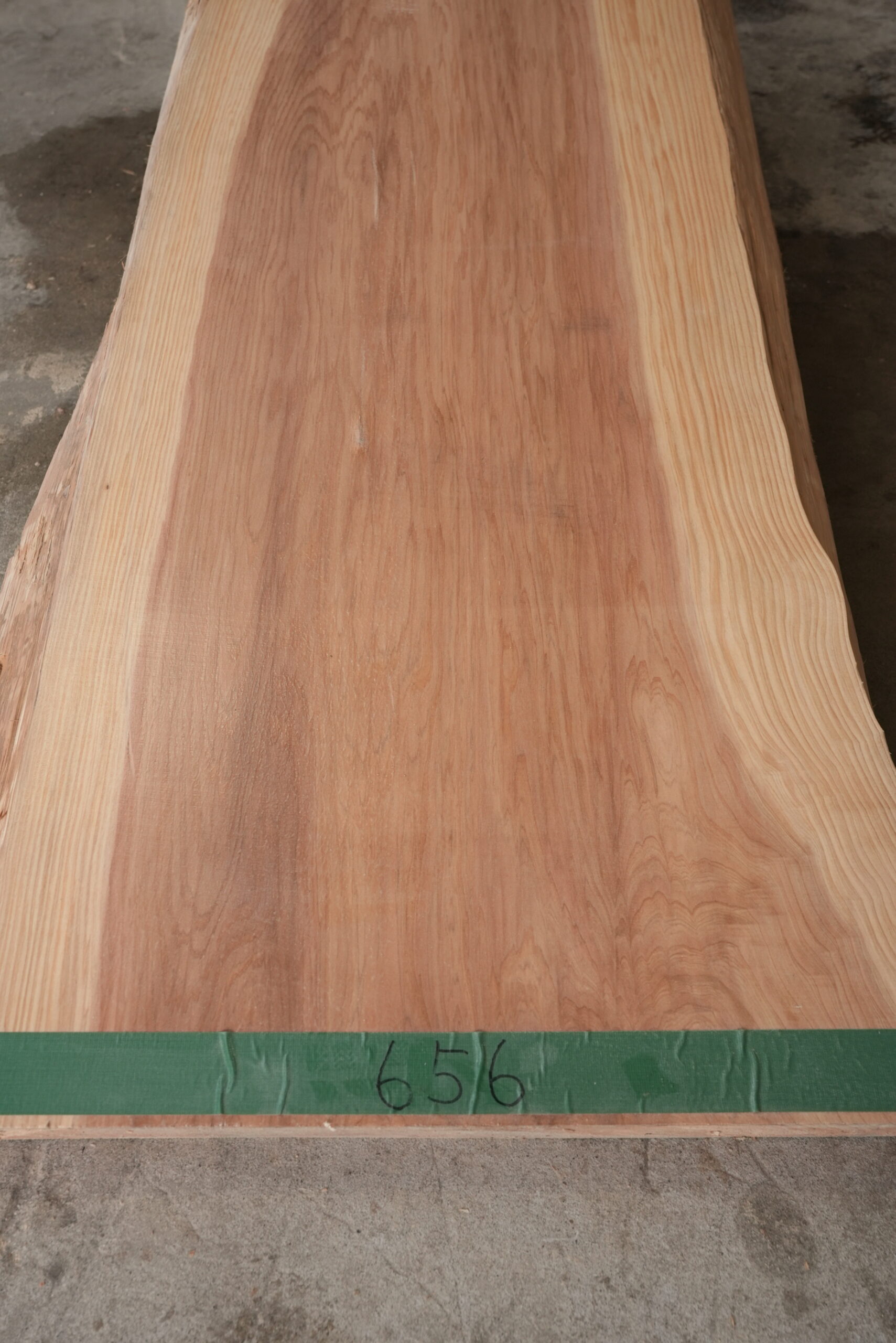 天然杉一枚板です。奥行が49㎝~62㎝ありますので一枚板カウンターに最適なサイズです。幅サイズは耳を含まない内々サイズです。長さが2000㎜あるので使い勝手が良い一枚板です。動きのある杢目も魅力的です。表面に割れ止めボンドを塗布していますがプレーナー掛けをすると落ちます。