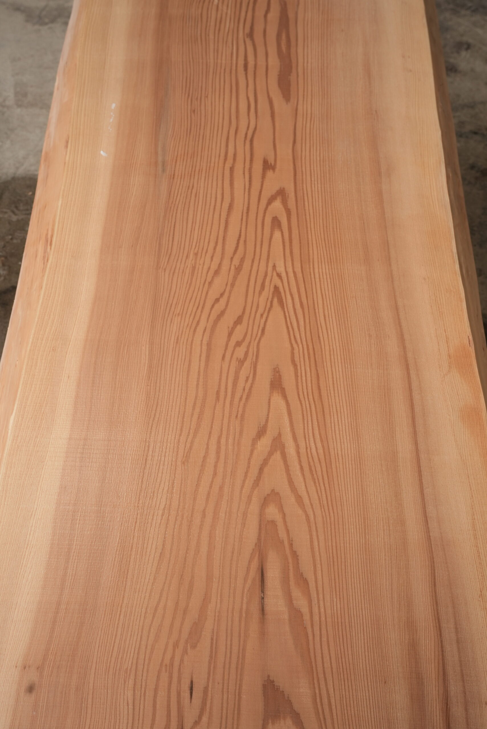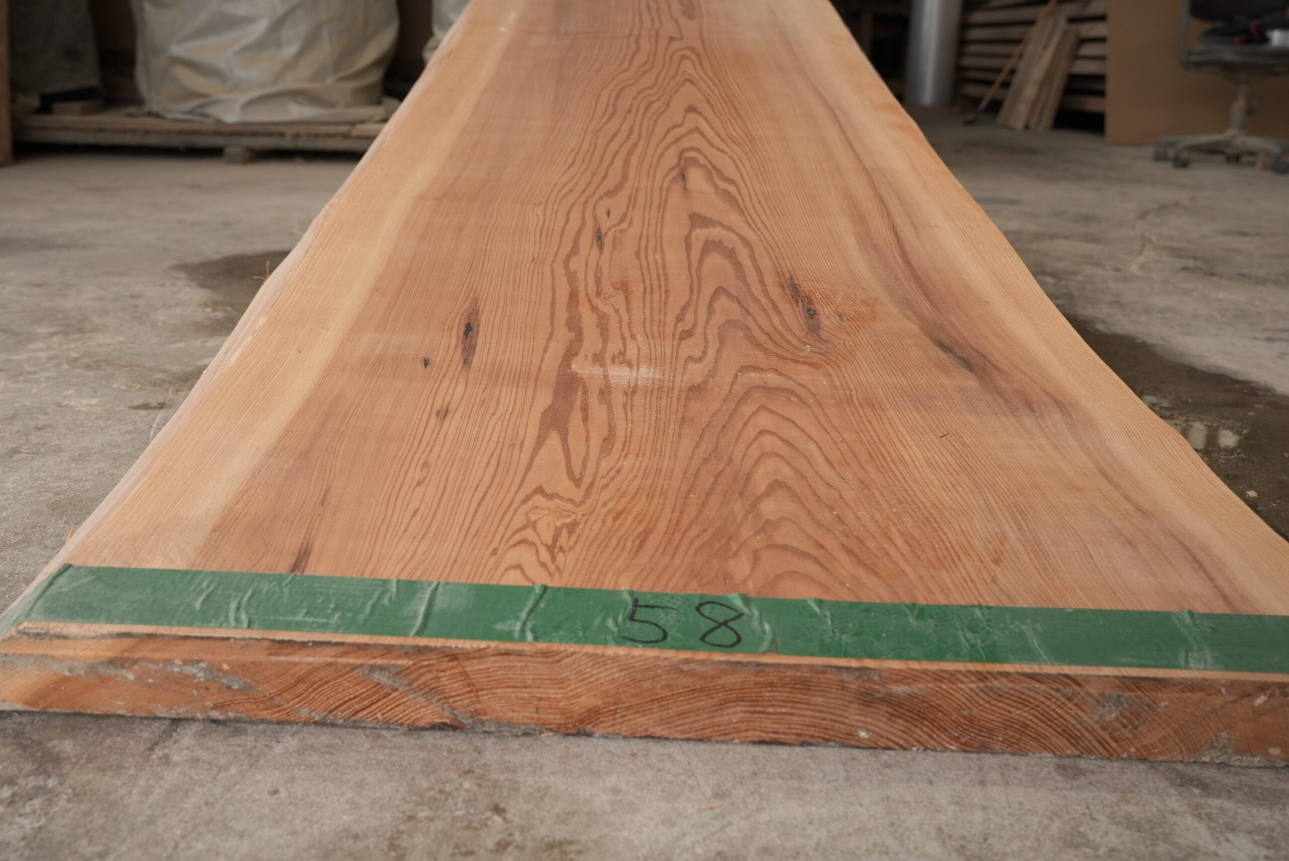 天然杉一枚板です。奥行が50㎝~71㎝ありますので一枚板カウンターに最適なサイズです。幅サイズは耳を含まない内々サイズです。長さが2200㎜あるので使い勝手が良い一枚板です。動きのある杢目も魅力的です。表面に割れ止めボンドを塗布していますがプレーナー掛けをすると落ちます。
