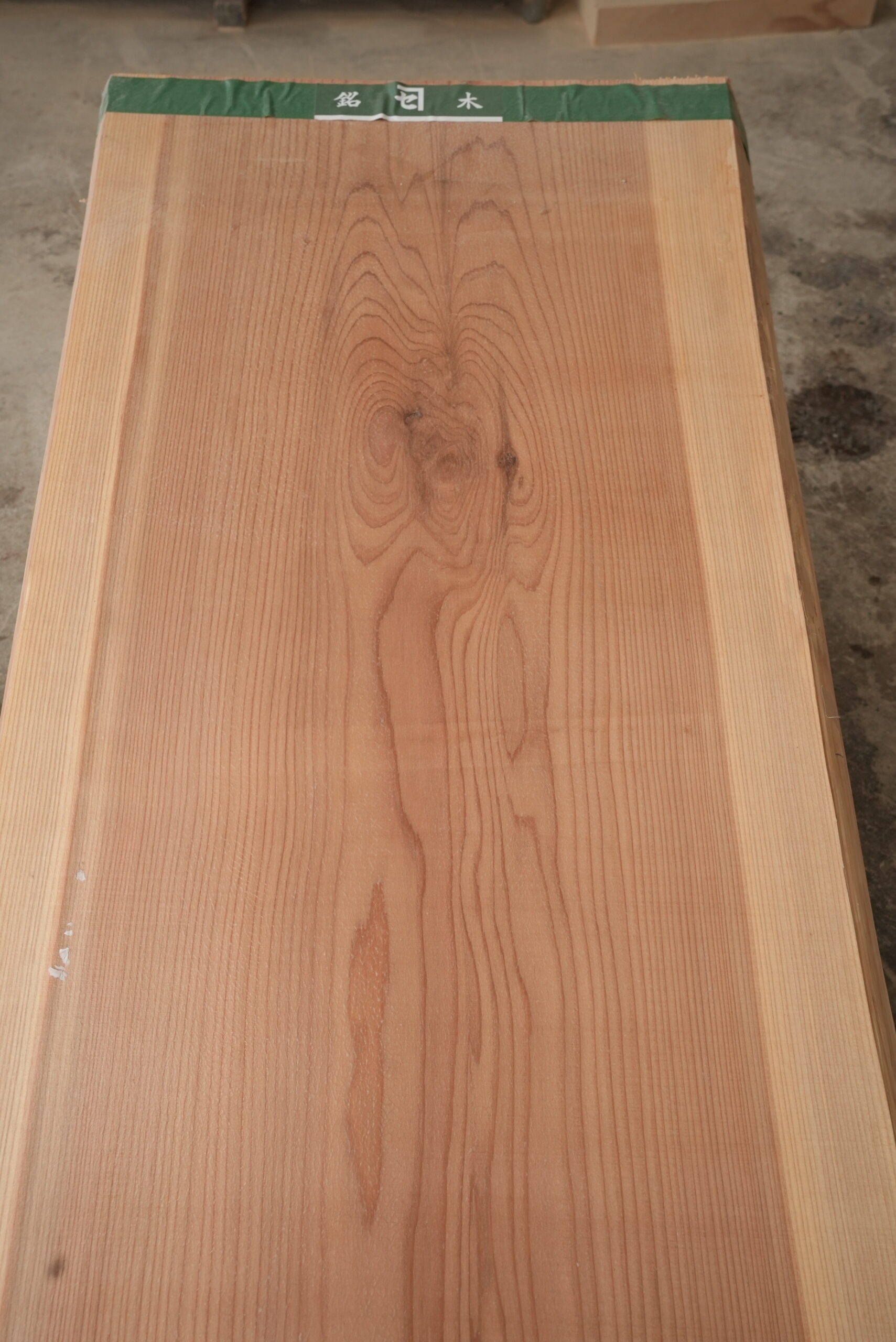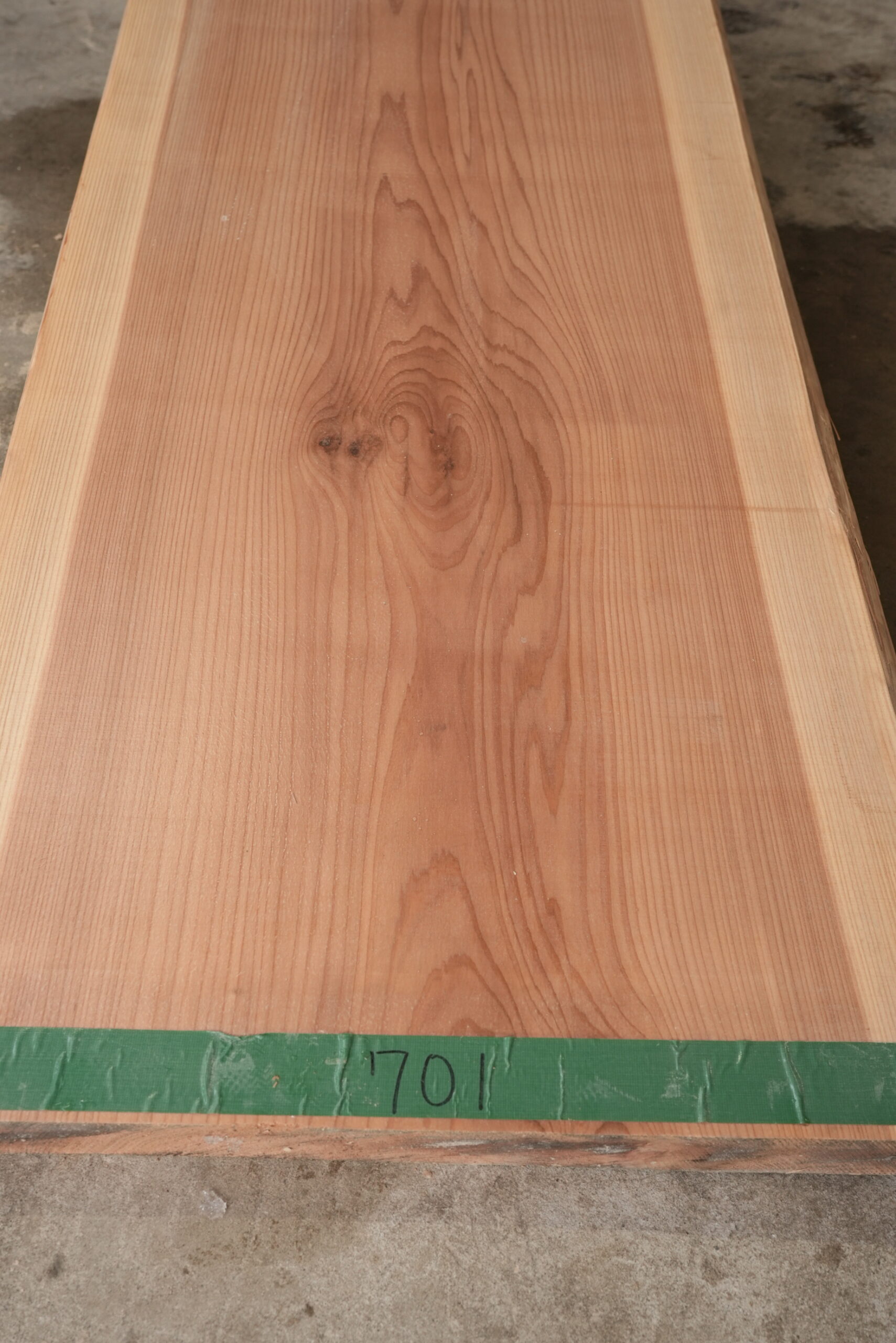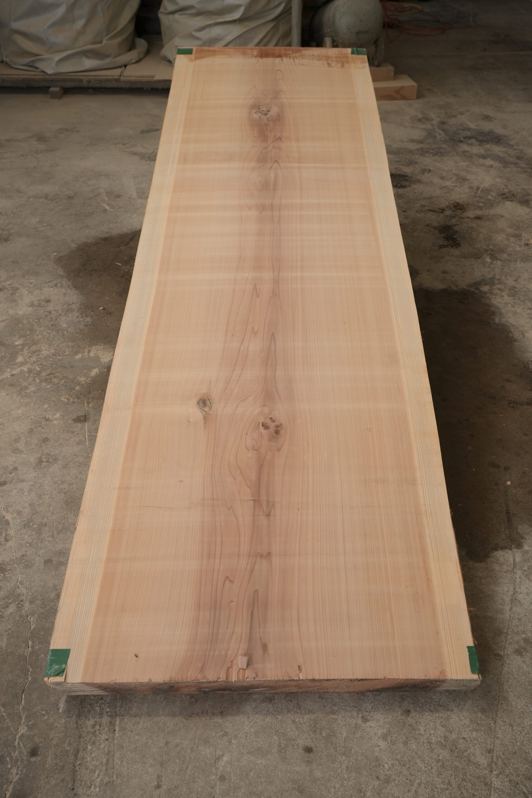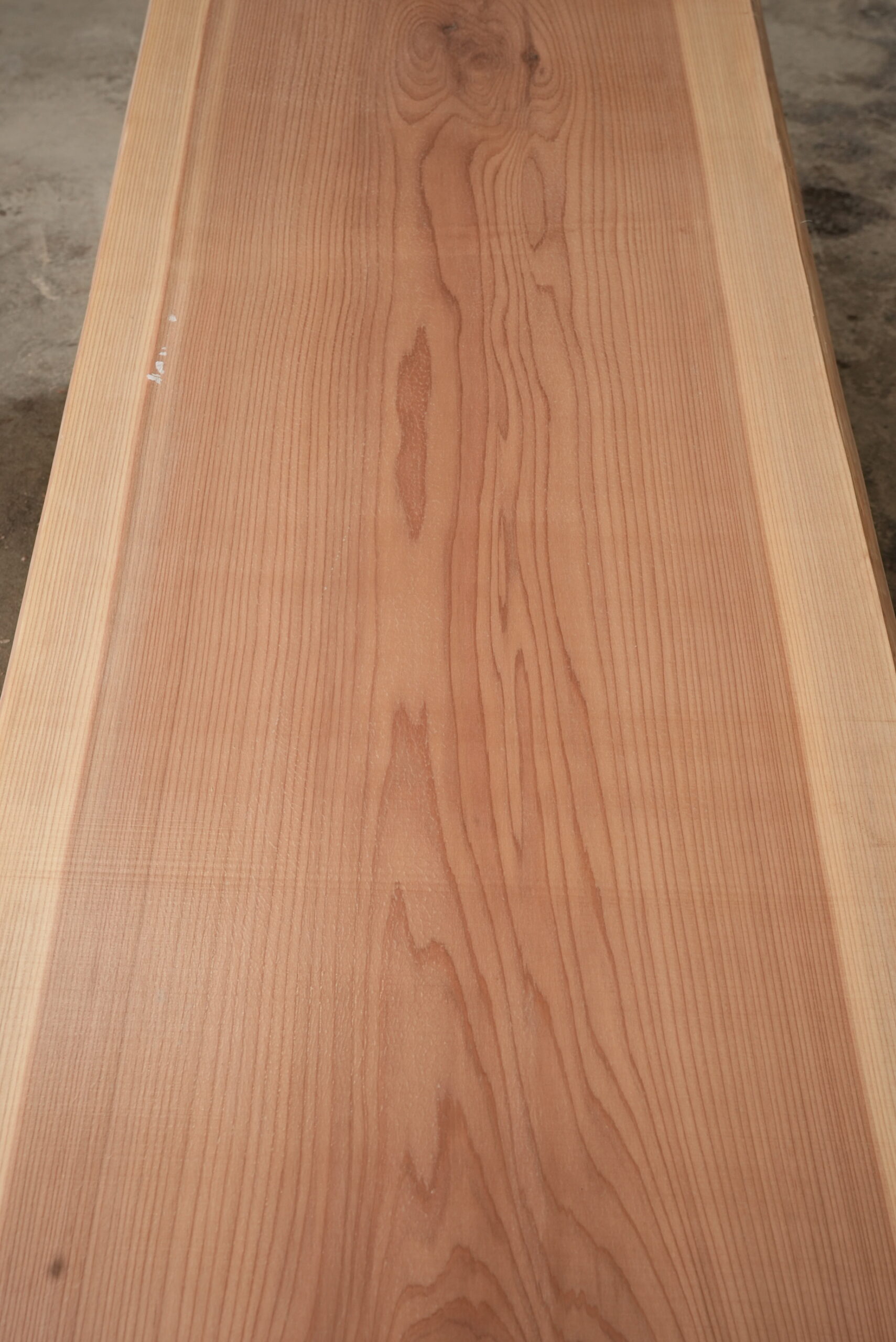 天然杉一枚板です。奥行が62㎝~69㎝ありますので一枚板カウンターに最適なサイズです。幅サイズは耳を含まない内々サイズです。長さが2250㎜あるので使い勝手が良い一枚板です。動きのある杢目も魅力的です。表面に割れ止めボンドを塗布していますがプレーナー掛けをすると落ちます。