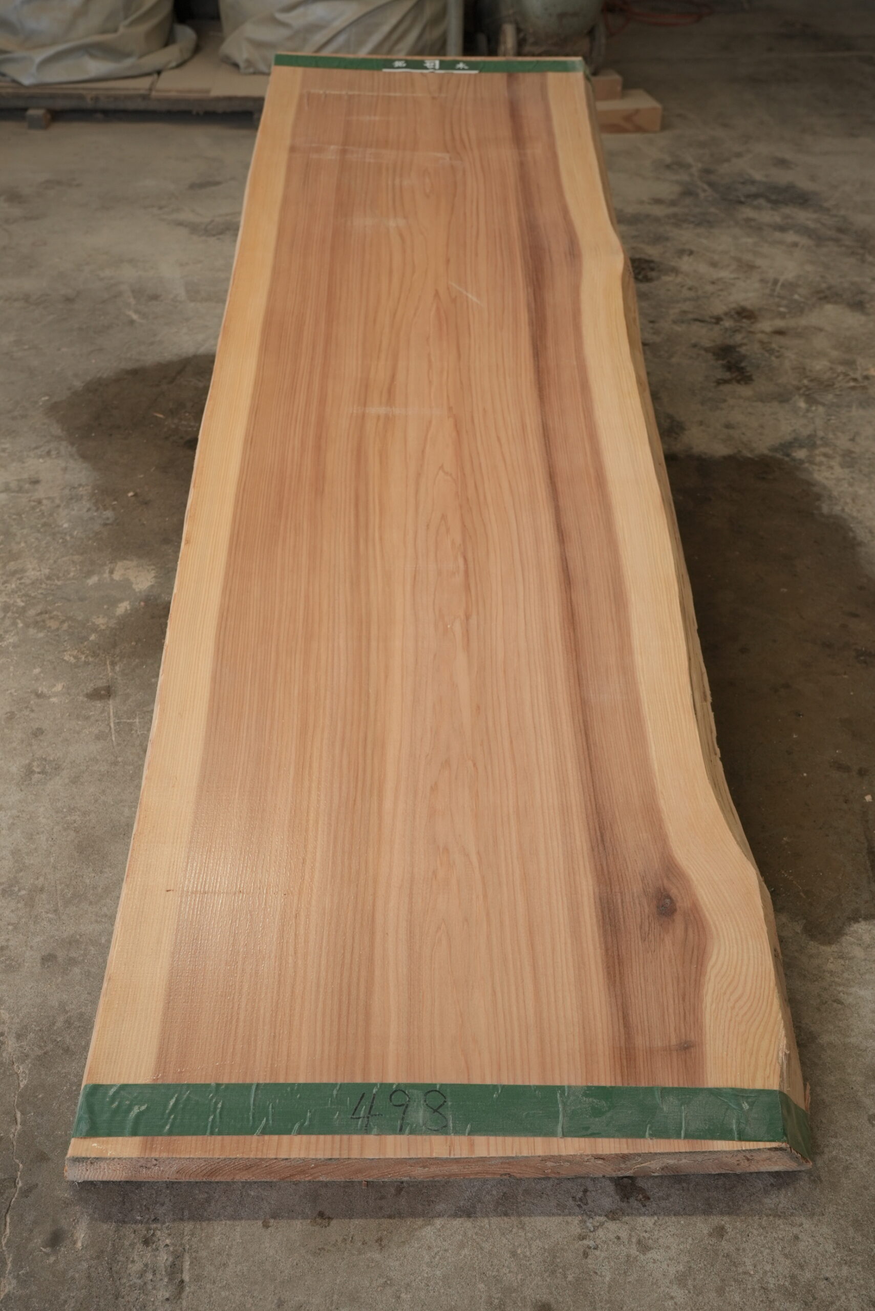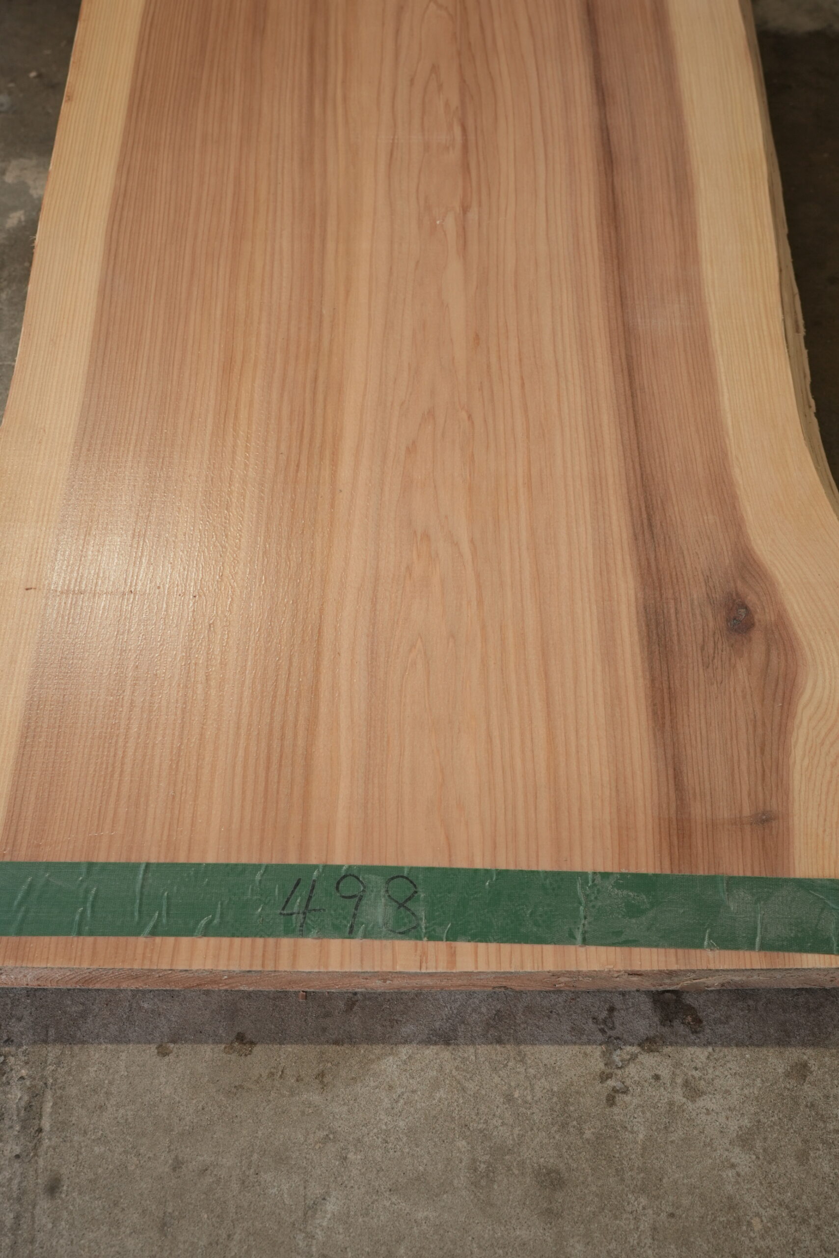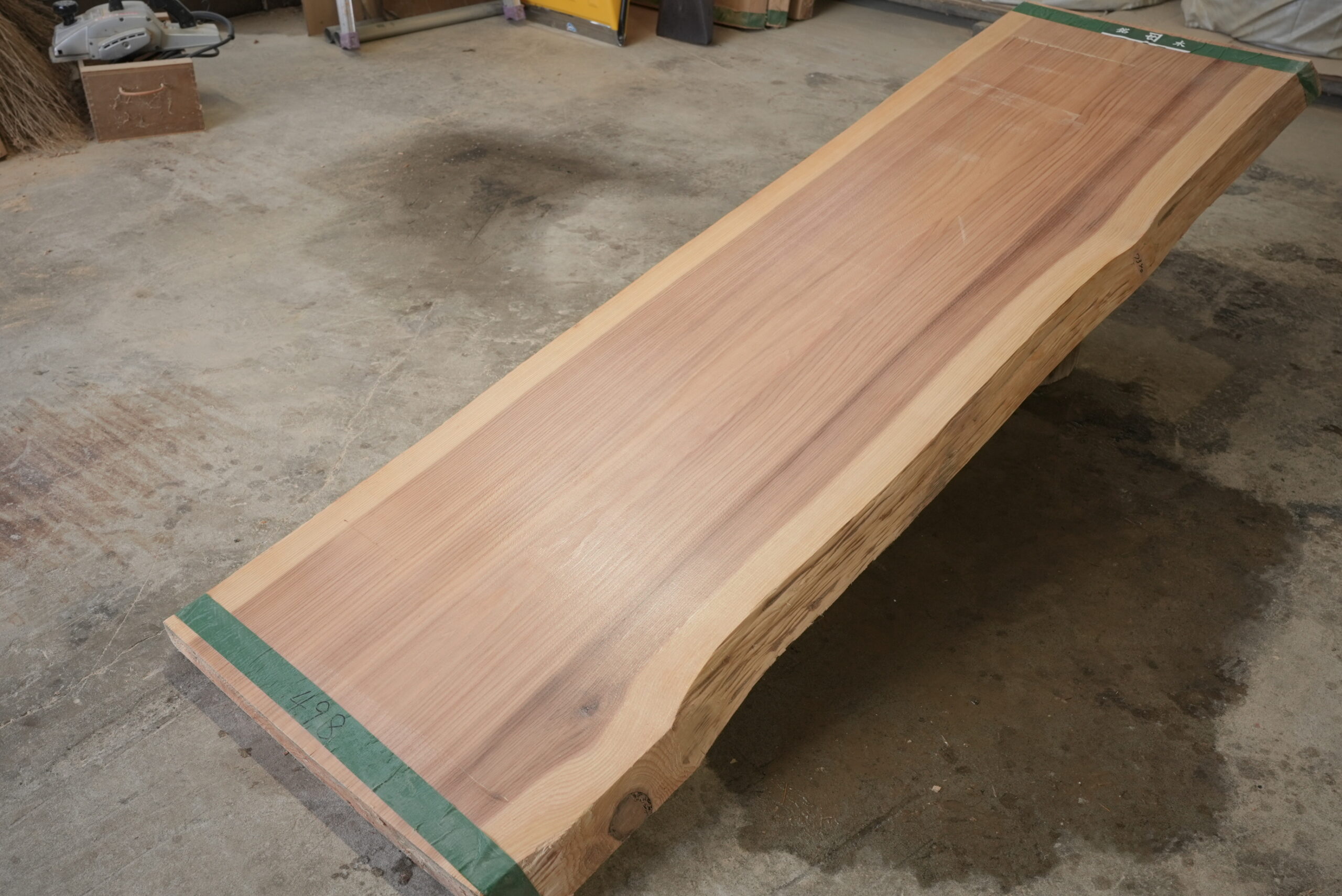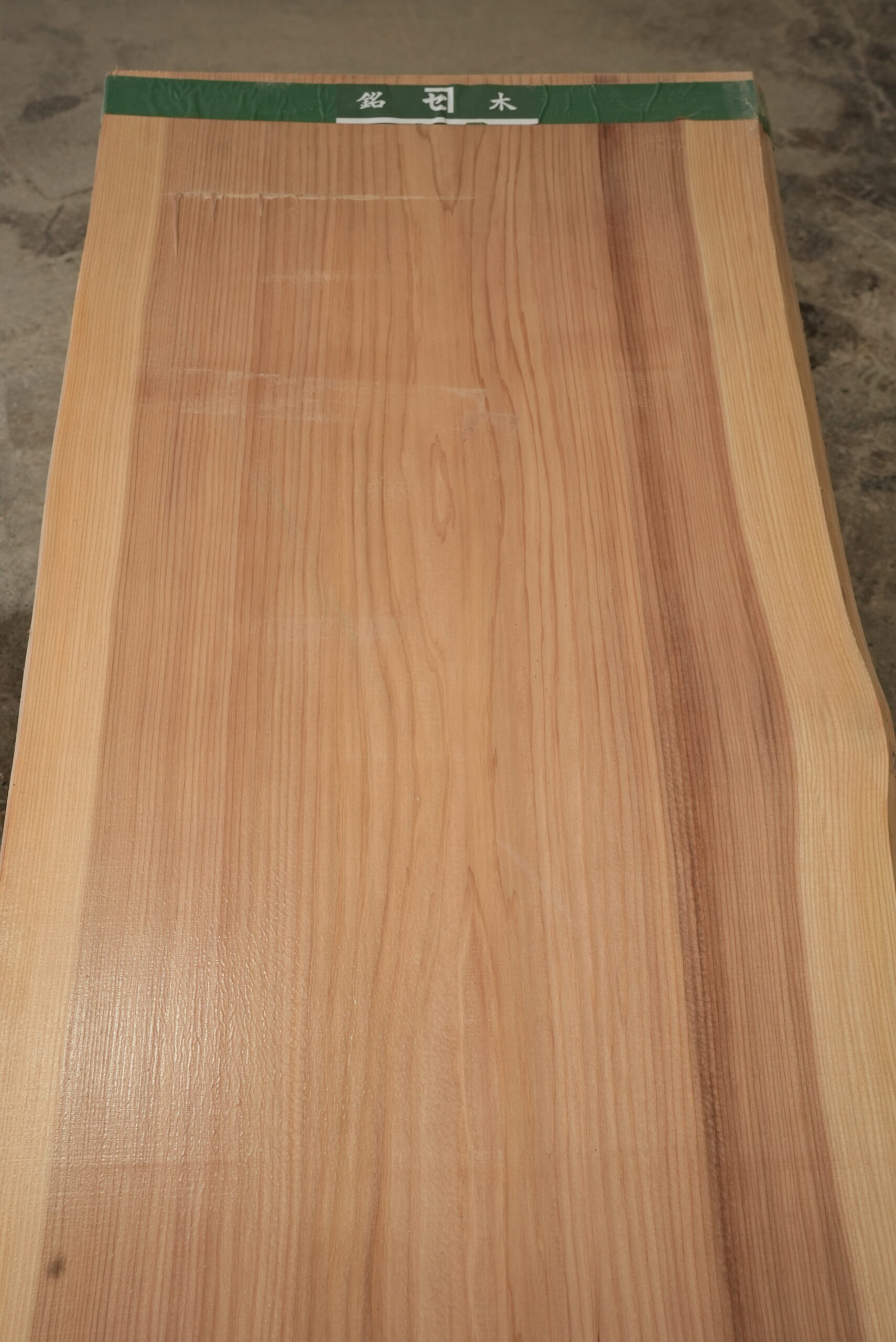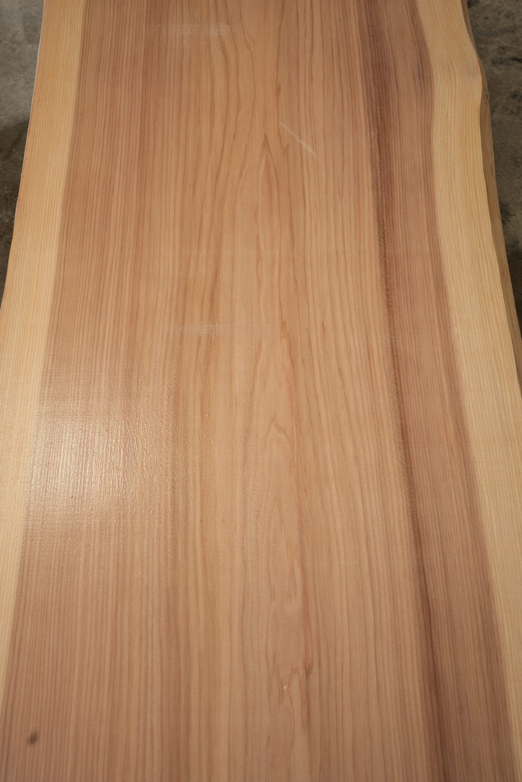 天然杉一枚板です。奥行が60㎝~67㎝ありますので一枚板カウンターに最適なサイズです。幅サイズは耳を含まない内々サイズです。長さが2100㎜あるので使い勝手が良い一枚板です。上品な杢目も魅力的です。表面に割れ止めボンドを塗布していますがプレーナー掛けをすると落ちます。