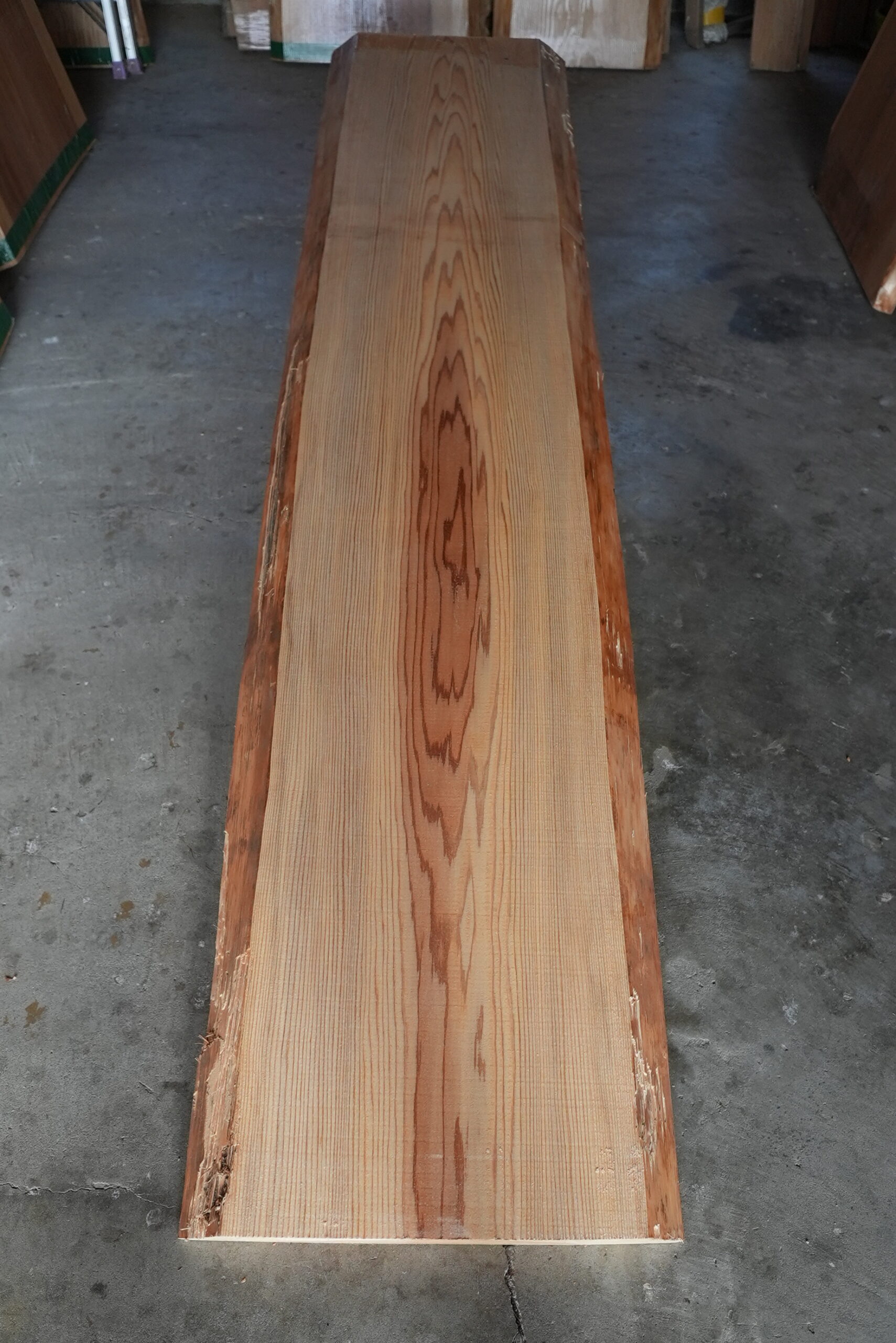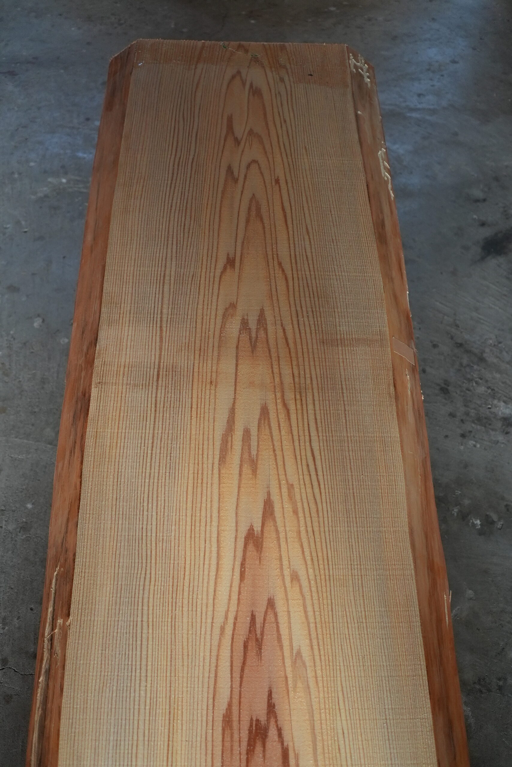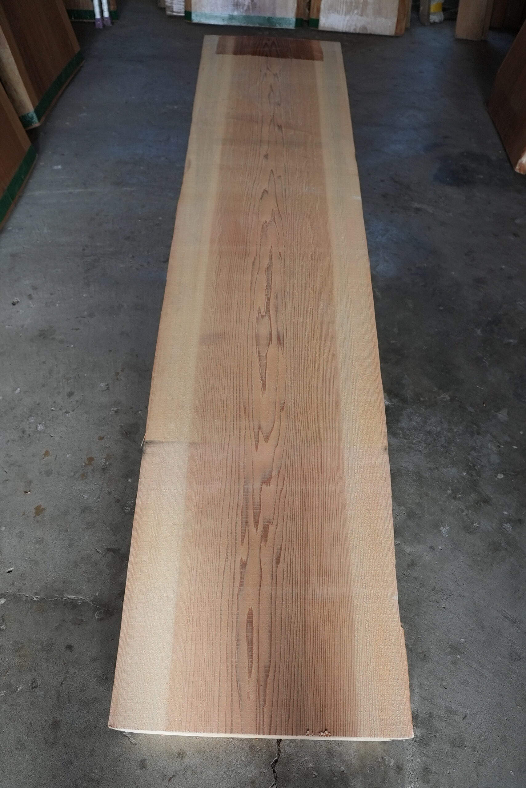 天然杉一枚板です。上品な杢目が付いた一枚板です。カウンター、ディスプレー用棚板等にいかがでしょうか。思った以上に使い勝手が良い一枚板です。プレーナー掛け、オイル塗装をすると素晴らしくなります。 耳部分も自然な感じが出ています。幅サイズは耳を含まない内々サイズです。