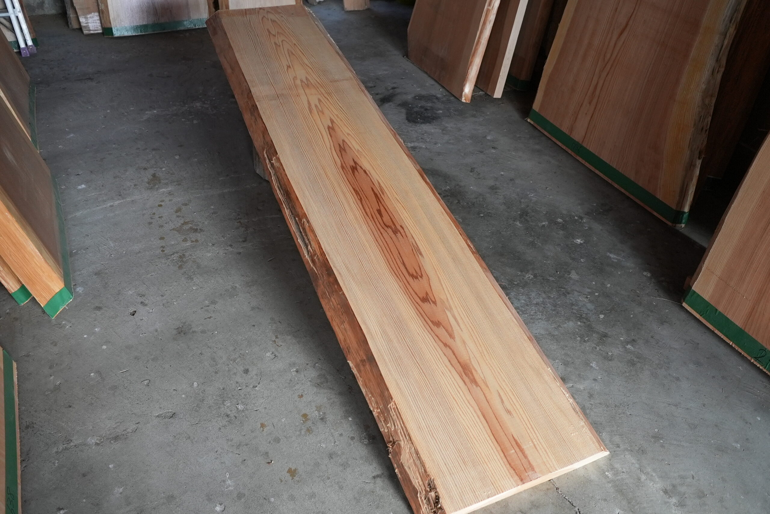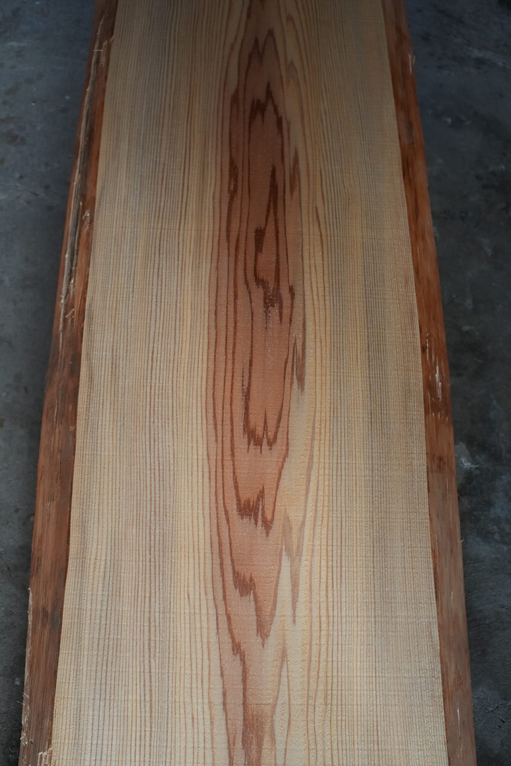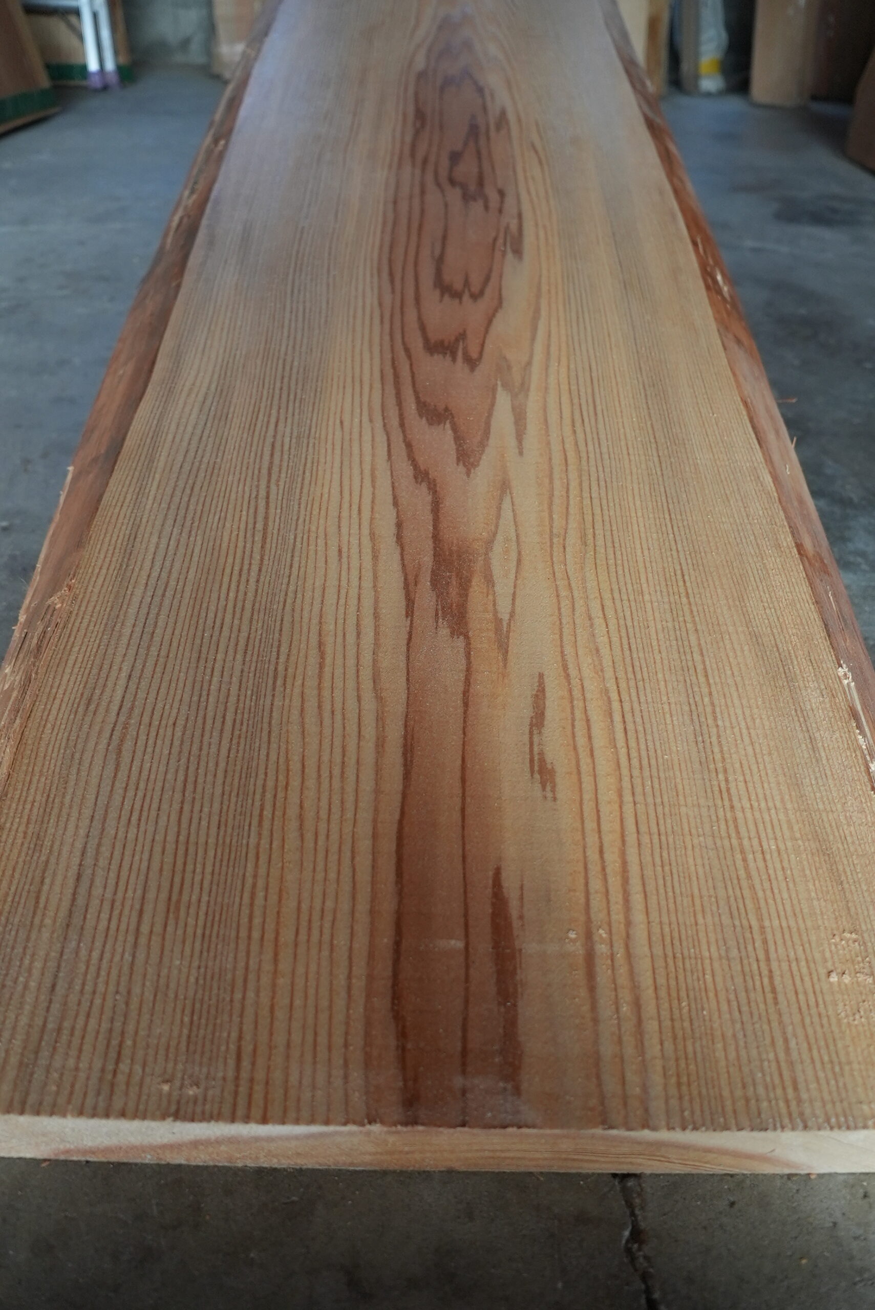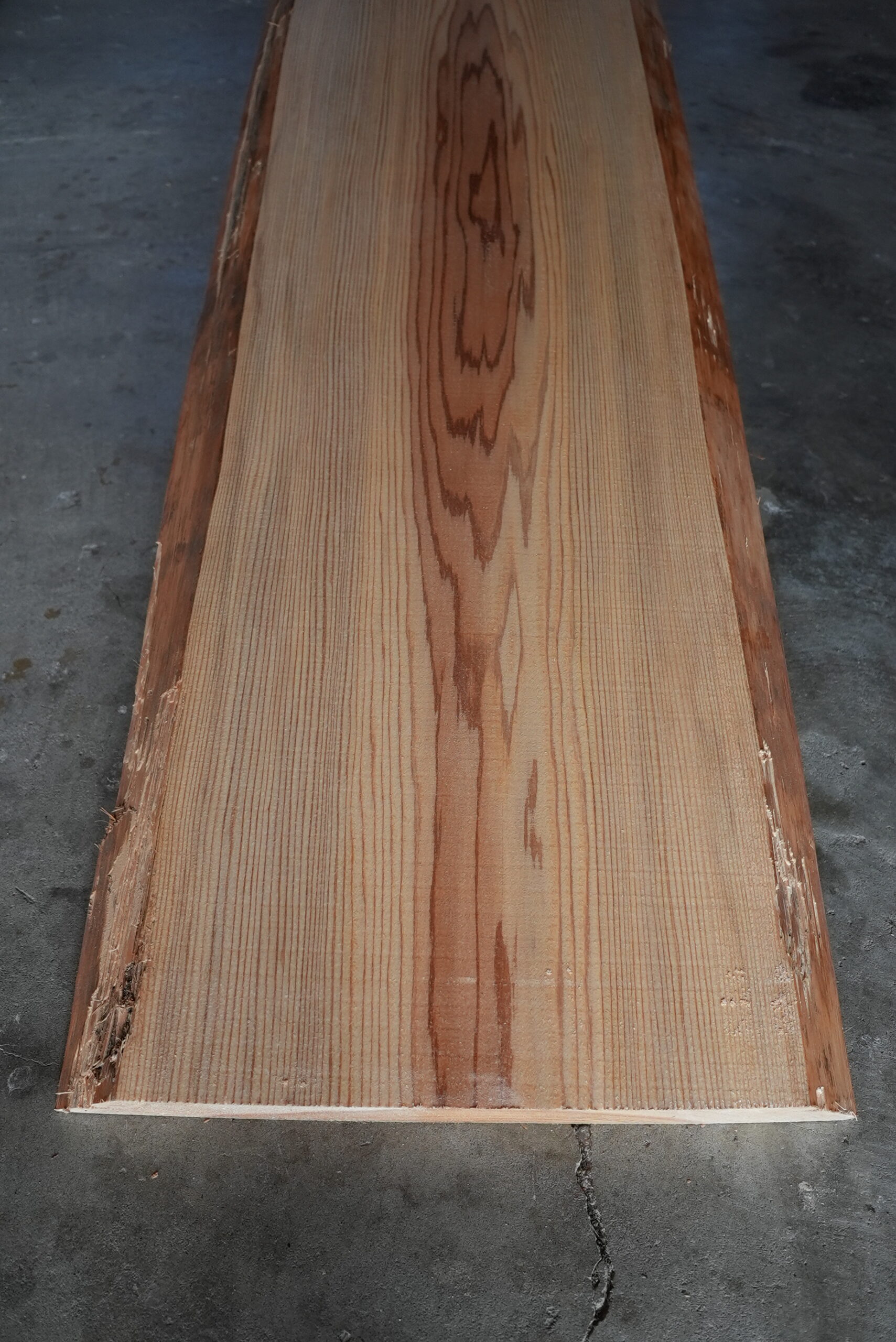 天然杉一枚板です。上品な杢目が付いた一枚板です。カウンター、ディスプレー用棚板等にいかがでしょうか。思った以上に使い勝手が良い一枚板です。プレーナー掛け、オイル塗装をすると素晴らしくなります。 耳部分も自然な感じが出ています。幅サイズは耳を含まない内々サイズです。