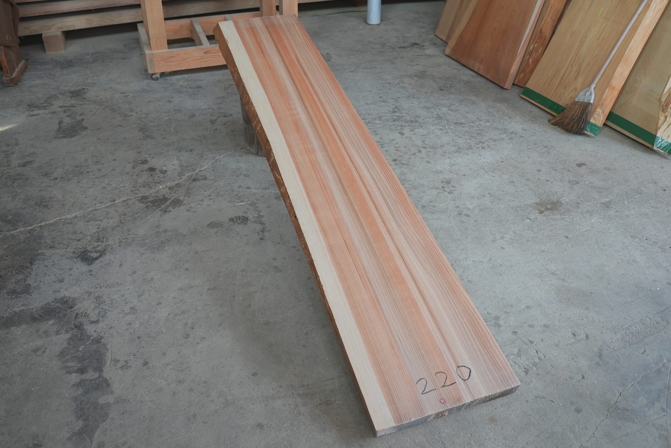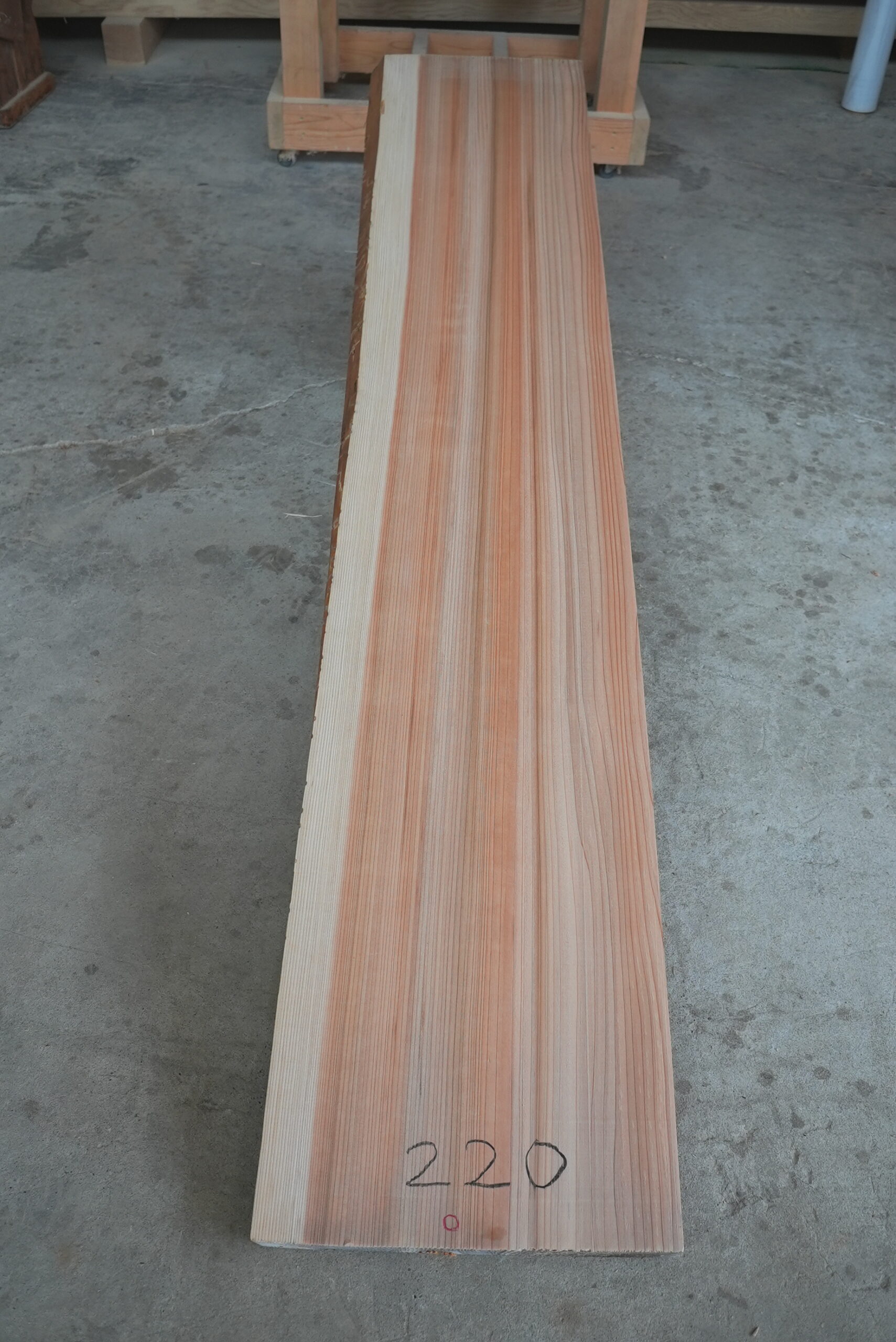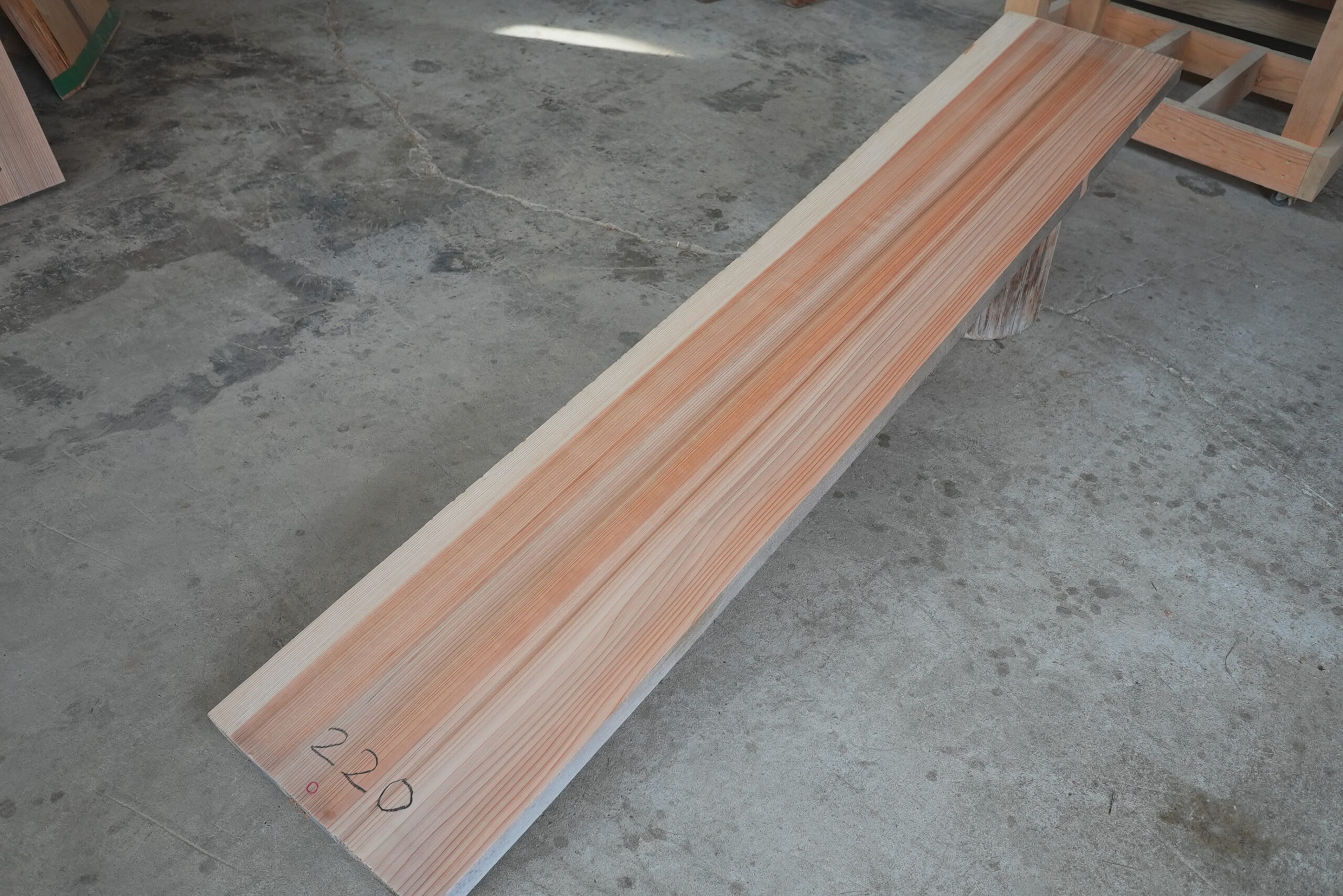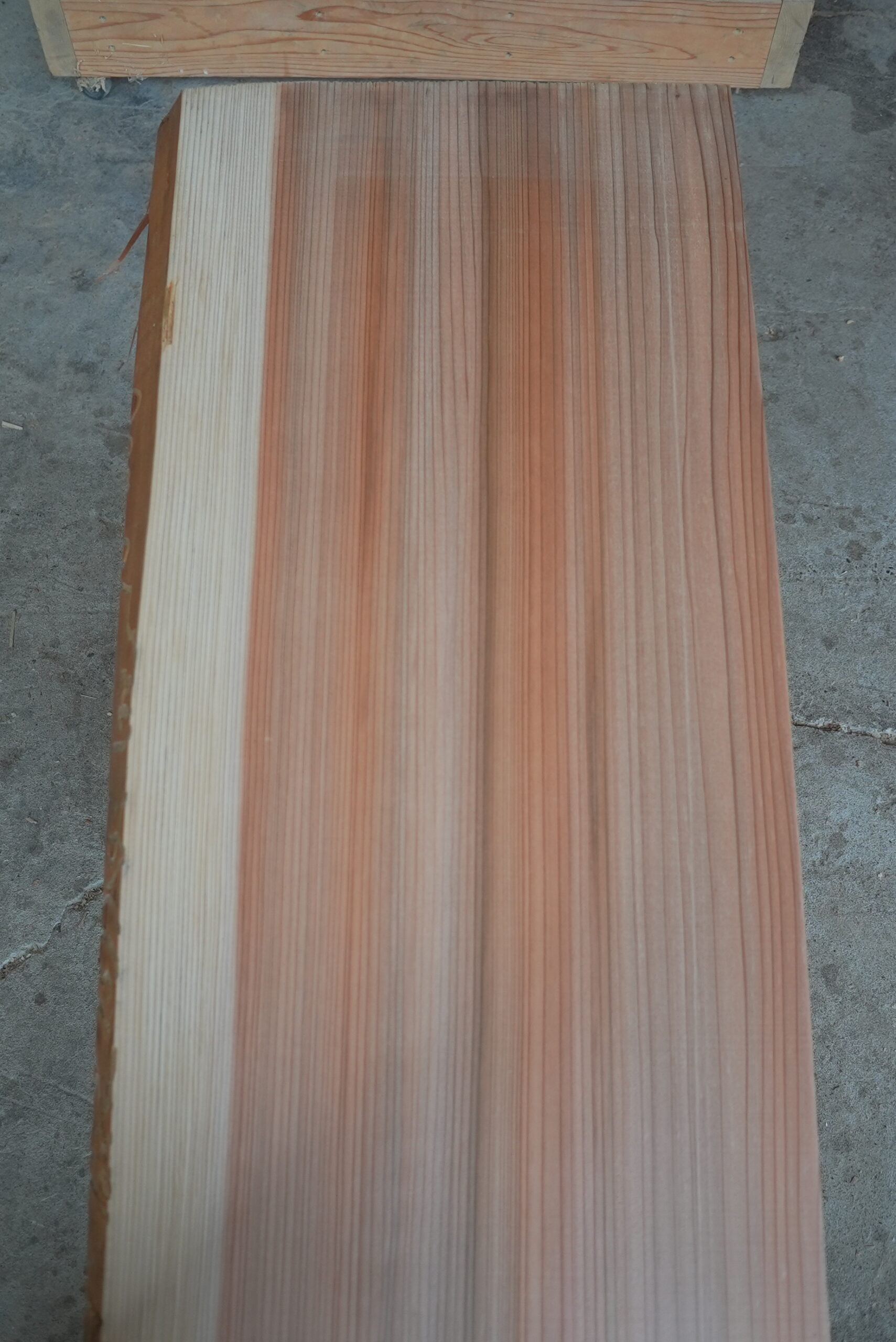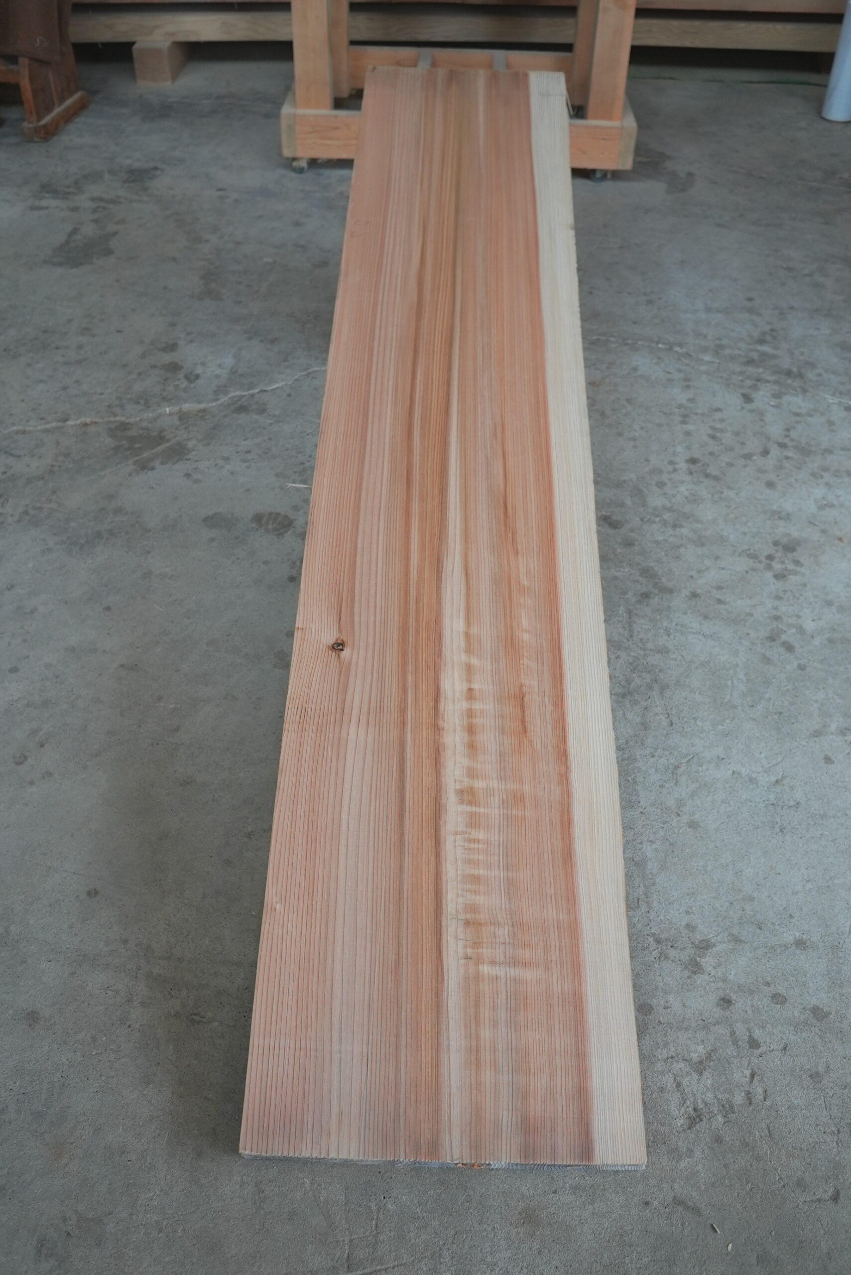 天然杉片耳柾厚板です。これ程柾幅の広い一枚板は幾多に見られません。赤身が縞がある特徴のある色合いの一枚板です。インパクトがあります。プレーナー掛け、オイル塗装をすると素晴らしく綺麗になります。カウンター材、ベンチ、テレビボード等にいかがでしょうか。