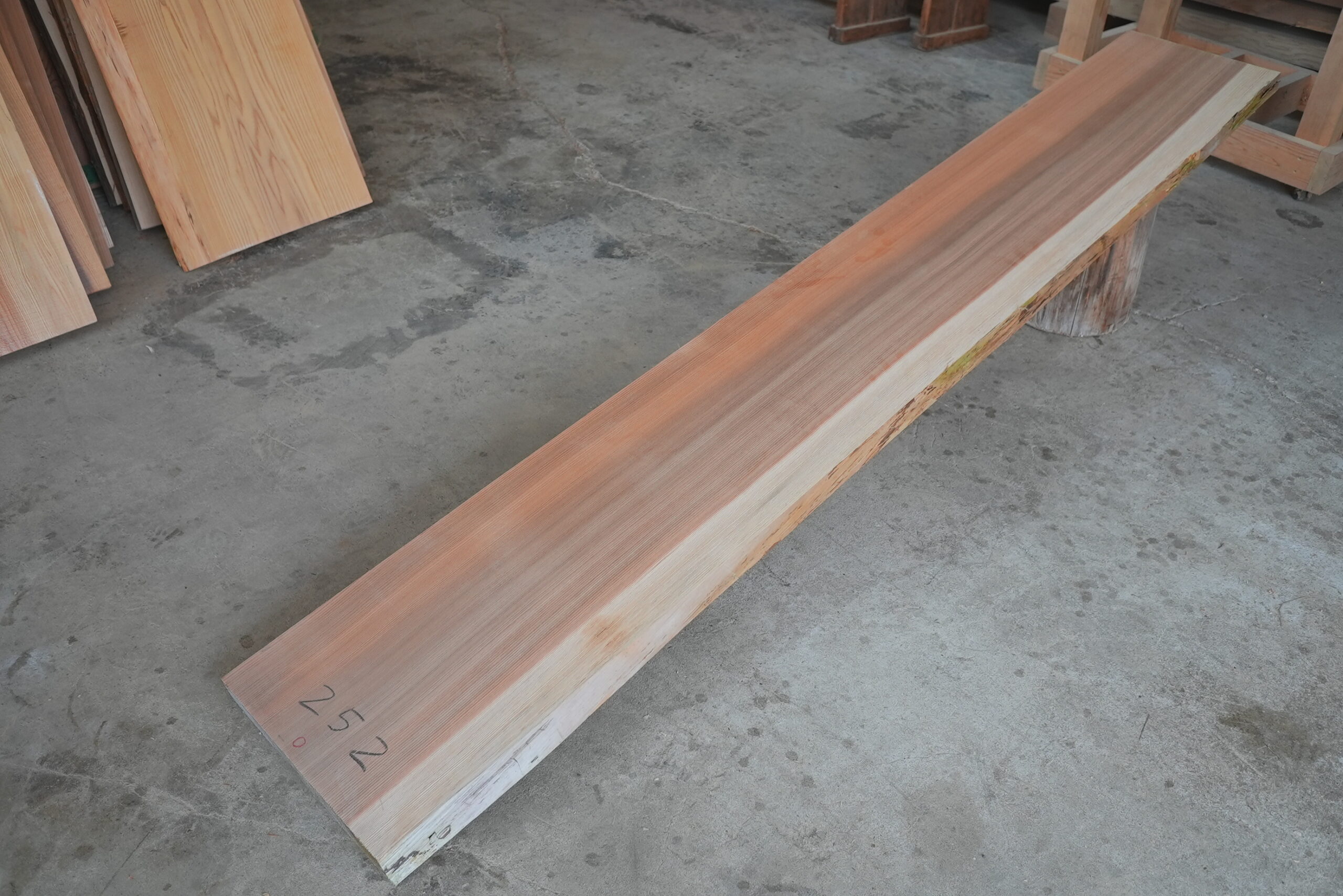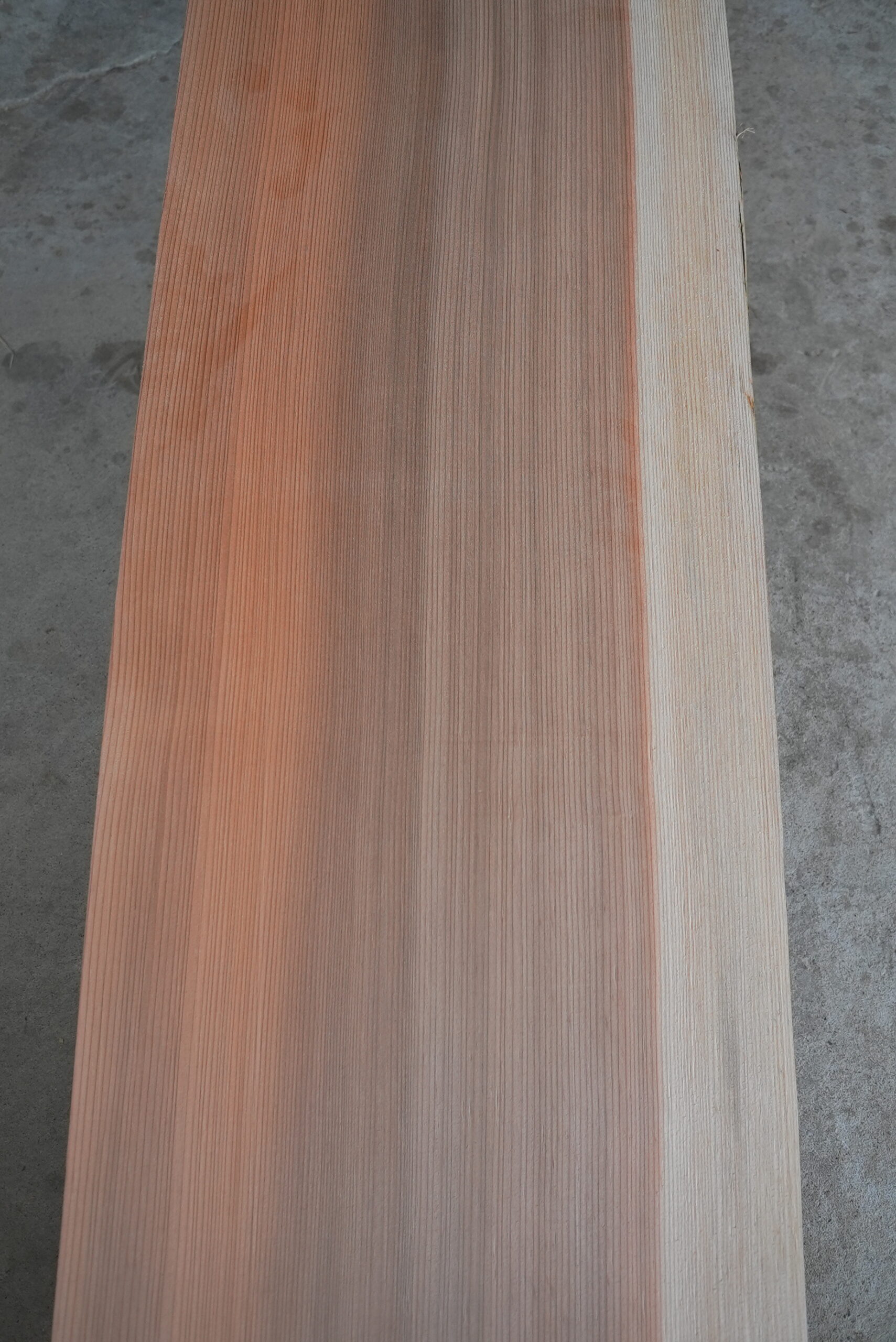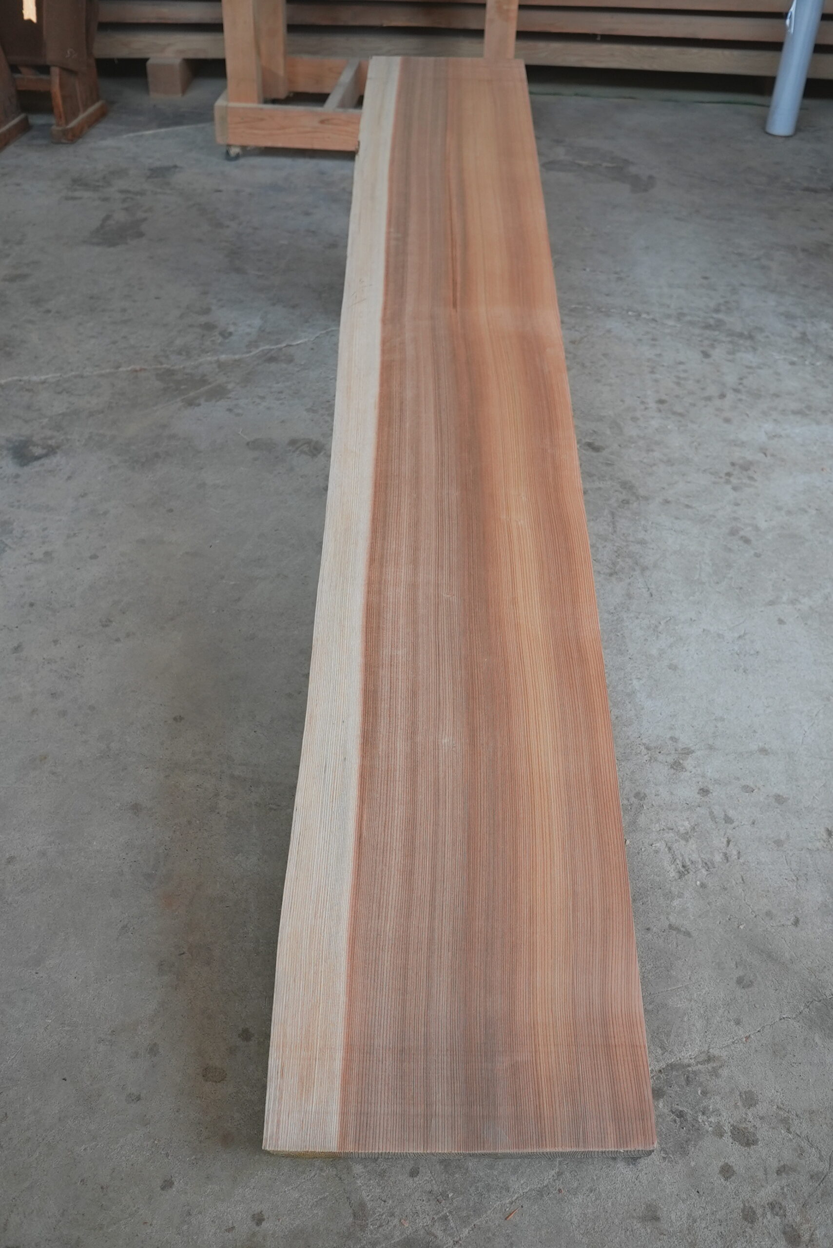 天然杉片耳柾厚板です。右側に耳が付いていて左側はストレートになっています。壁にピッタリ合わせられます。奥行が380㎜~390㎜ありますのでキッチンカウンター等にいかがでしょうか。長さは2450㎜あります。プレーナー掛け、オイル塗装をすると素晴らしくなります。色合いはシックな感じです。