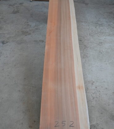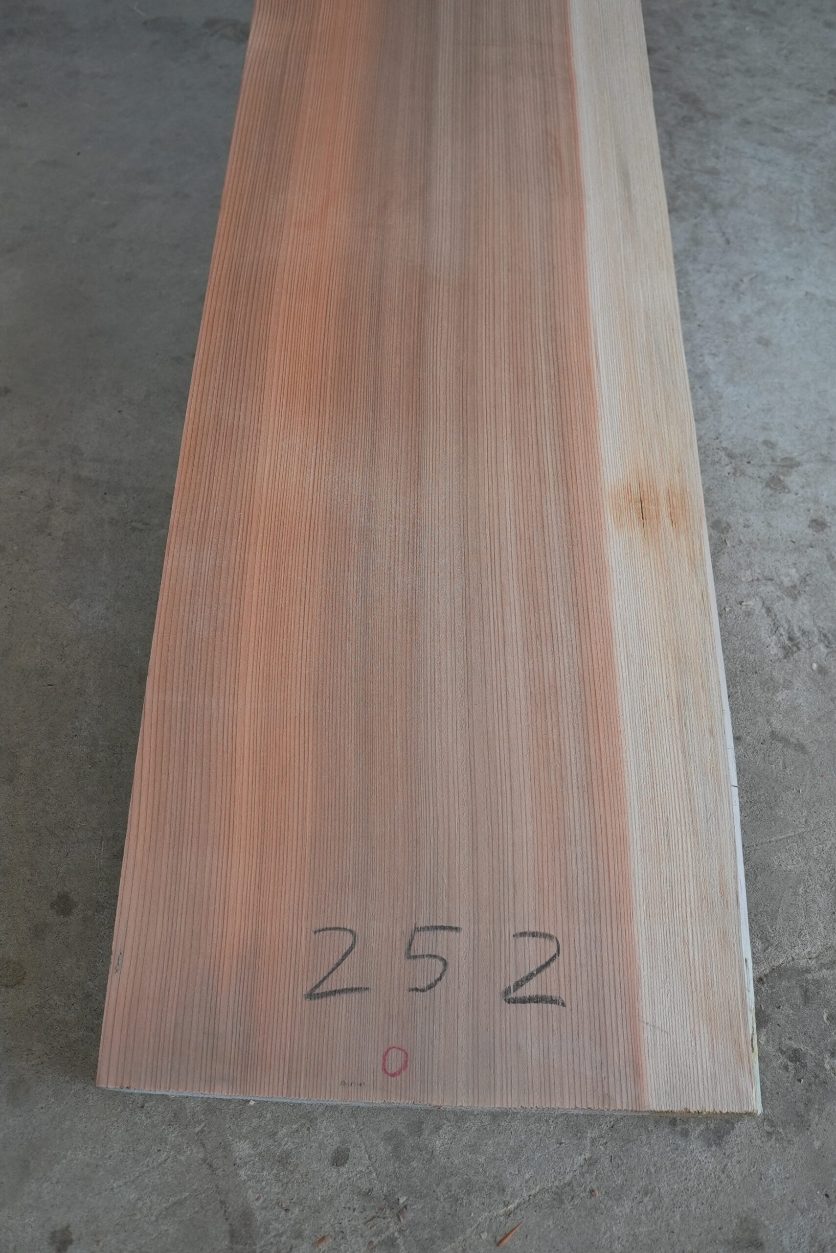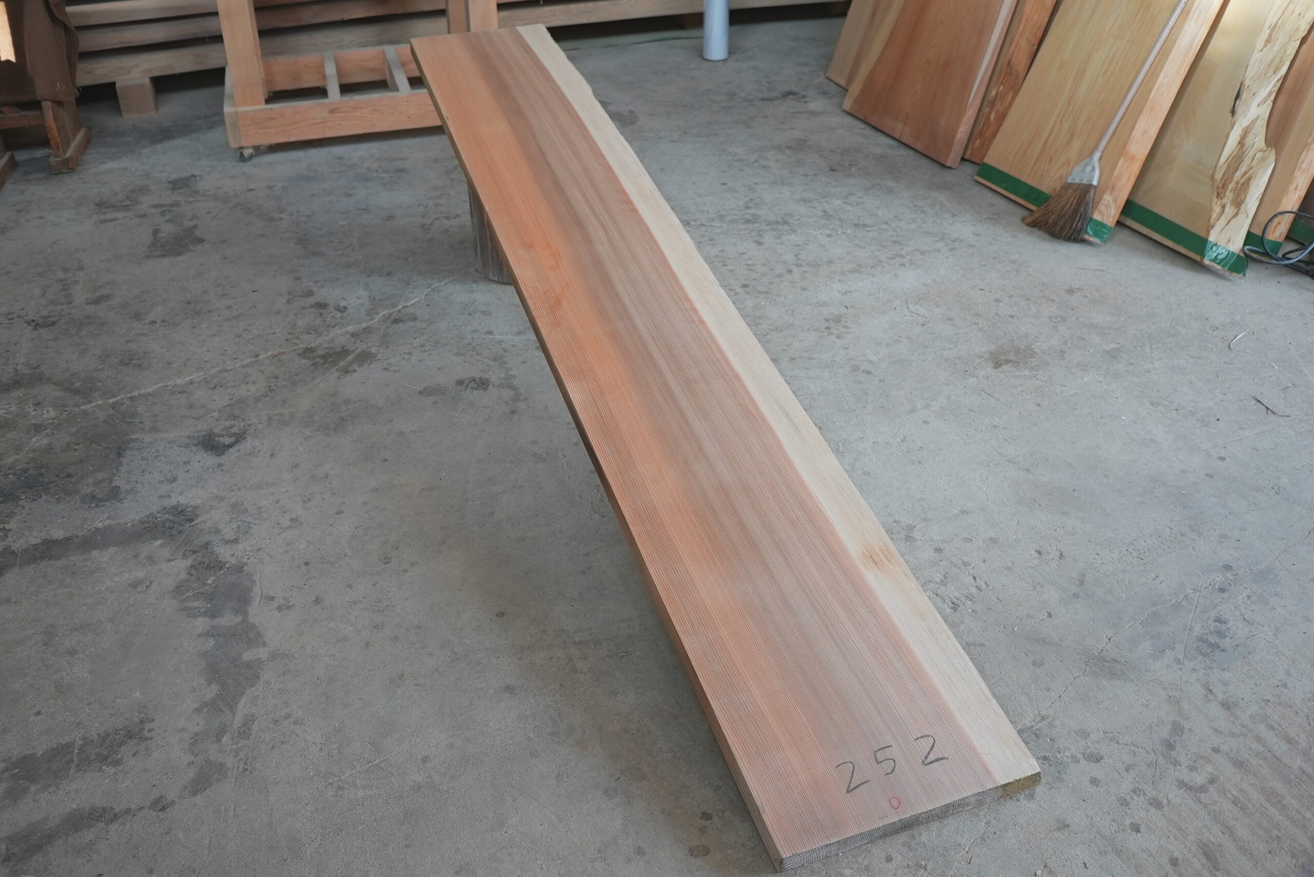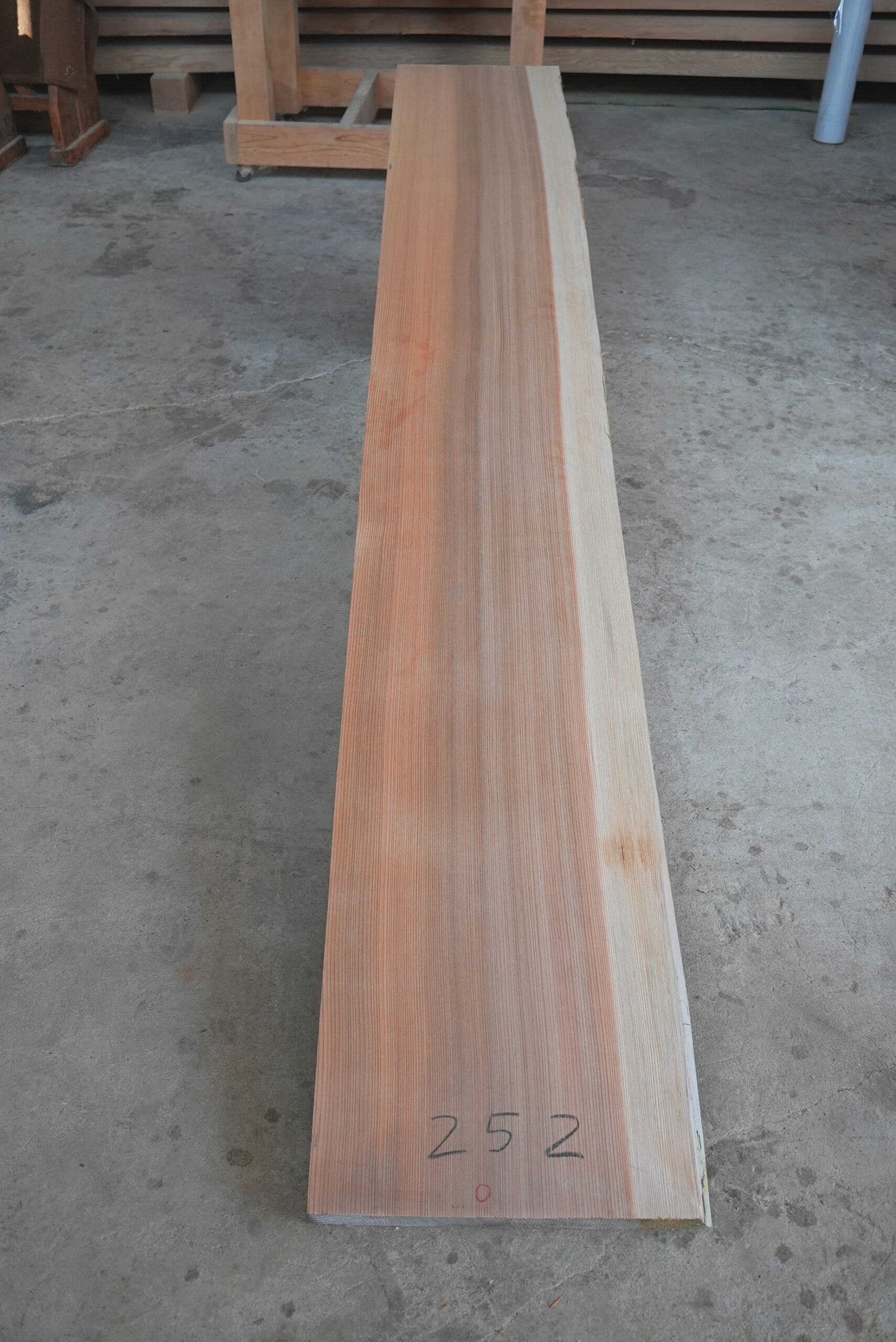 天然杉片耳柾厚板です。右側に耳が付いていて左側はストレートになっています。壁にピッタリ合わせられます。奥行が380㎜~390㎜ありますのでキッチンカウンター等にいかがでしょうか。長さは2450㎜あります。プレーナー掛け、オイル塗装をすると素晴らしくなります。色合いはシックな感じです。