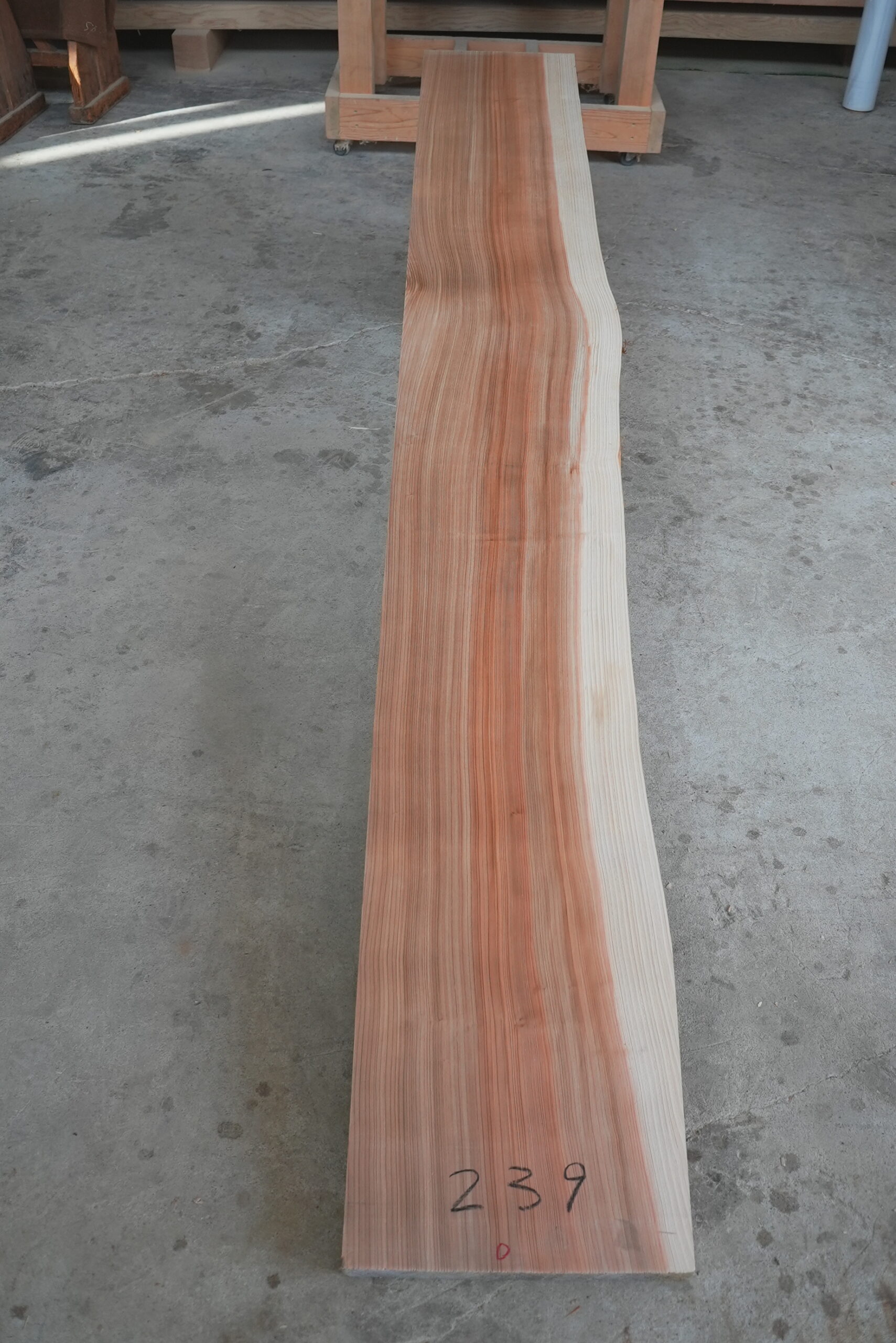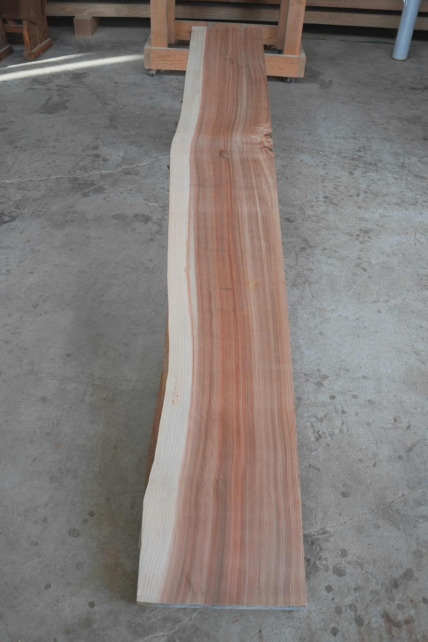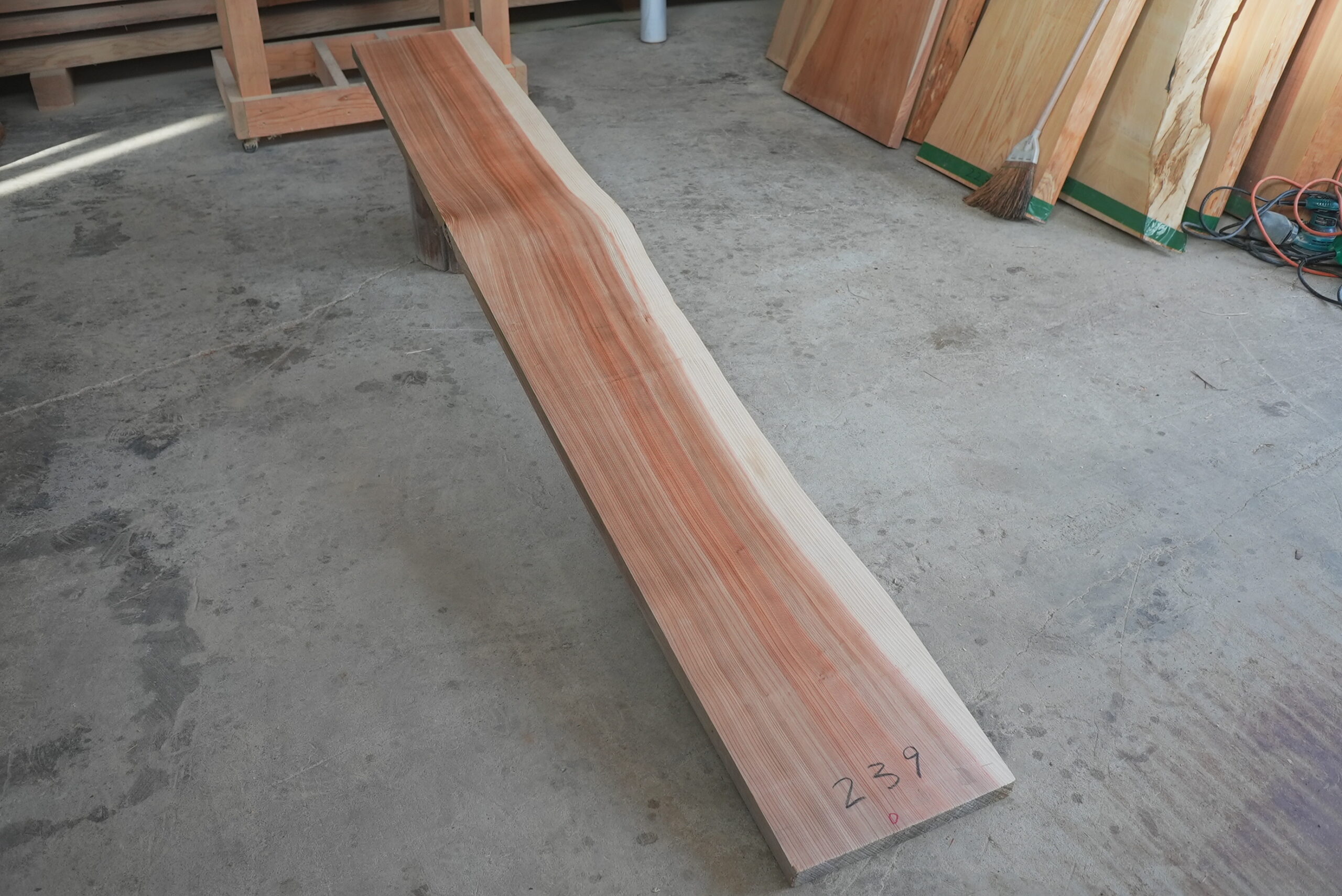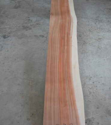 天然杉片耳柾厚板です。右側に耳が付いていて左側はストレートになっています。壁にピッタリ合わせられます。奥行が330㎜~370㎜ありますのでキッチンカウンター等にいかがでしょうか。長さは2450㎜あります。プレーナー掛け、オイル塗装をすると素晴らしくなります。色合いはシックな感じです。