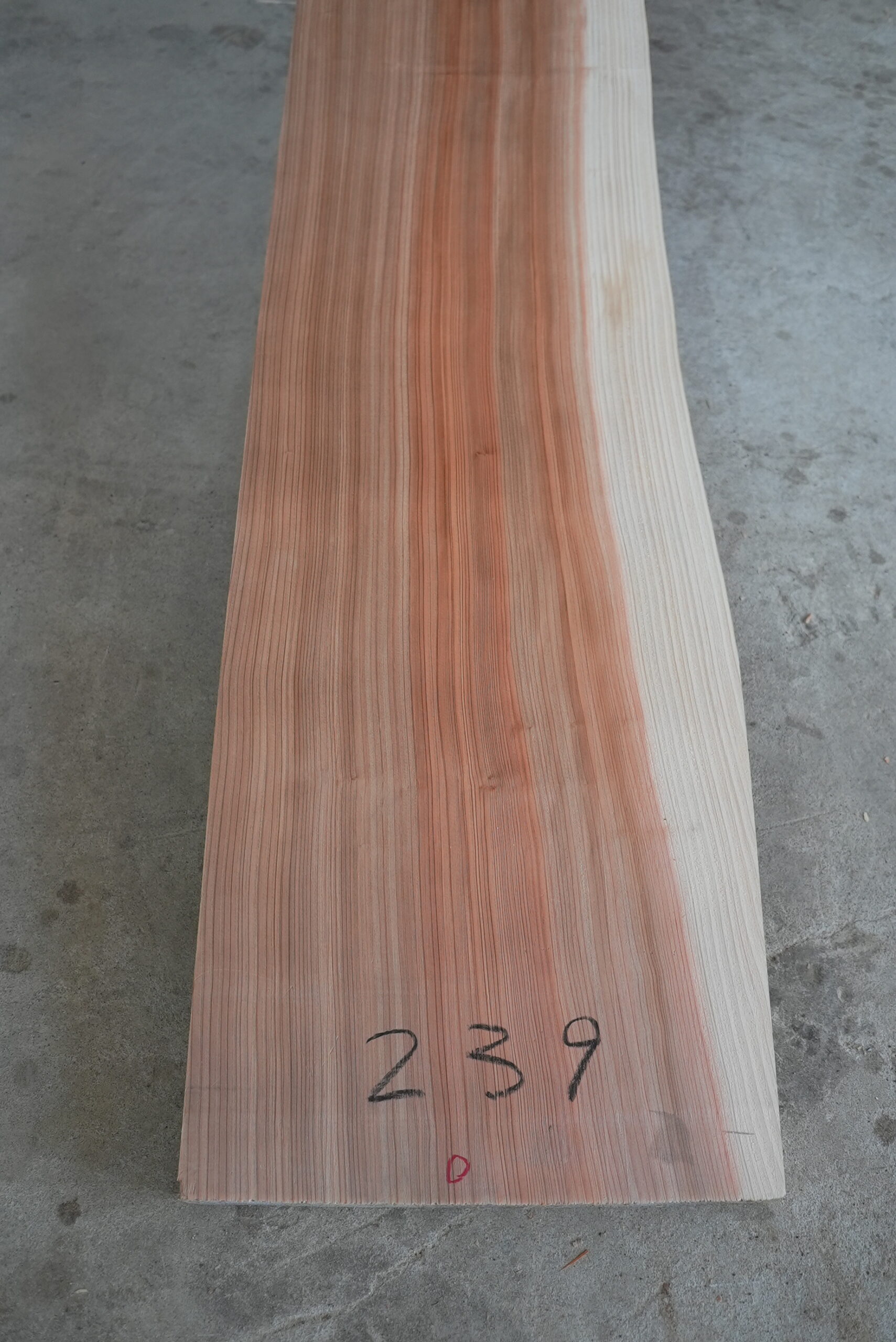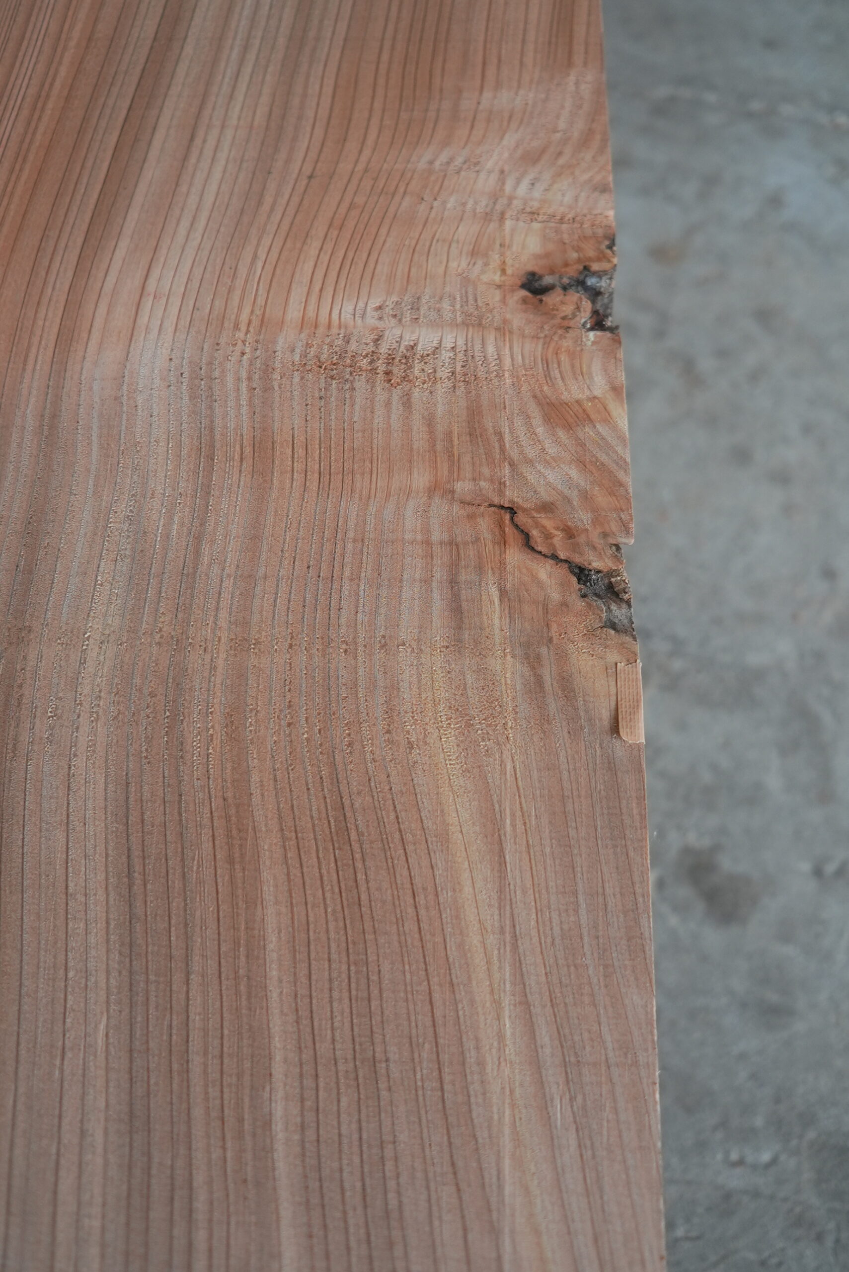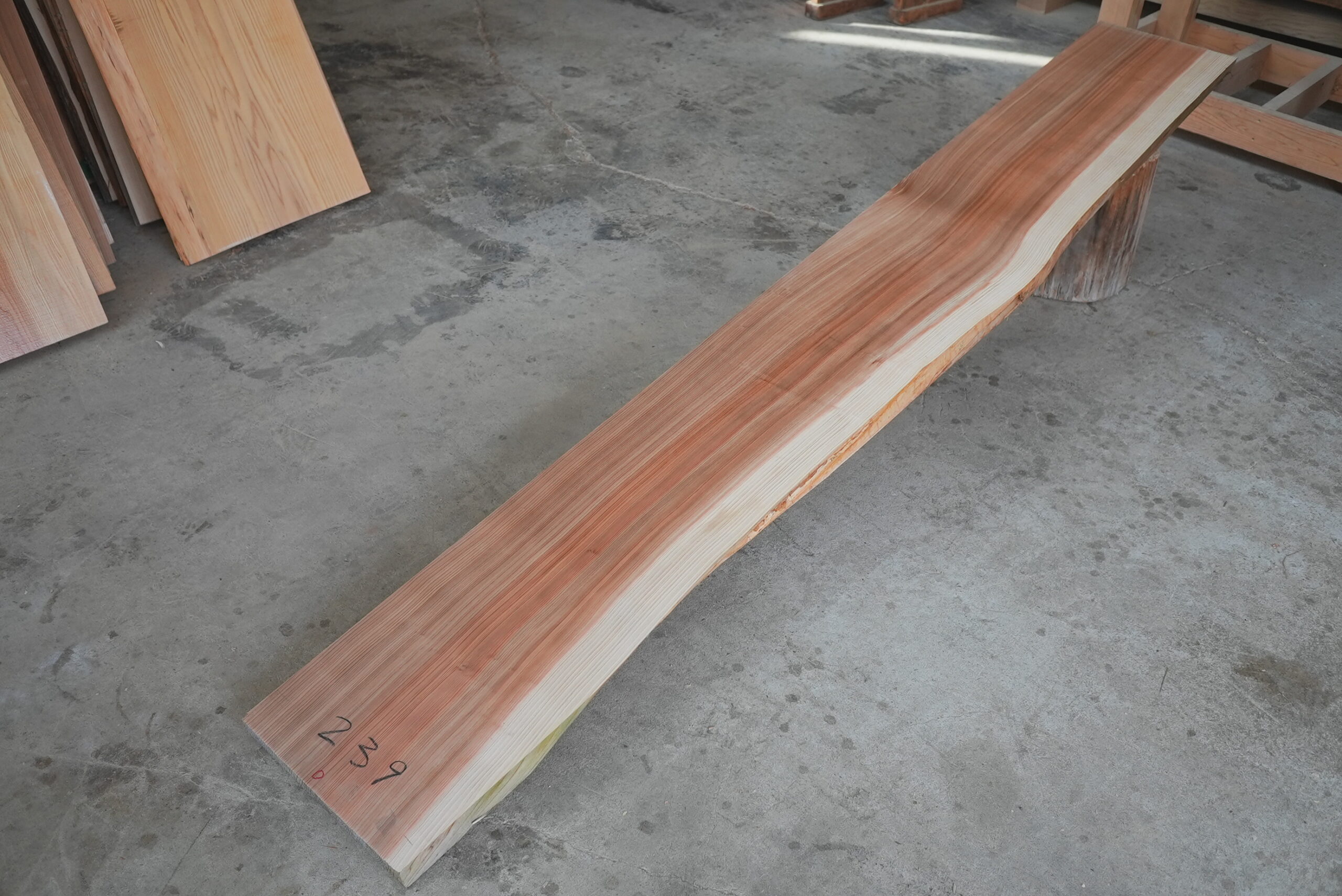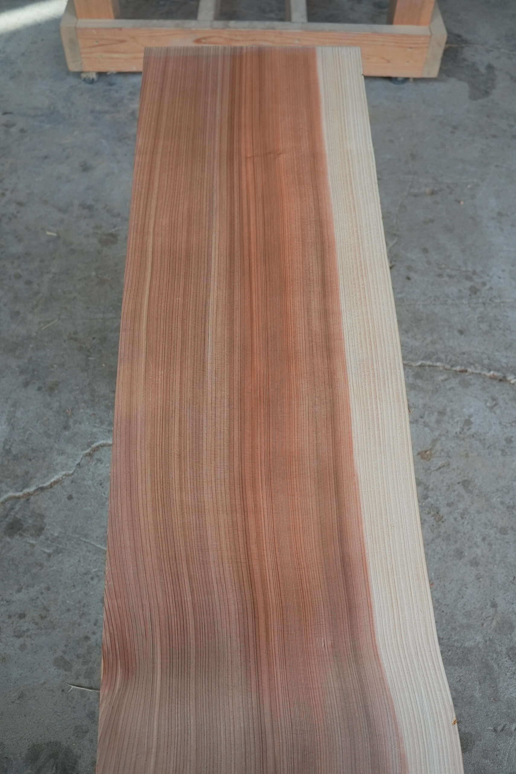 天然杉片耳柾厚板です。右側に耳が付いていて左側はストレートになっています。壁にピッタリ合わせられます。奥行が330㎜~370㎜ありますのでキッチンカウンター等にいかがでしょうか。長さは2450㎜あります。プレーナー掛け、オイル塗装をすると素晴らしくなります。色合いはシックな感じです。