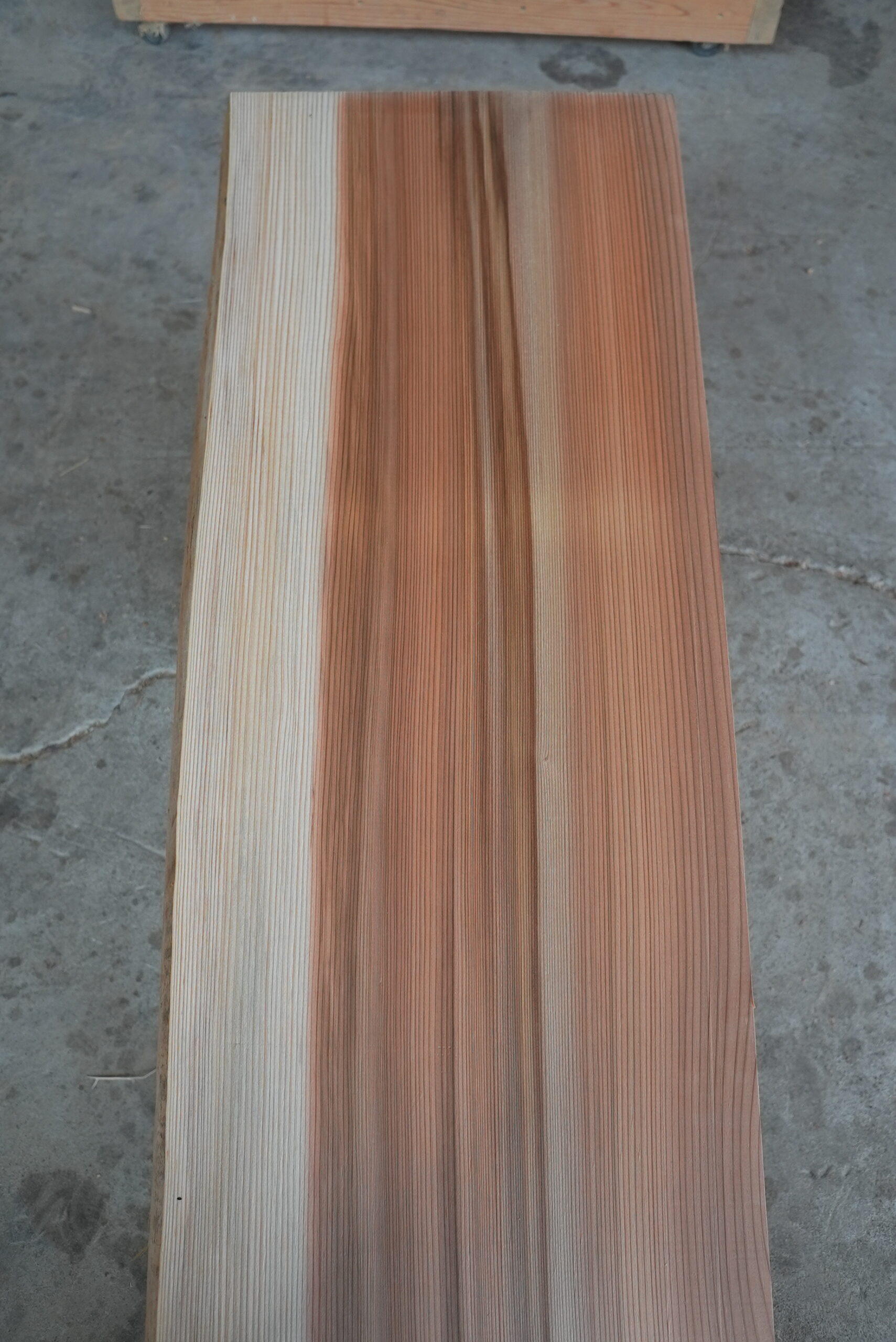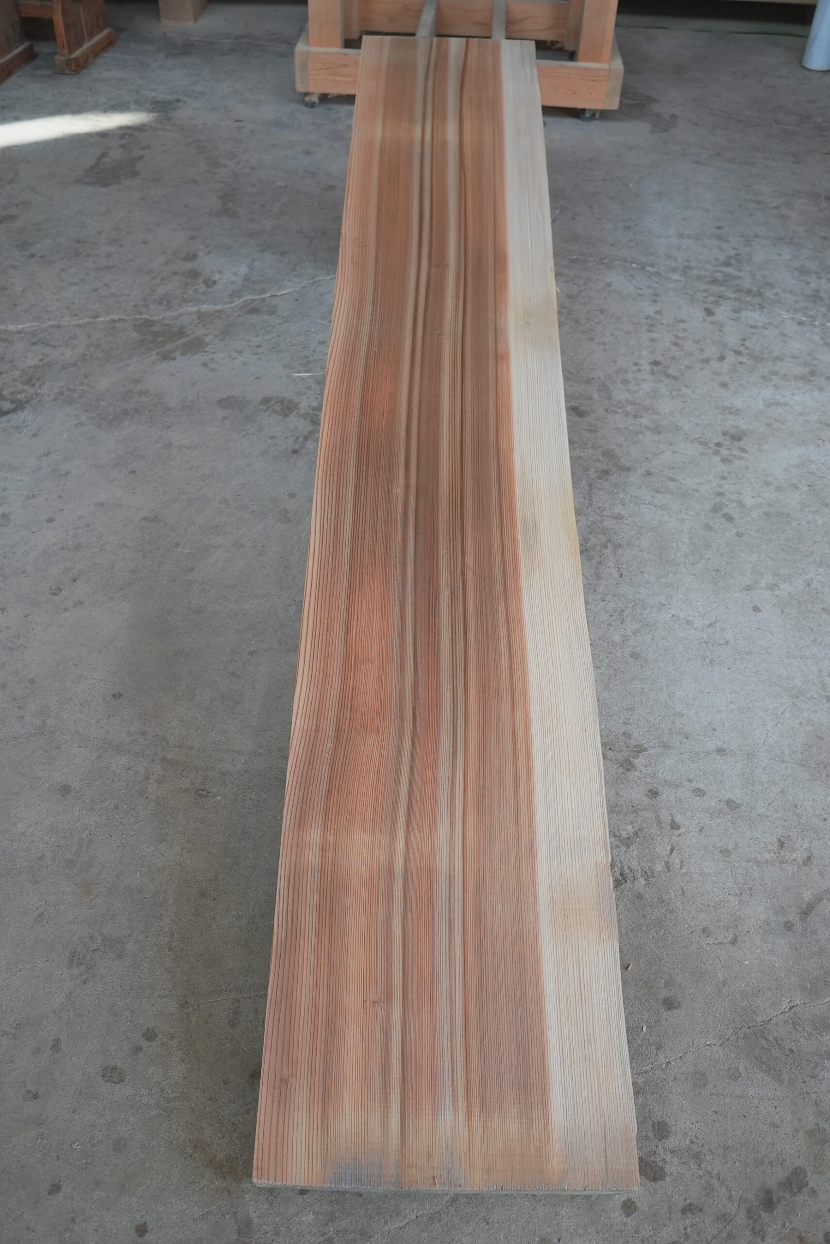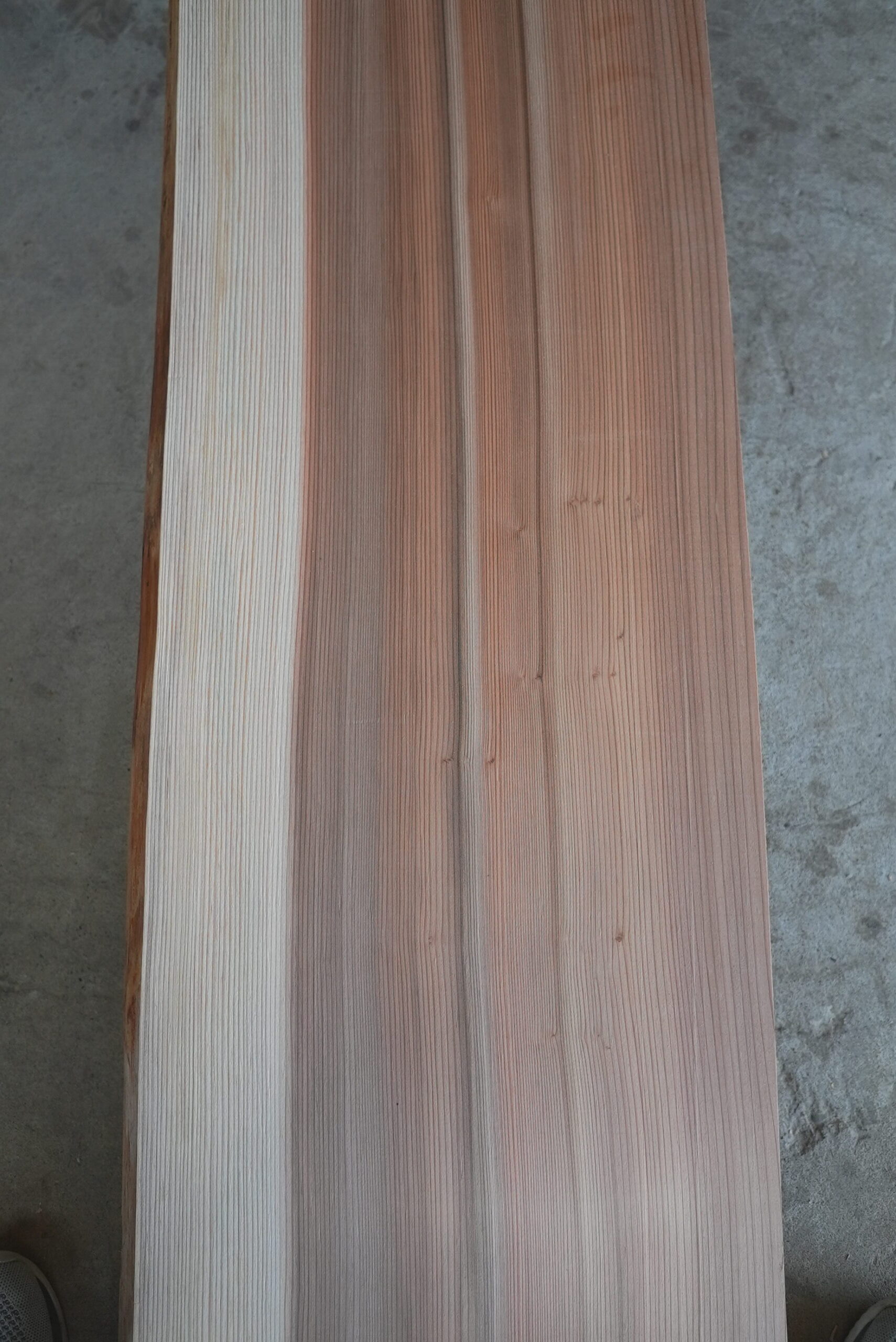 天然杉片耳柾厚板です。これ程柾幅の広い一枚板は幾多に見られません。シックな感じがする一枚板です。プレーナー掛けをすると綺麗になります。耳部分が良い感じです。カウンター材、ベンチ、テレビボード等にいかがでしょうか。