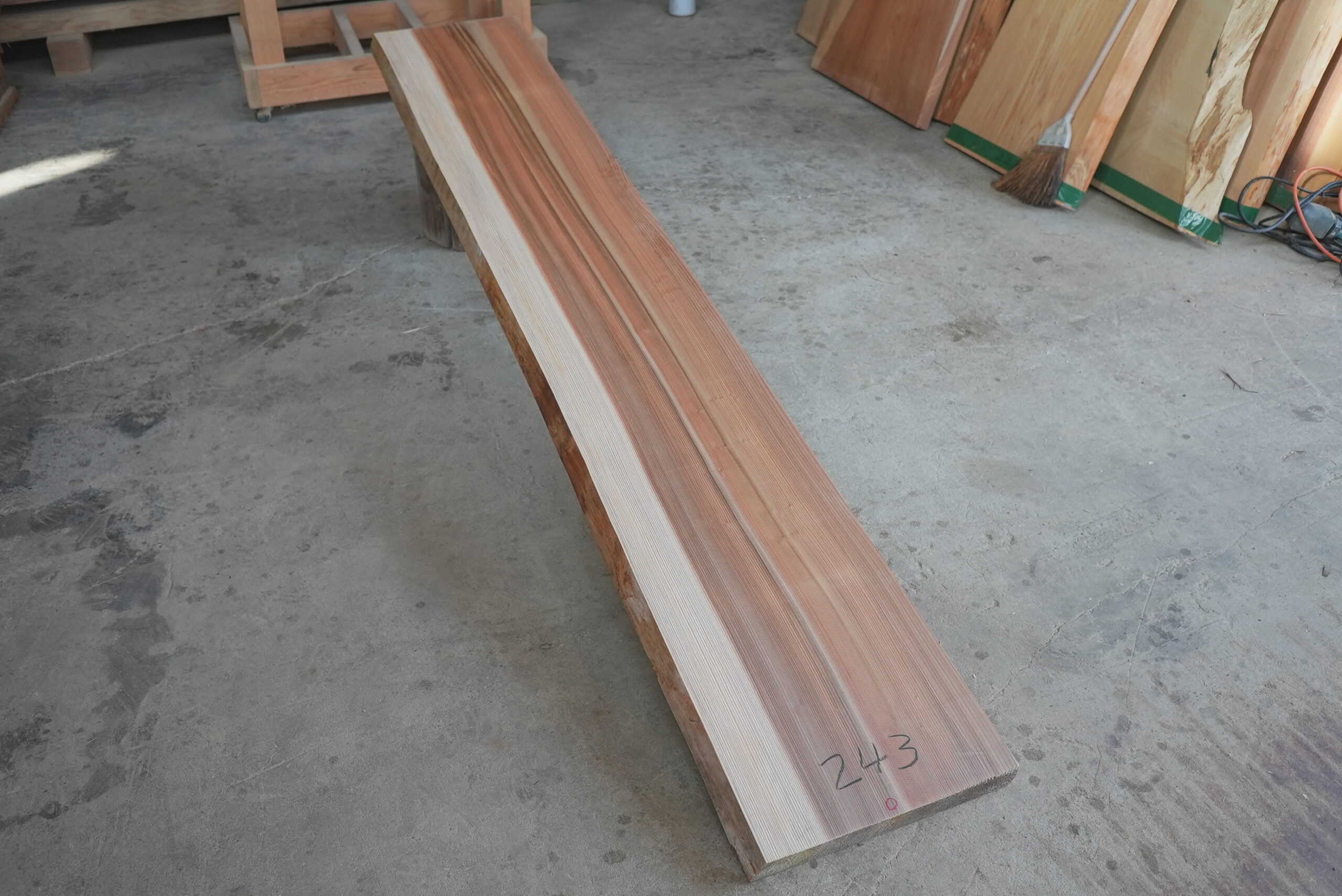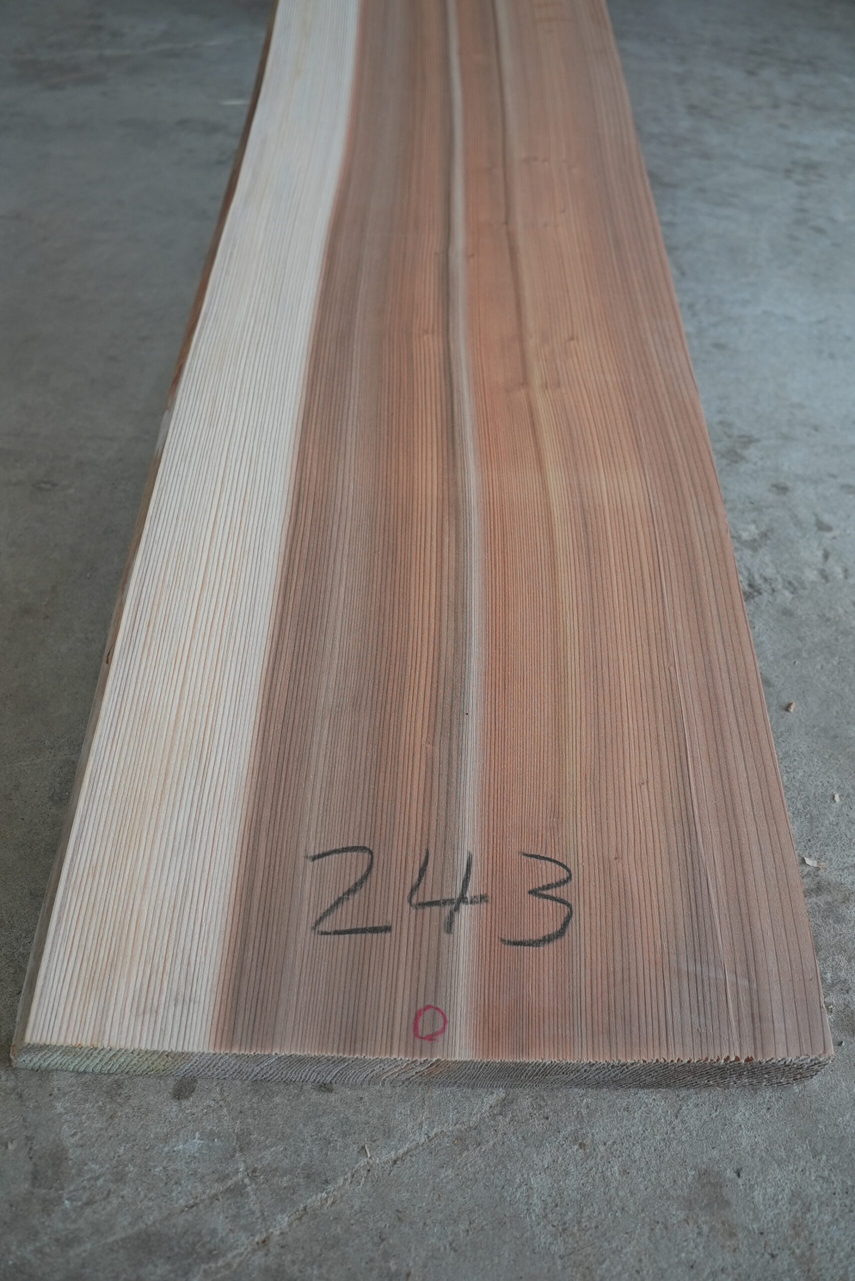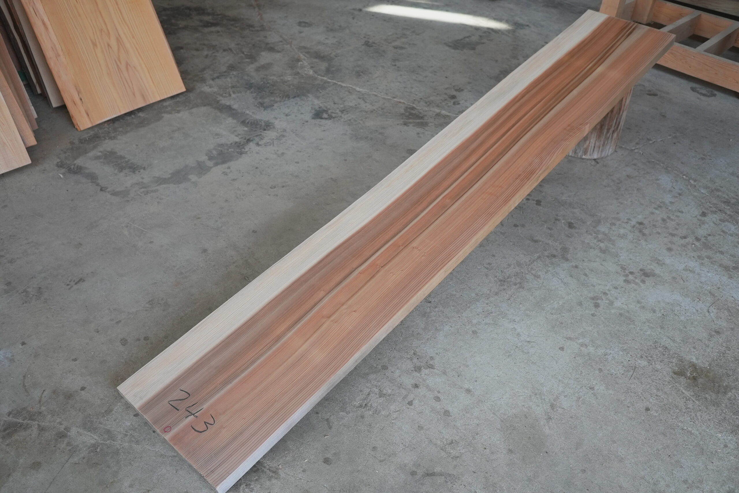 天然杉片耳柾厚板です。これ程柾幅の広い一枚板は幾多に見られません。シックな感じがする一枚板です。プレーナー掛けをすると綺麗になります。耳部分が良い感じです。カウンター材、ベンチ、テレビボード等にいかがでしょうか。