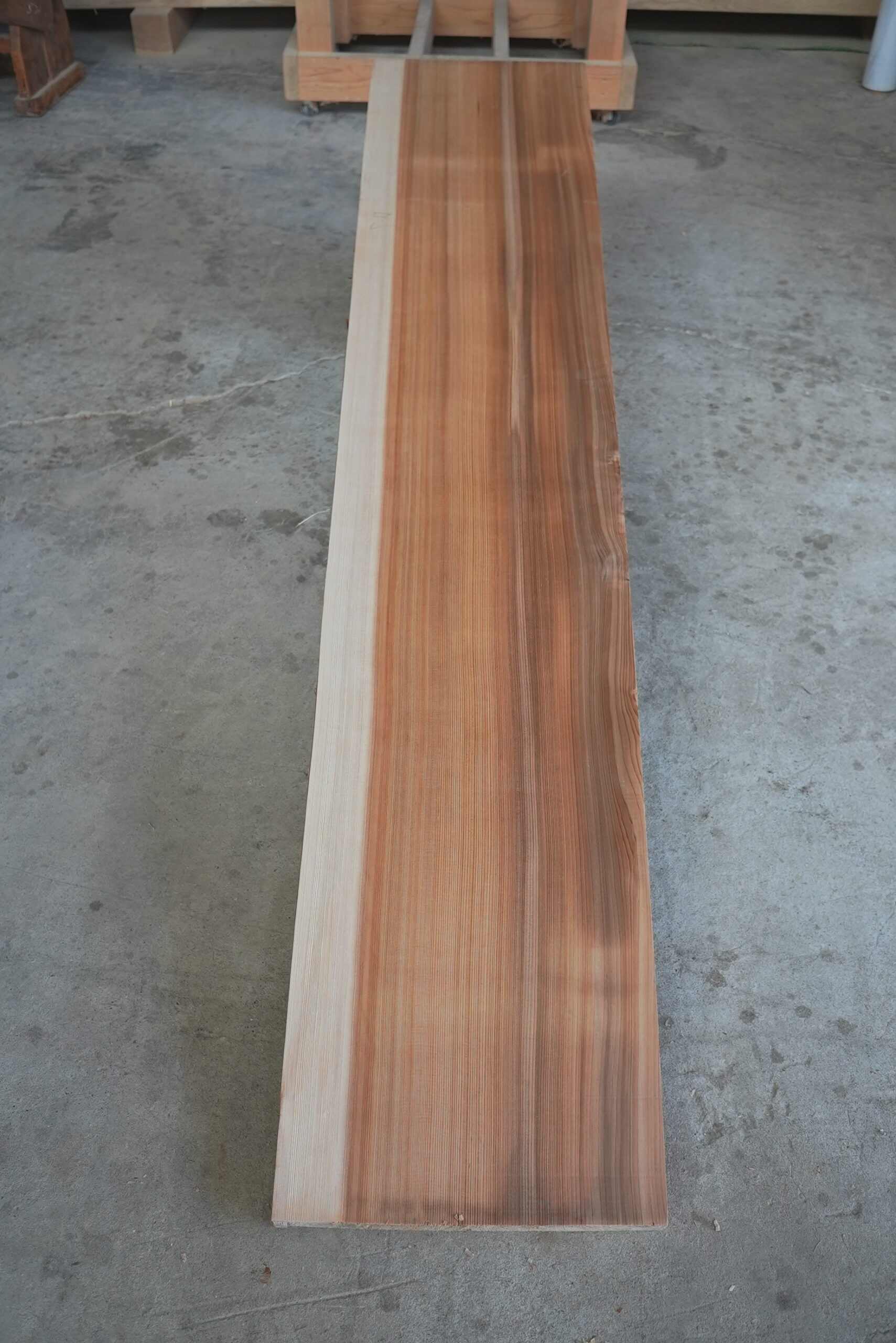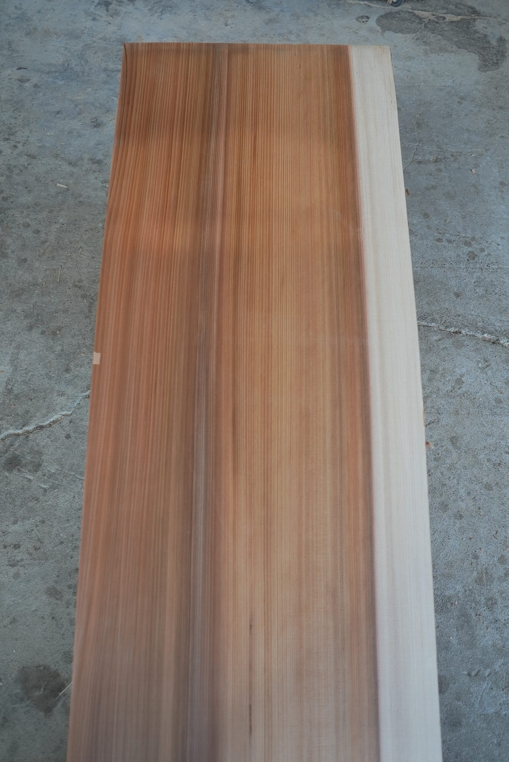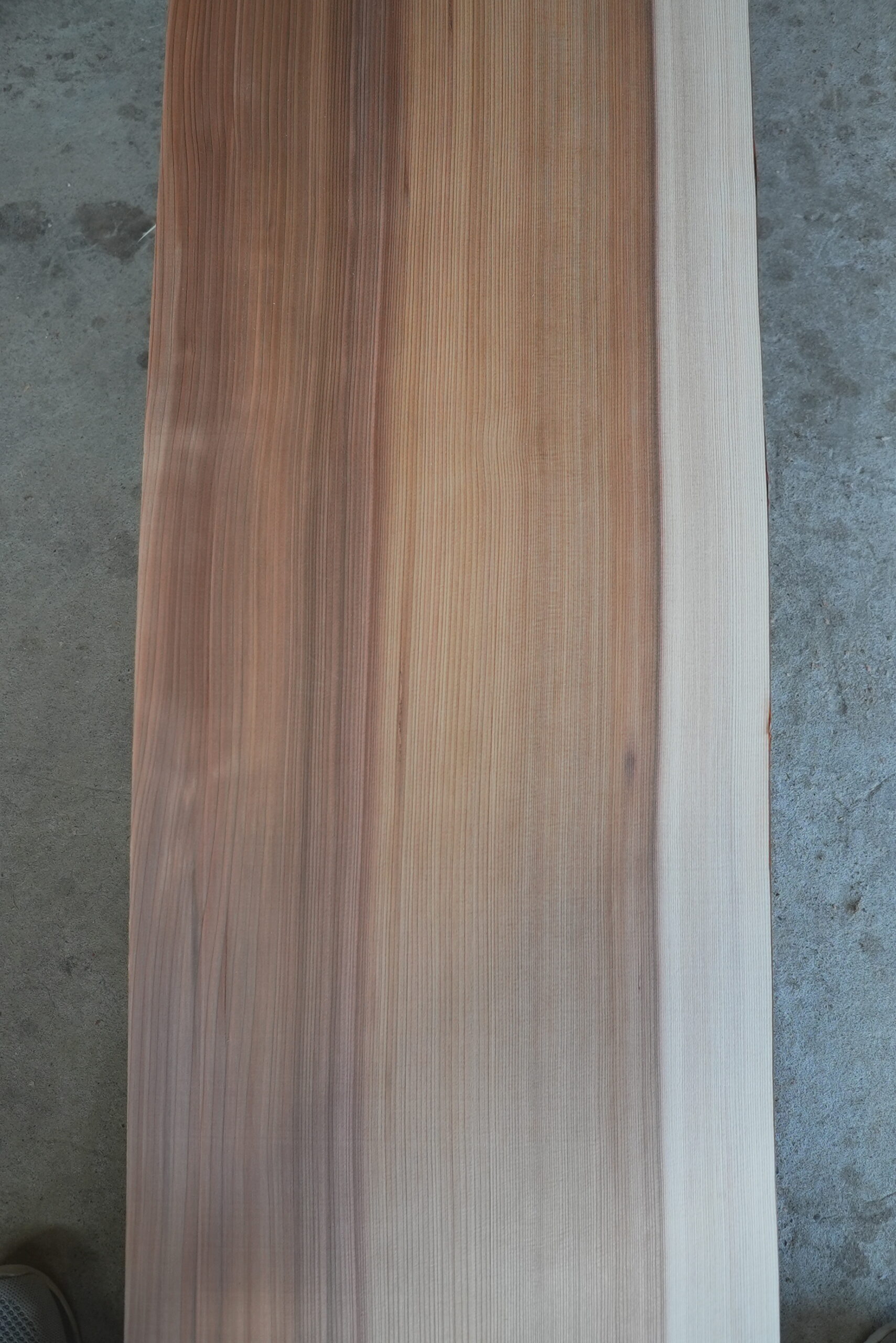 天然杉片耳柾厚板です。これ程柾幅の広い一枚板は幾多に見られません。シックな感じの色合いの一枚板です。インパクトがあります。プレーナー掛け、オイル塗装をすると素晴らしく綺麗になります。カウンター材、ベンチ、テレビボード等にいかがでしょうか。