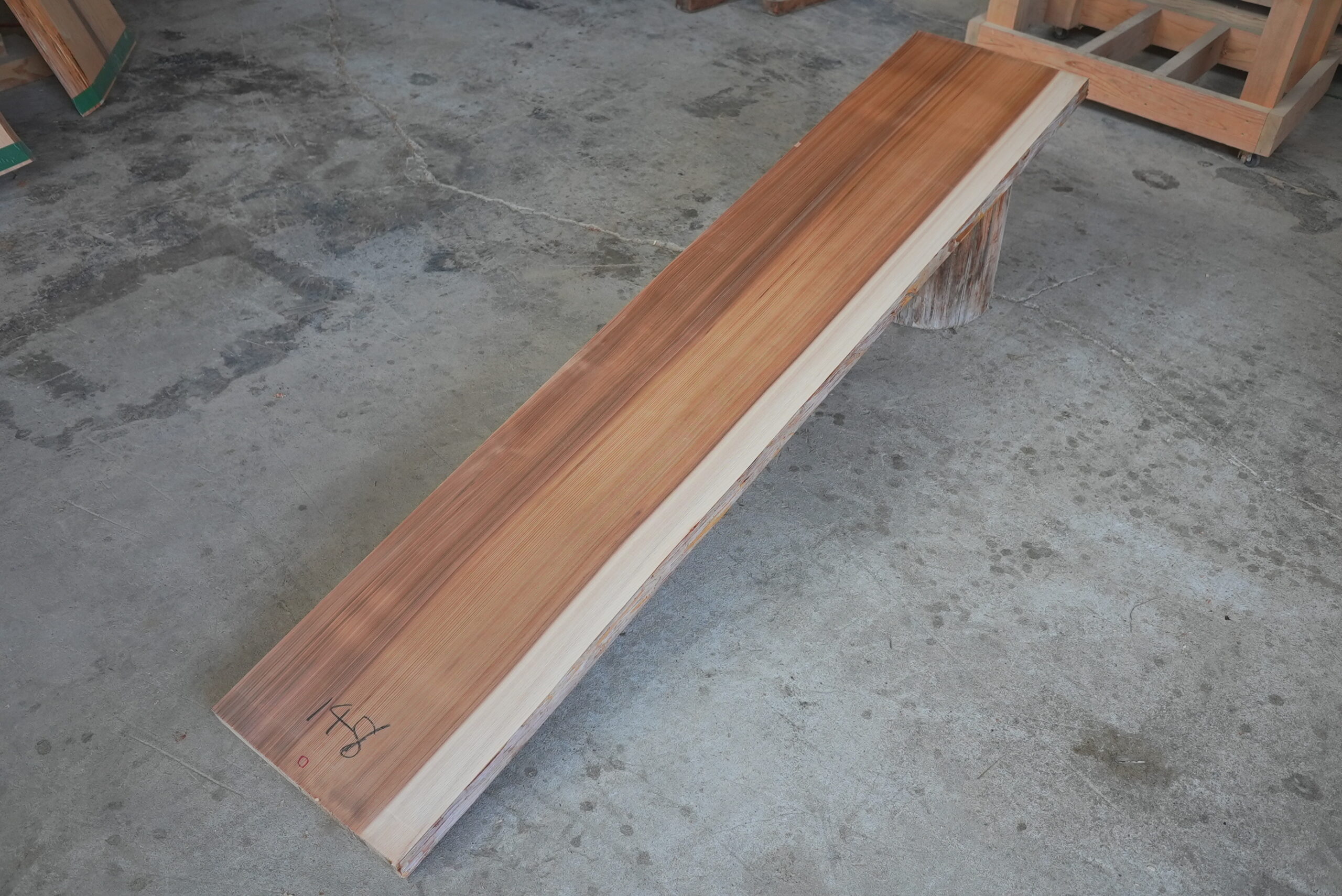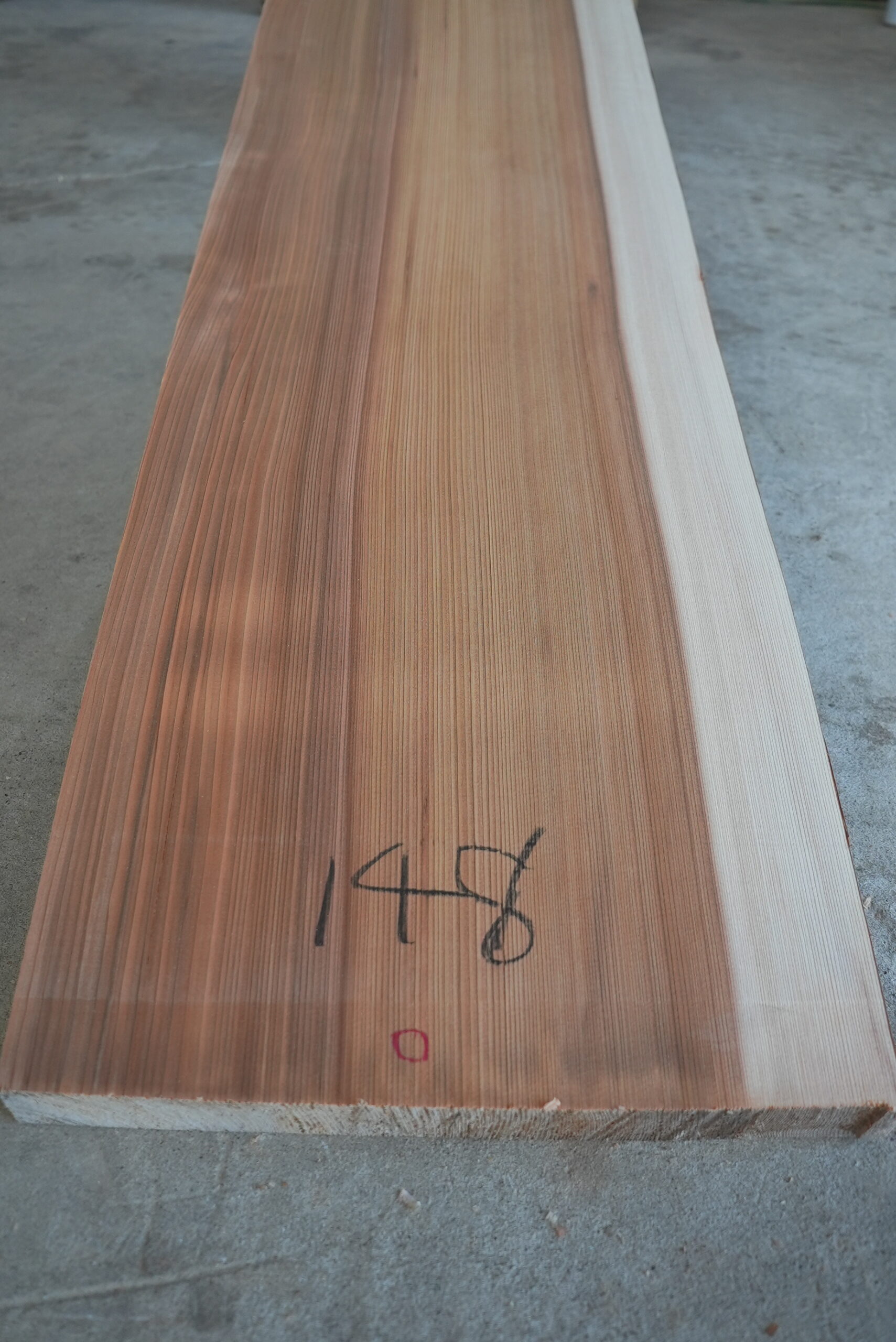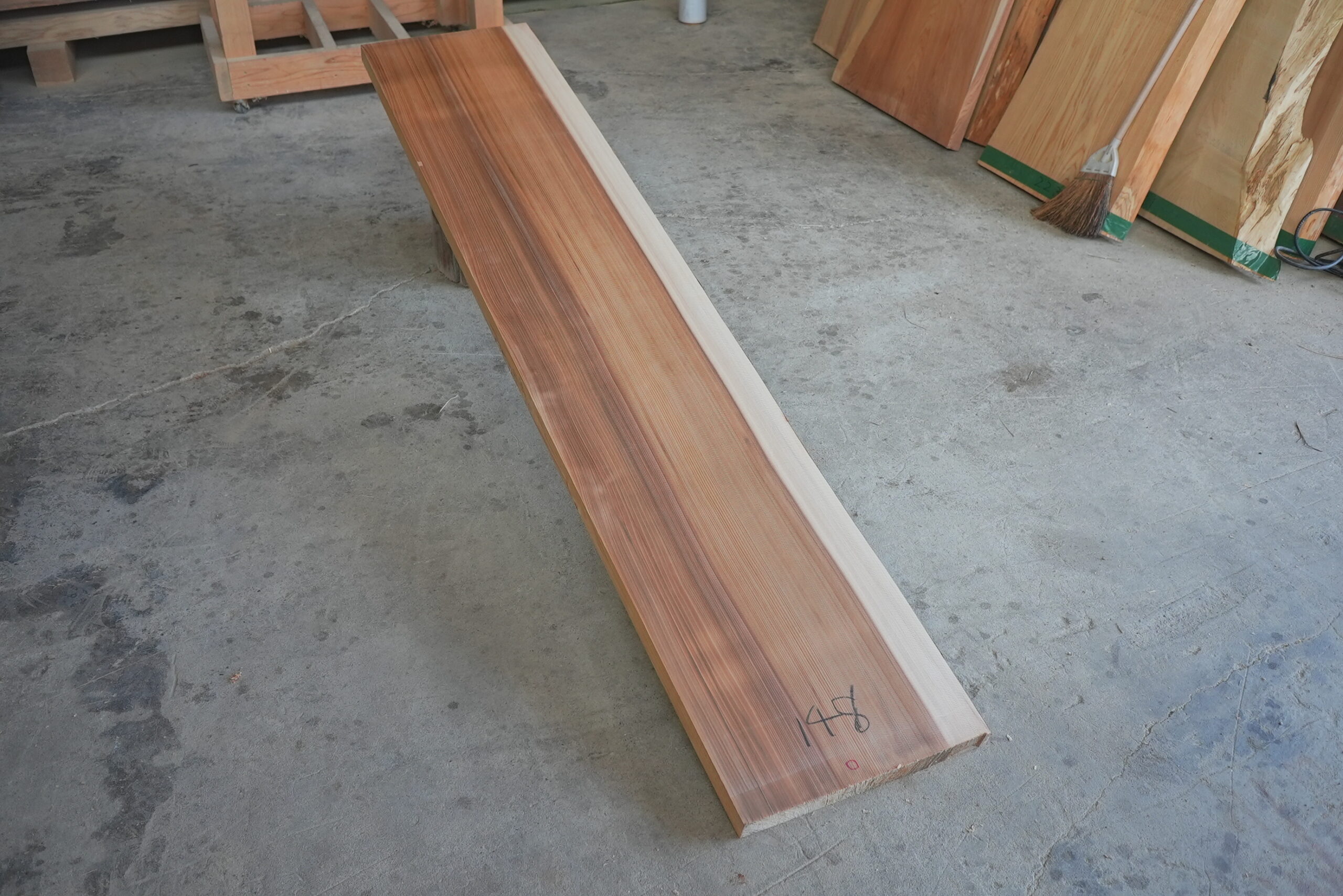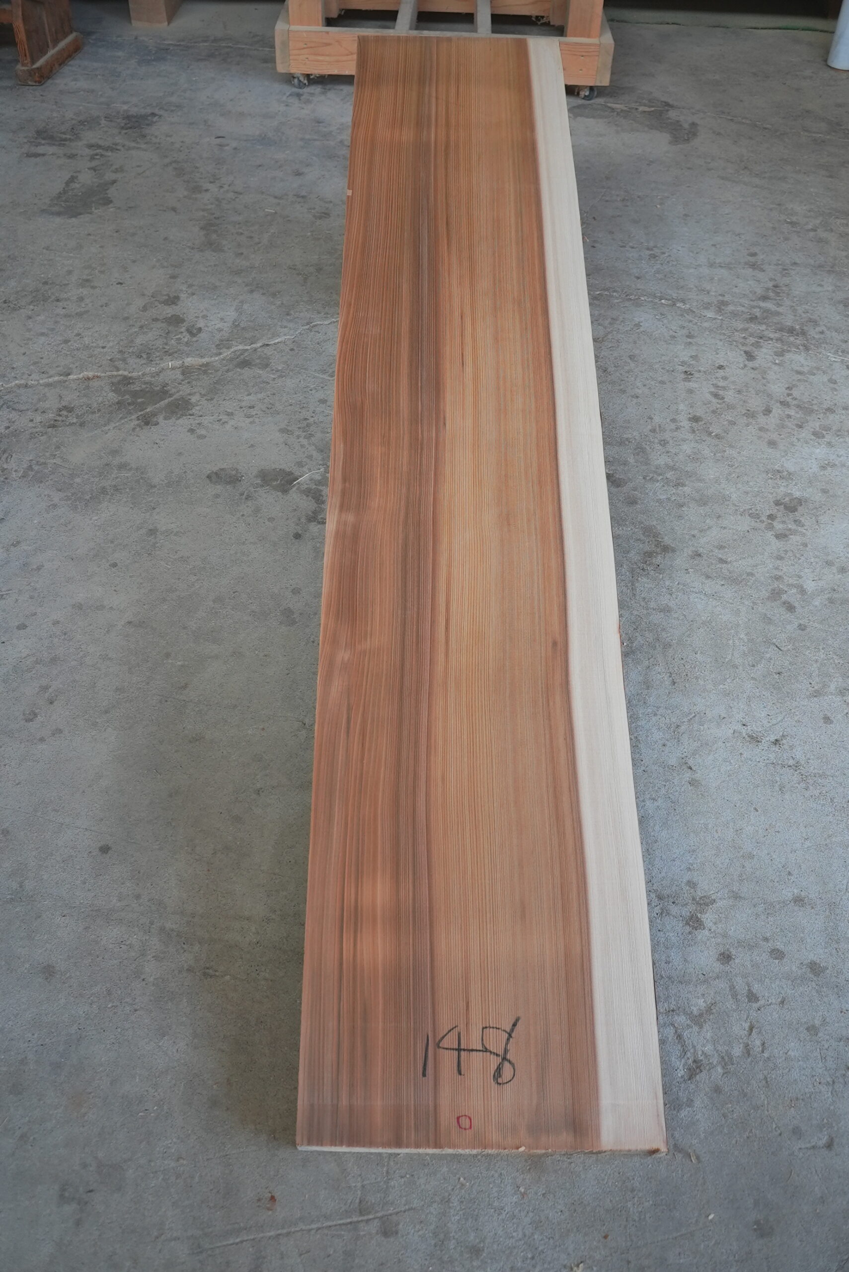 天然杉片耳柾厚板です。これ程柾幅の広い一枚板は幾多に見られません。シックな感じの色合いの一枚板です。インパクトがあります。プレーナー掛け、オイル塗装をすると素晴らしく綺麗になります。カウンター材、ベンチ、テレビボード等にいかがでしょうか。